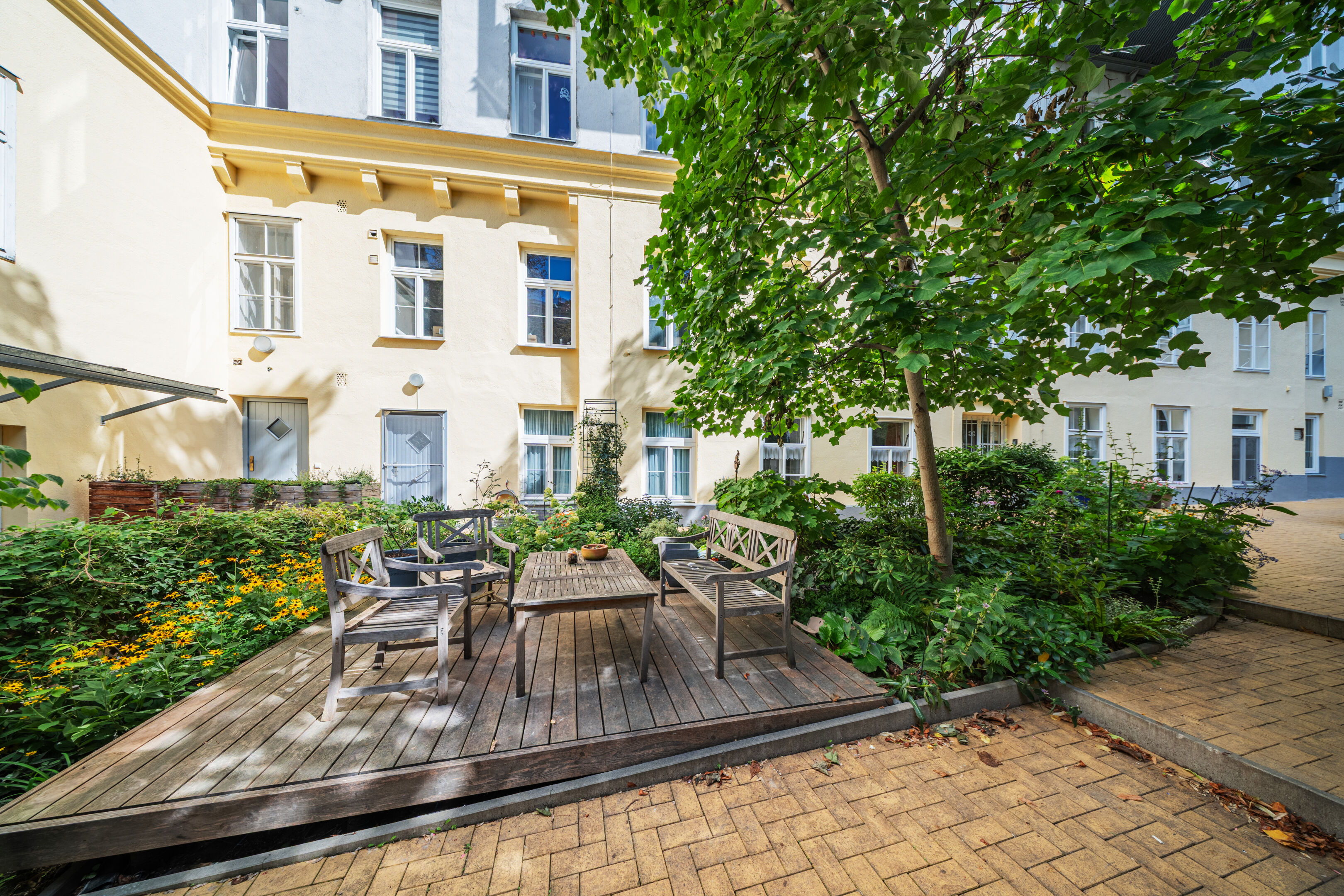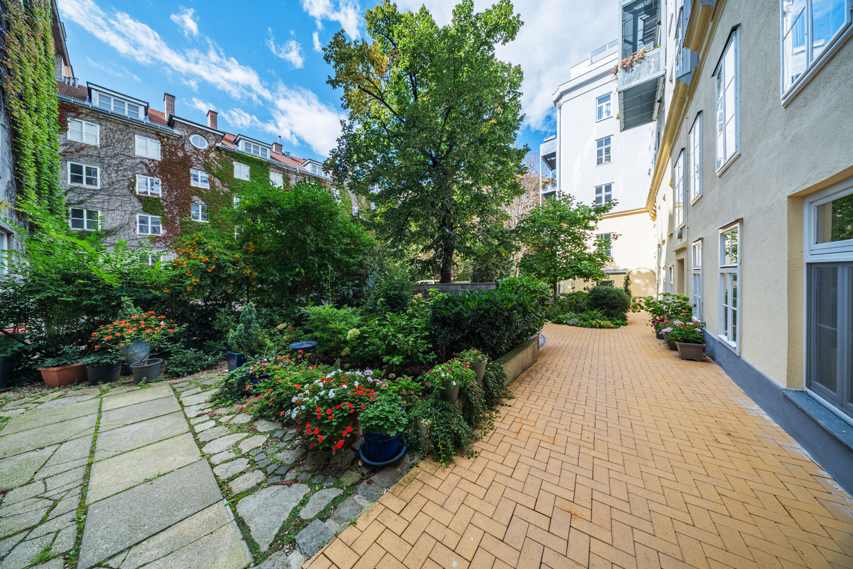 Zum Verkauf stehen mehrere Wohneinheiten zwischen ca. 39 m² und 250 m². Je nach Bedarf bieten diese ein bis vier Zimmer. Viele der Wohnungen verfügen über Balkone, die zum Innenhof ausgerichtet sind und einen herrlichen Blick ins Grüne eröffnen – eine seltene Kombination aus urbanem Leben und entspannter Wohnatmosphäre.