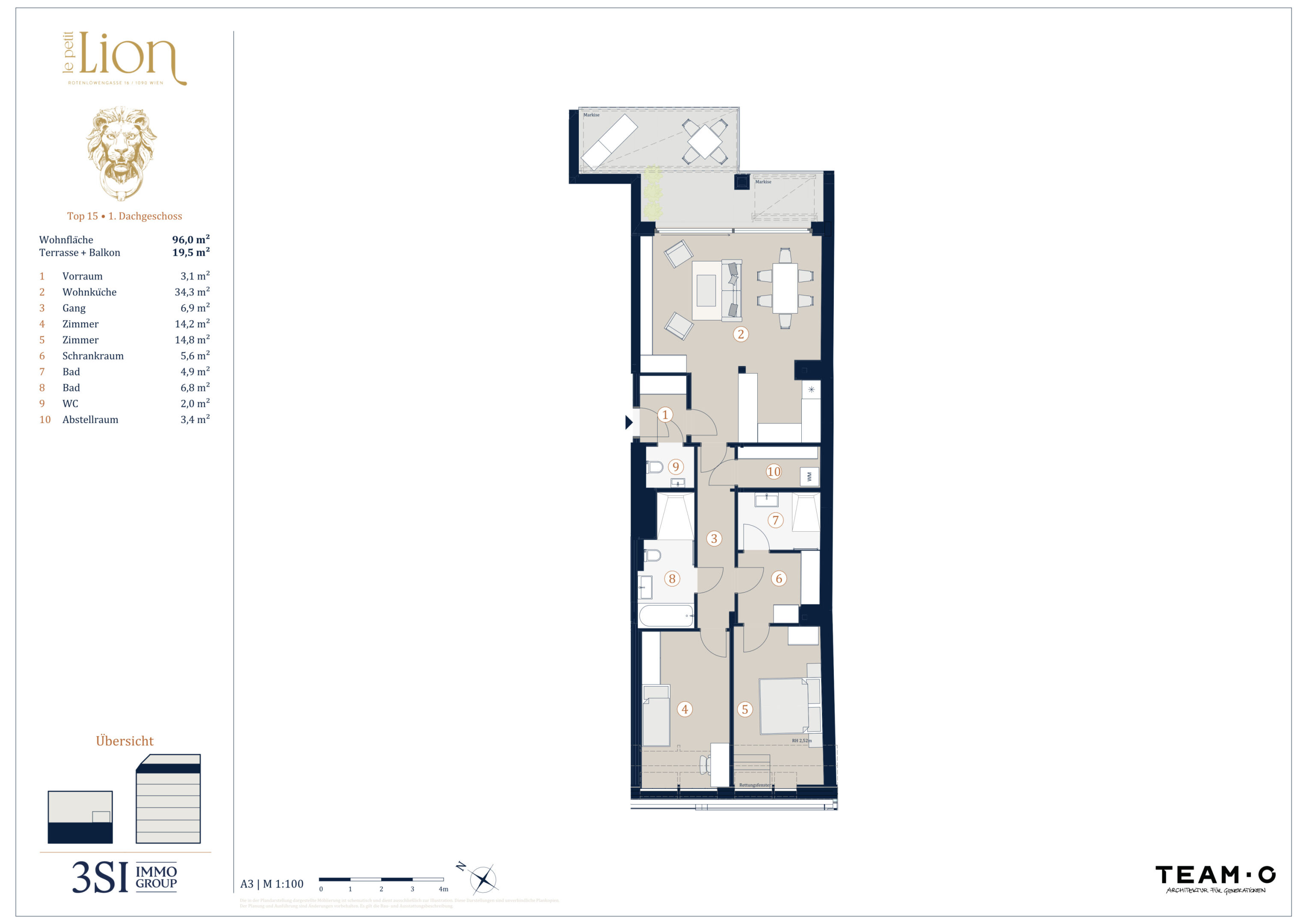 | 15 | 1. Dachgeschoß | 3 | 96,00 m² | 19,50 m² | 19,50 m² | € 1.375.000 | Verfügbar | ||||