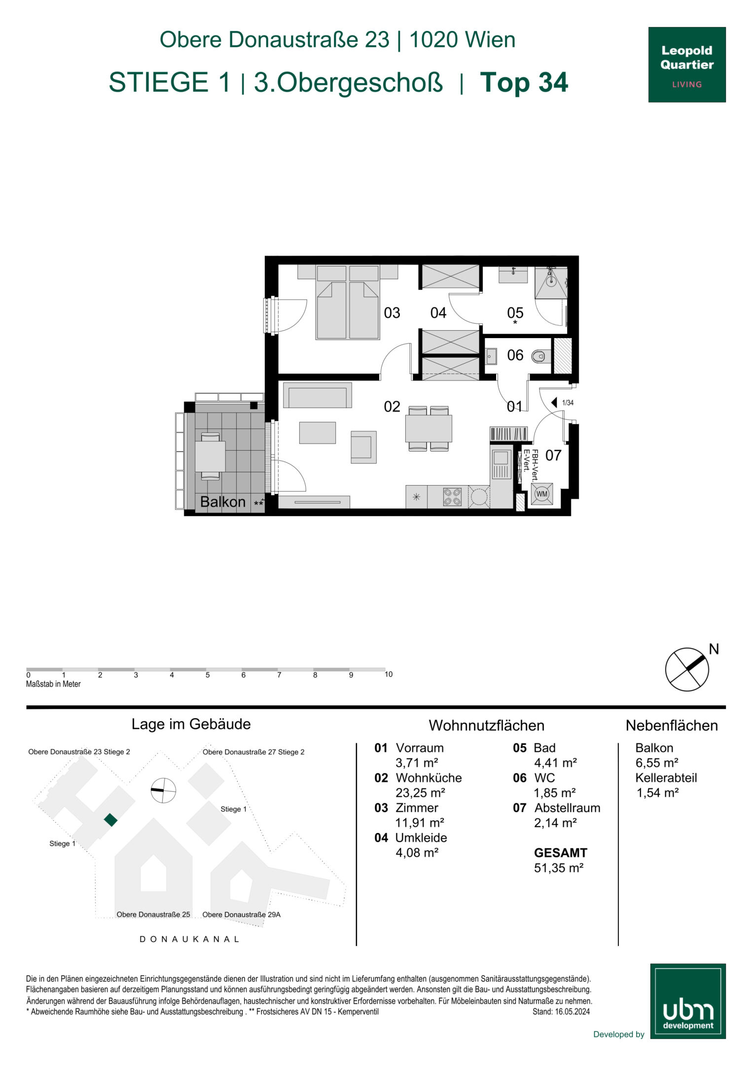Diese moderne Wohnung befindet sich im 3. Obergeschoß. Die Einheit verfügt über eine Wohnnutzfläche von insgesamt 51,35 m² und bietet zusätzlich einen ca.6,55 m² großen Balkon.