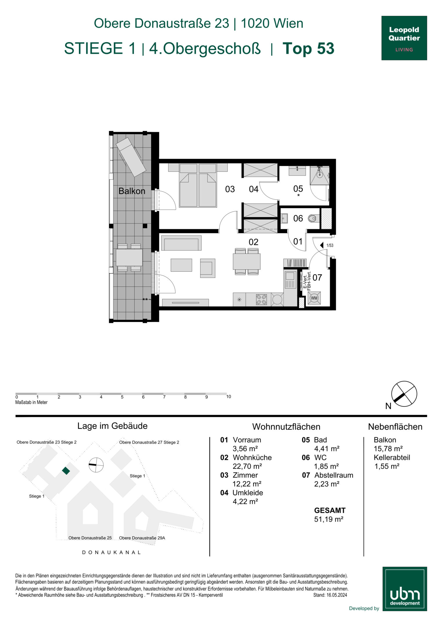 Diese moderne Wohnung befindet sich im 4. Obergeschoß. Die Einheit verfügt über eine Wohnnutzfläche von ca. 51 m² und bietet zusätzlich einen ca. 16 m² großen Balkon.