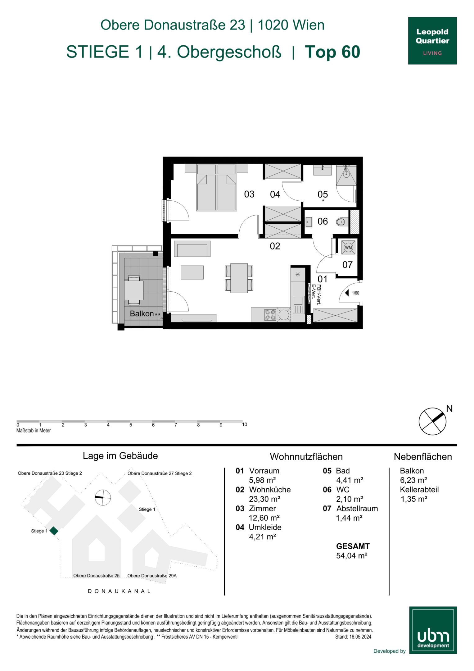 Diese moderne Wohnung befindet sich im 4. Obergeschoß. Die Einheit verfügt über eine Wohnnutzfläche von insgesamt 54,04 m² und bietet zusätzlich einen ca.6,23 m² großen Balkon.