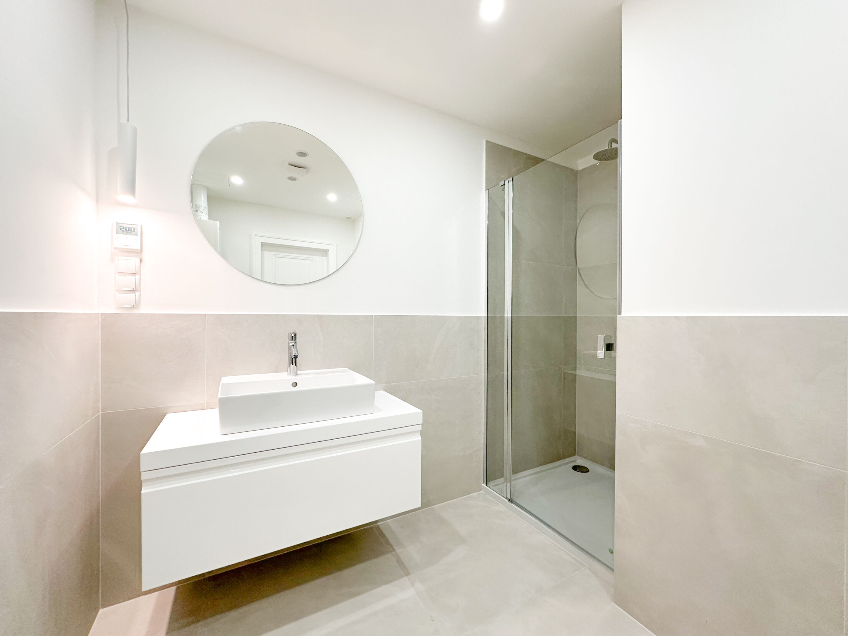 - Badezimmer mit Dusche und Waschmaschinenanschluss