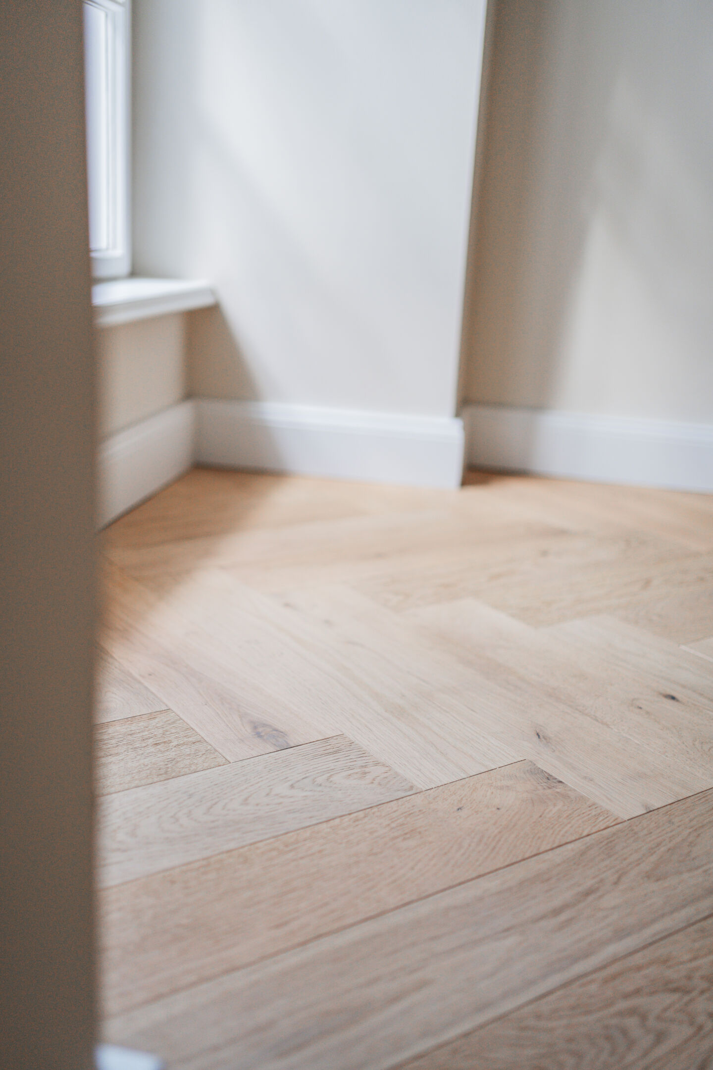 - Fischgrätparkett in Eiche, lebhaft astig, gebürstet, weiß geölt