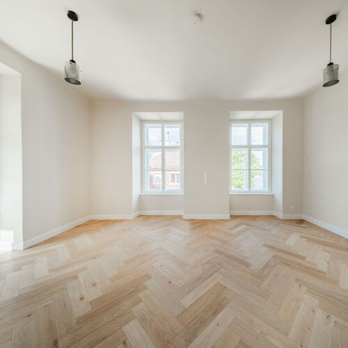 - Edler Fischgrätparkett in Eiche, lebhaft astig, gebürstet und weiß geölt