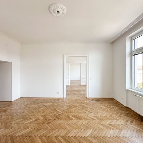 Die charakteristischen Elemente der Jahrhundertwende-Architektur – hohe Räume, Fischgrätparkett, Flügeltüren – sind teilweise erhalten und unterstreichen den einzigartigen Stil des Hauses.
