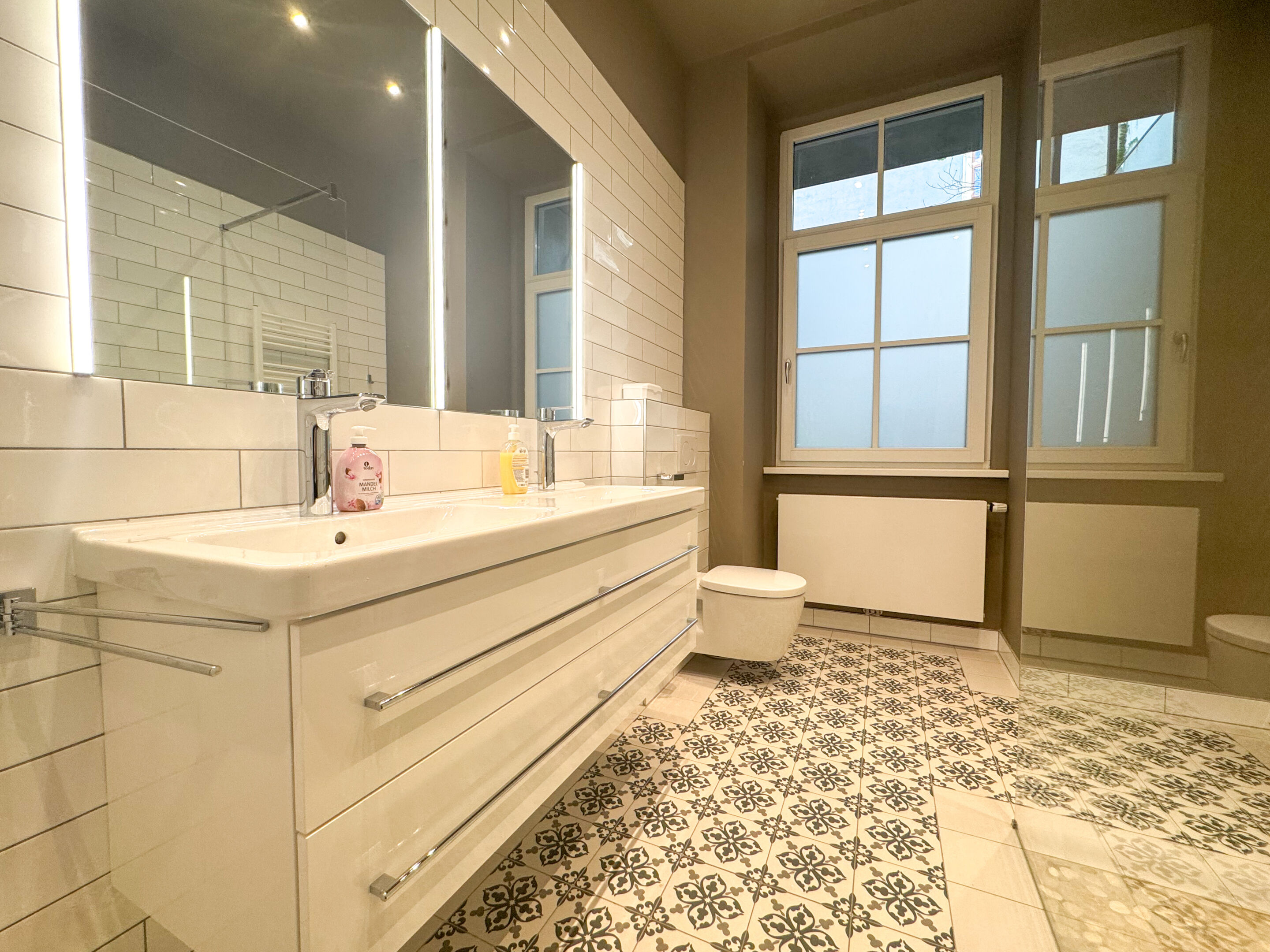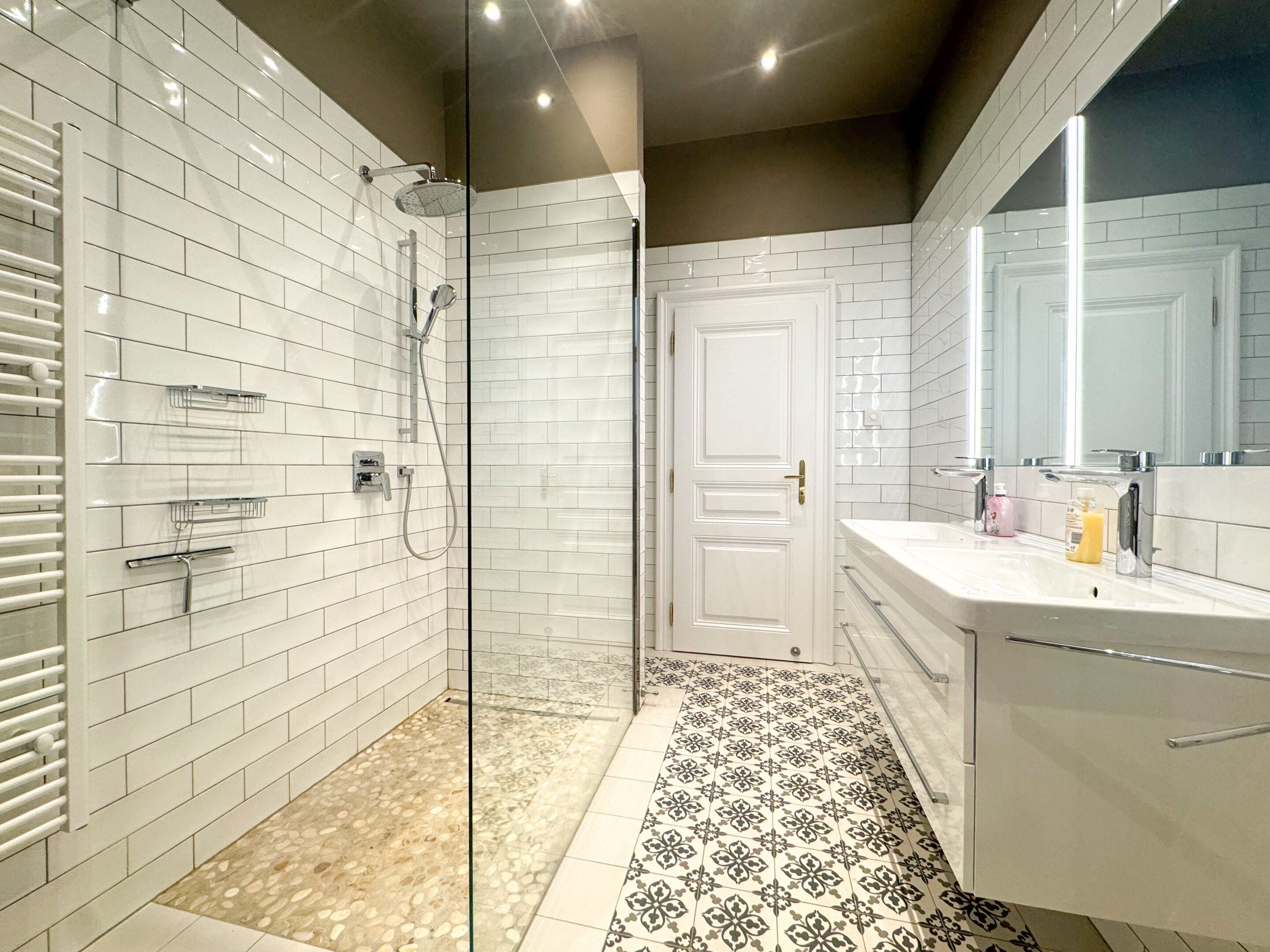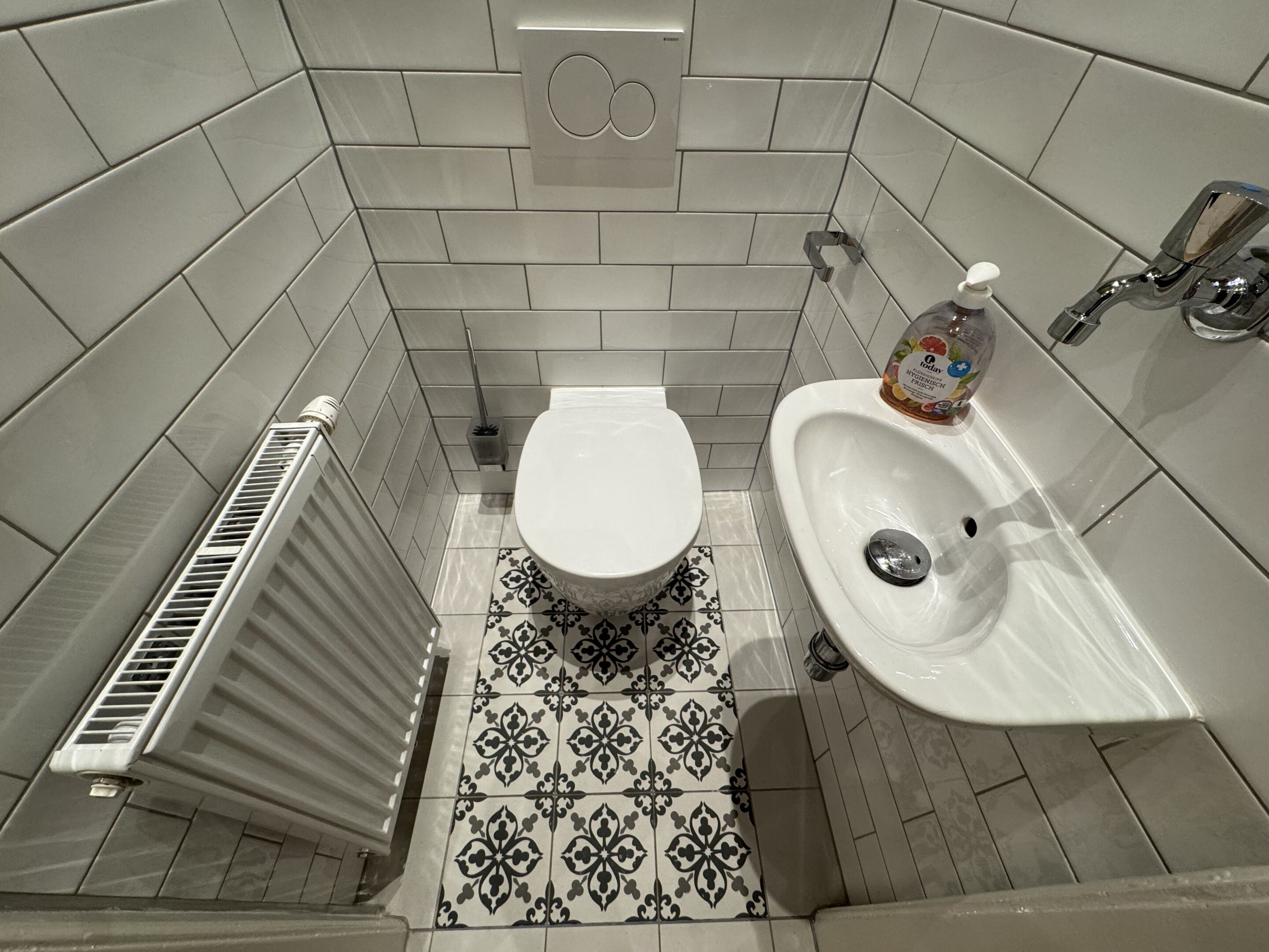 Das stilvolle Badezimmer überzeugt mit Fußbodenheizung, eleganten Fliesen und modernen Armaturen. Ein separates Gäste-WC sorgt für zusätzlichen Komfort.