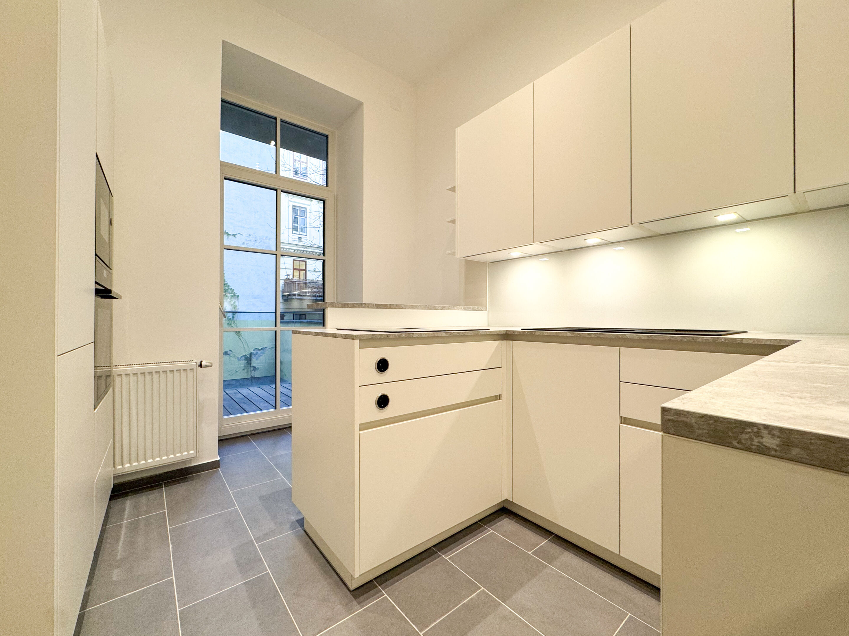 Die neue Einbauküche von DAN ist hochwertig ausgestattet und lässt keine Wünsche offen: Induktionsherd, Backofen, Kühlschrank, Mikrowelle und großzügige Stauraum-Lösungen machen sie zum Herzstück der Wohnung.