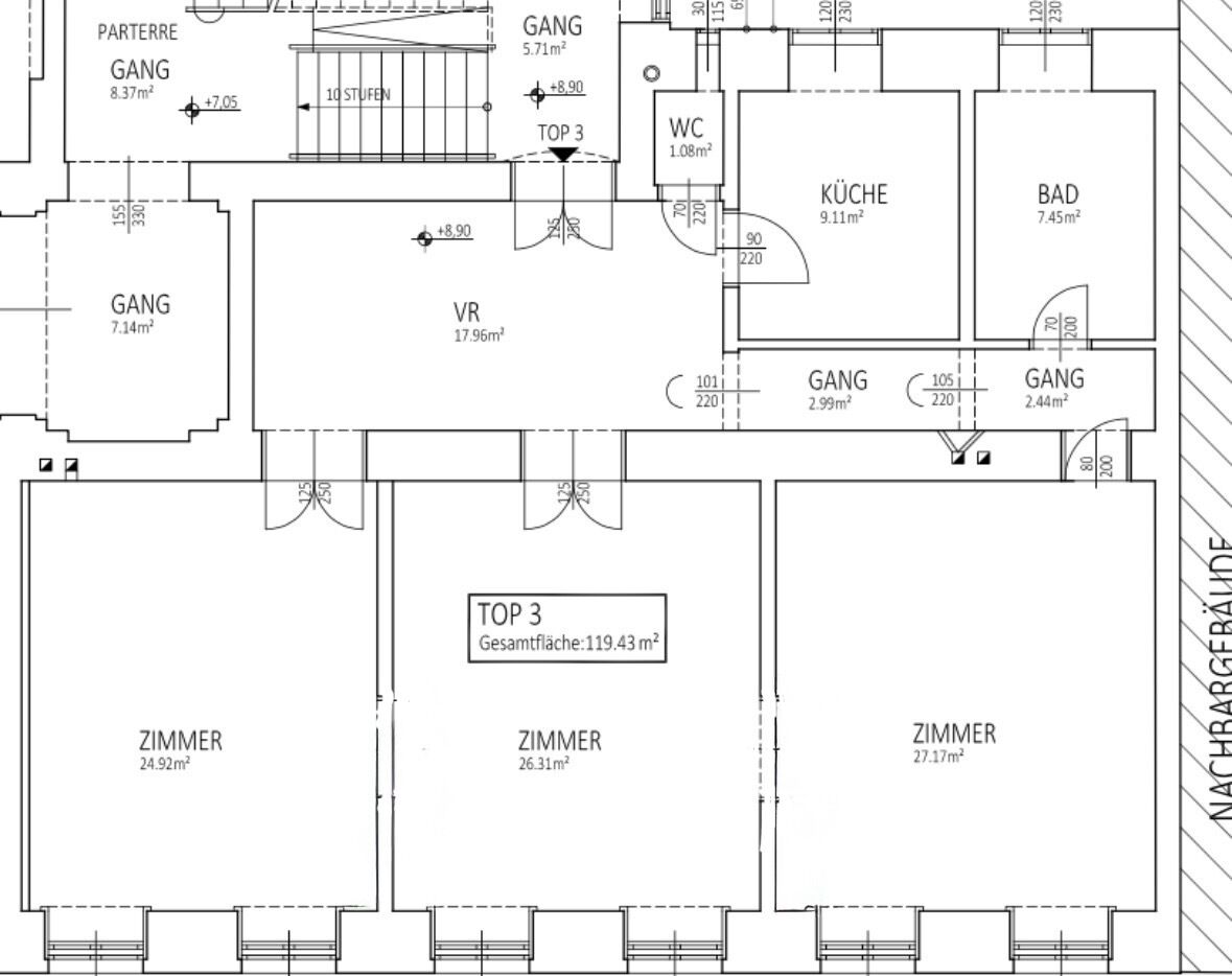 Der großzügige Grundriss mit drei hellen, gut geschnittenen Zimmern schafft ein angenehmes Wohnambiente. Alle Räume sind durchdacht gestaltet und bieten vielfältige Nutzungsmöglichkeiten – ob als Wohn-, Schlaf- oder Arbeitsbereich.