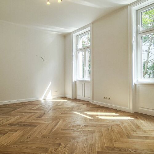 Der stilvolle Eichen-Parkettboden in Fischgrätverlegung sorgt für ein edles Wohnambiente. Große Fensterflächen lassen viel Tageslicht in den Wohnraum. Die Raumhöhe, elegante Türen und hochwertige Materialien verleihen der Wohnung einen exklusiven Charakter. Das Badezimmer mit Dusche ist modern verfliest, mit Handtuchheizkörper und Glasduschkabine ausgestattet. Das separate WC mit Handwaschbecken ist ebenso elegant wie funktional gestaltet. Der Wohn- und Schlafbereich ist offen und flexibel nutzbar – mit vorbereiteten Anschlüssen für eine Küchenzeile.