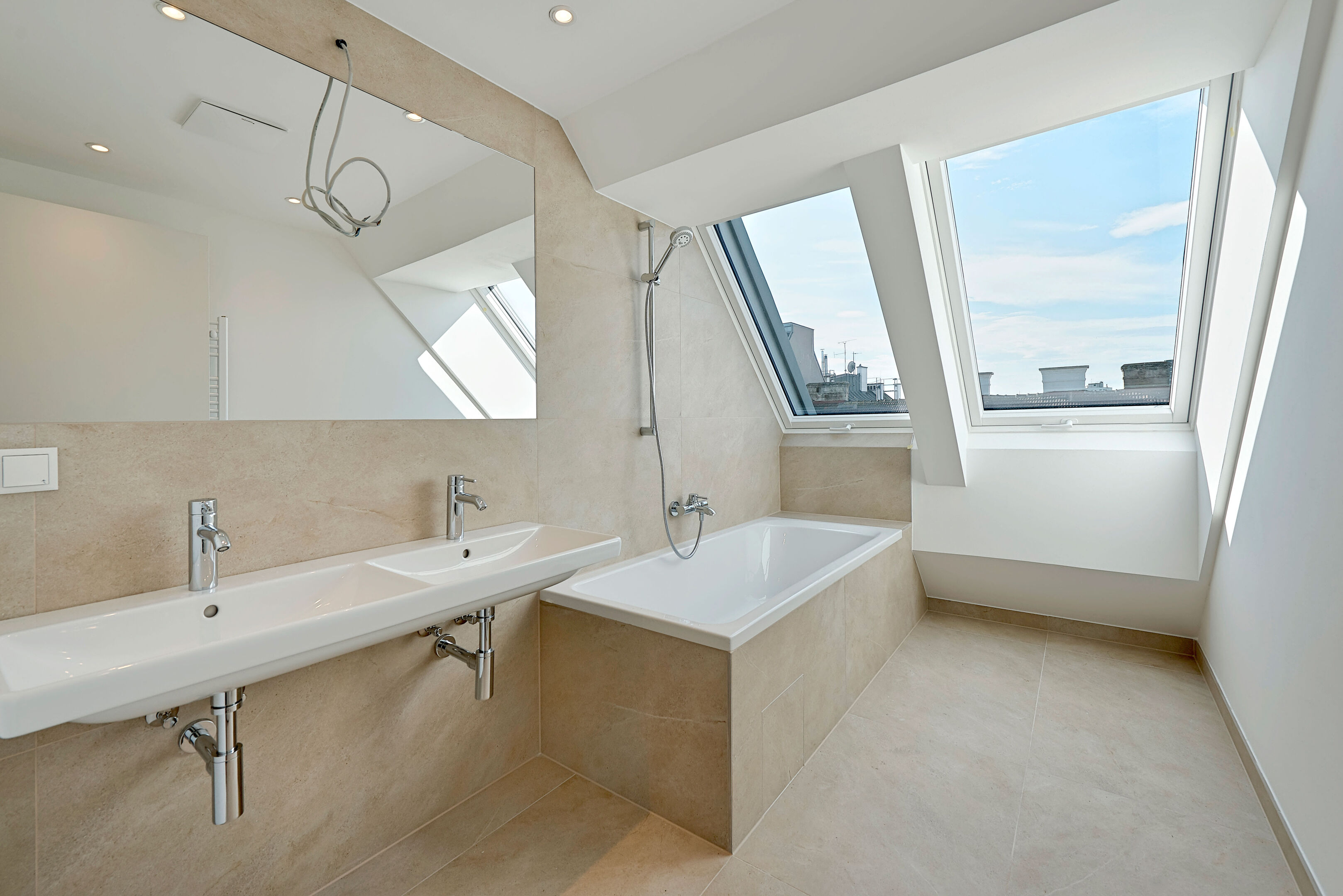- Badezimmer (ca. 8 m²) mit Badewanne und zwei Handwaschbecken