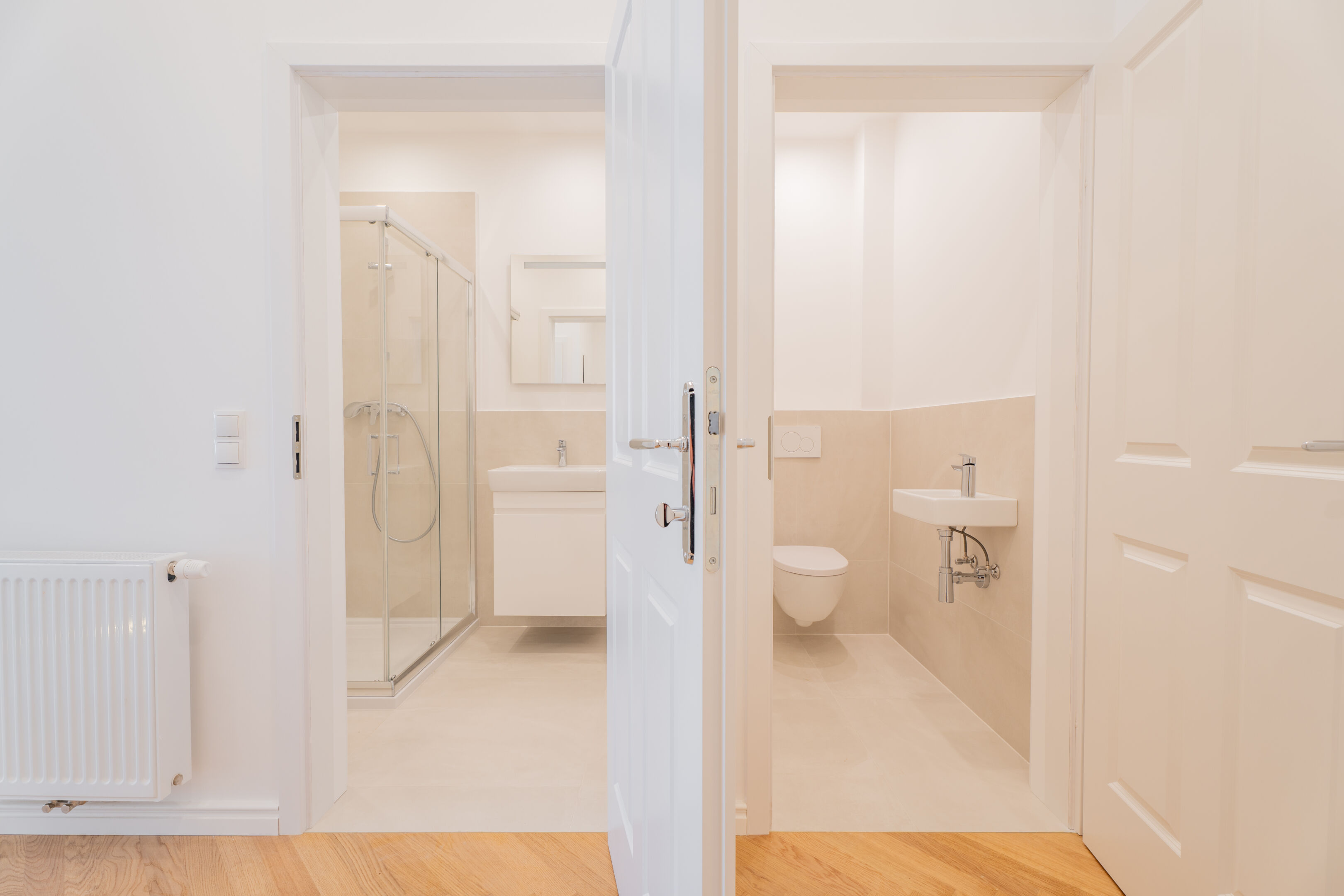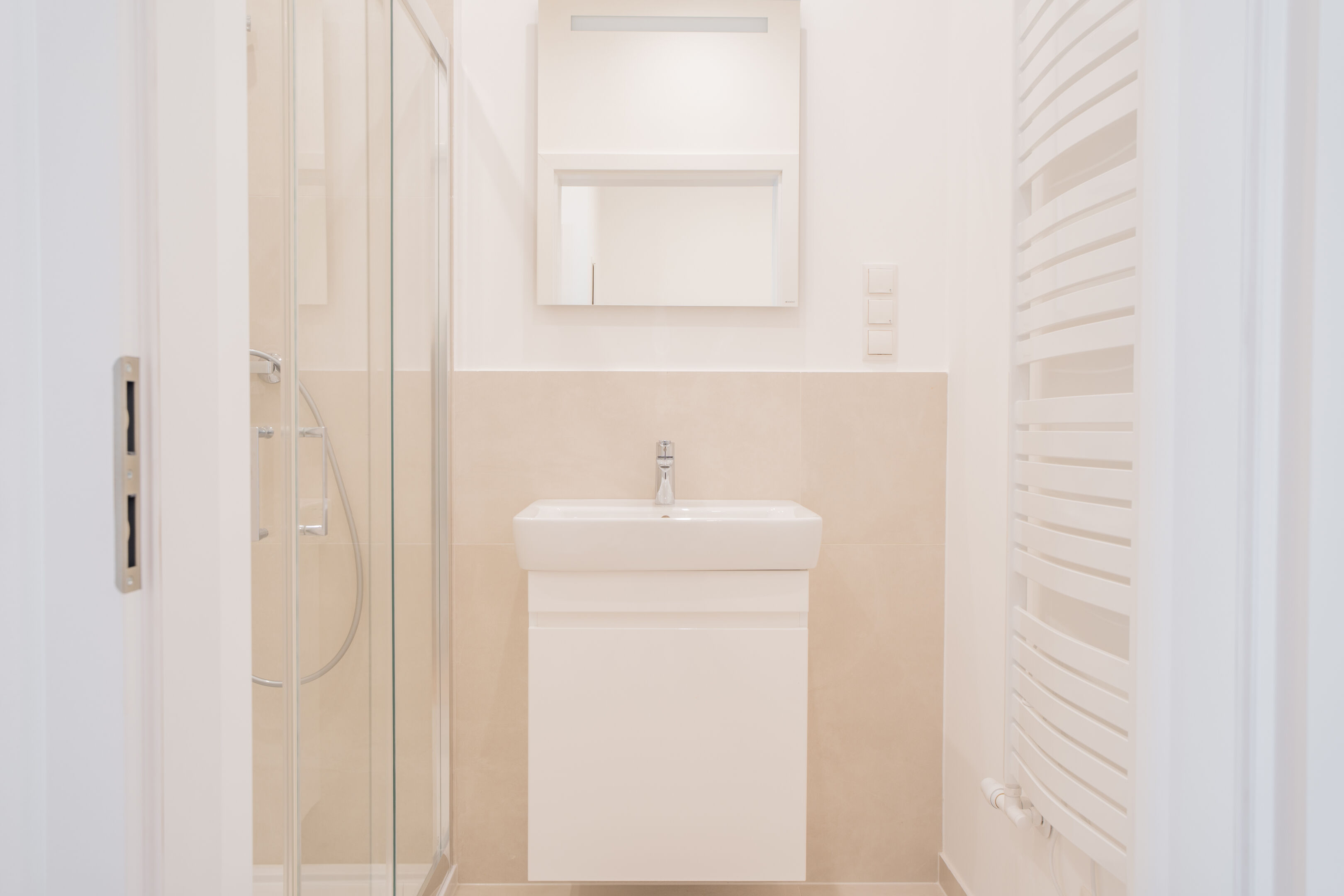 - Badezimmer – mit Dusche, Lichtspiegel, Waschtisch und Handtuchheizkörper
