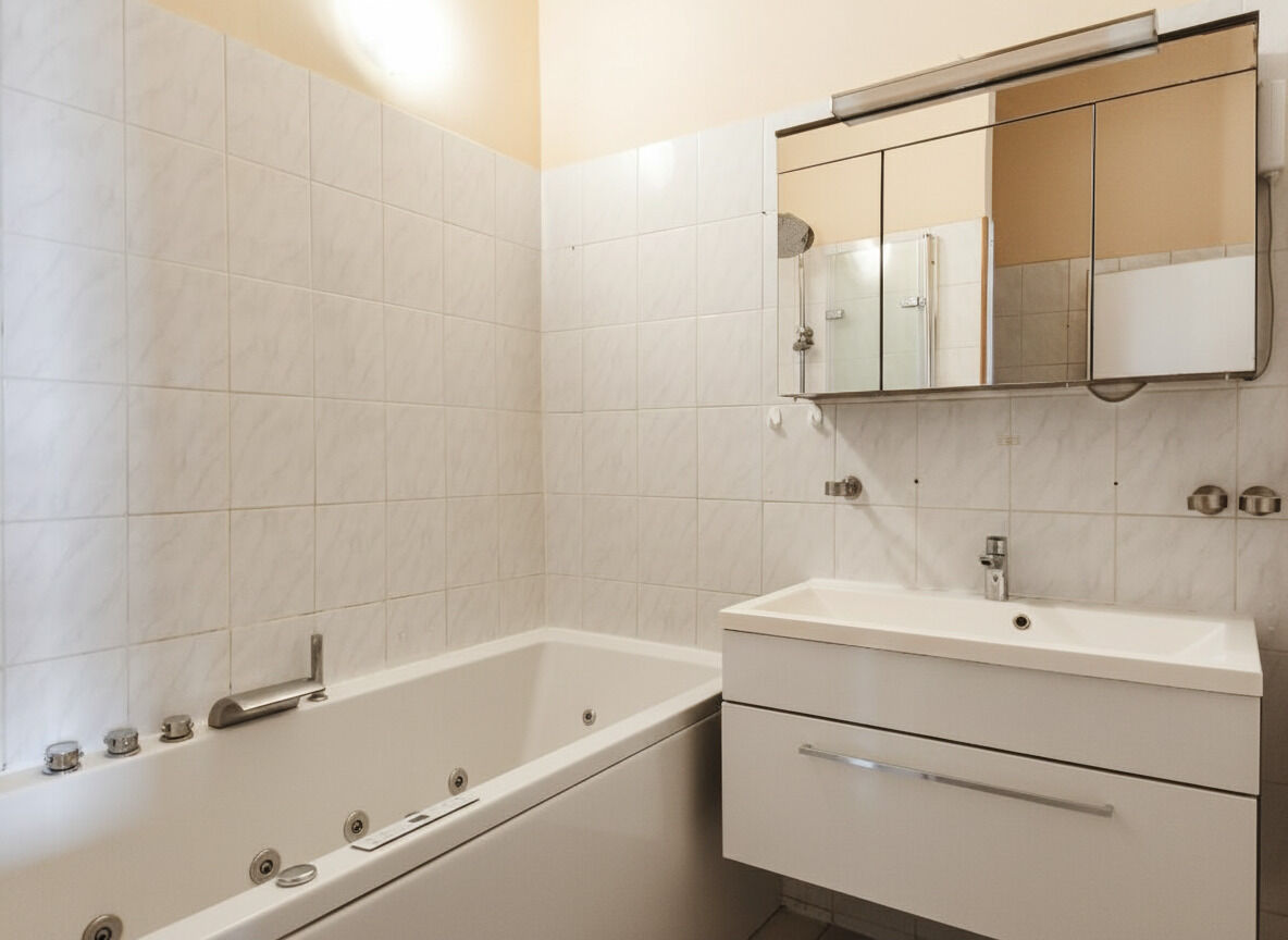 Das Badezimmer ist mit einer Badewanne ausgestattet.