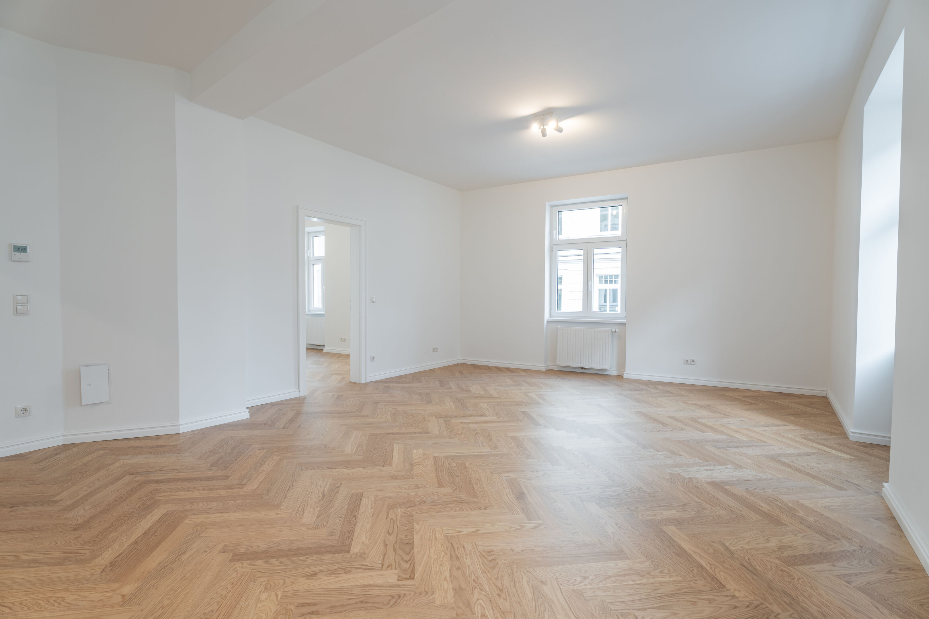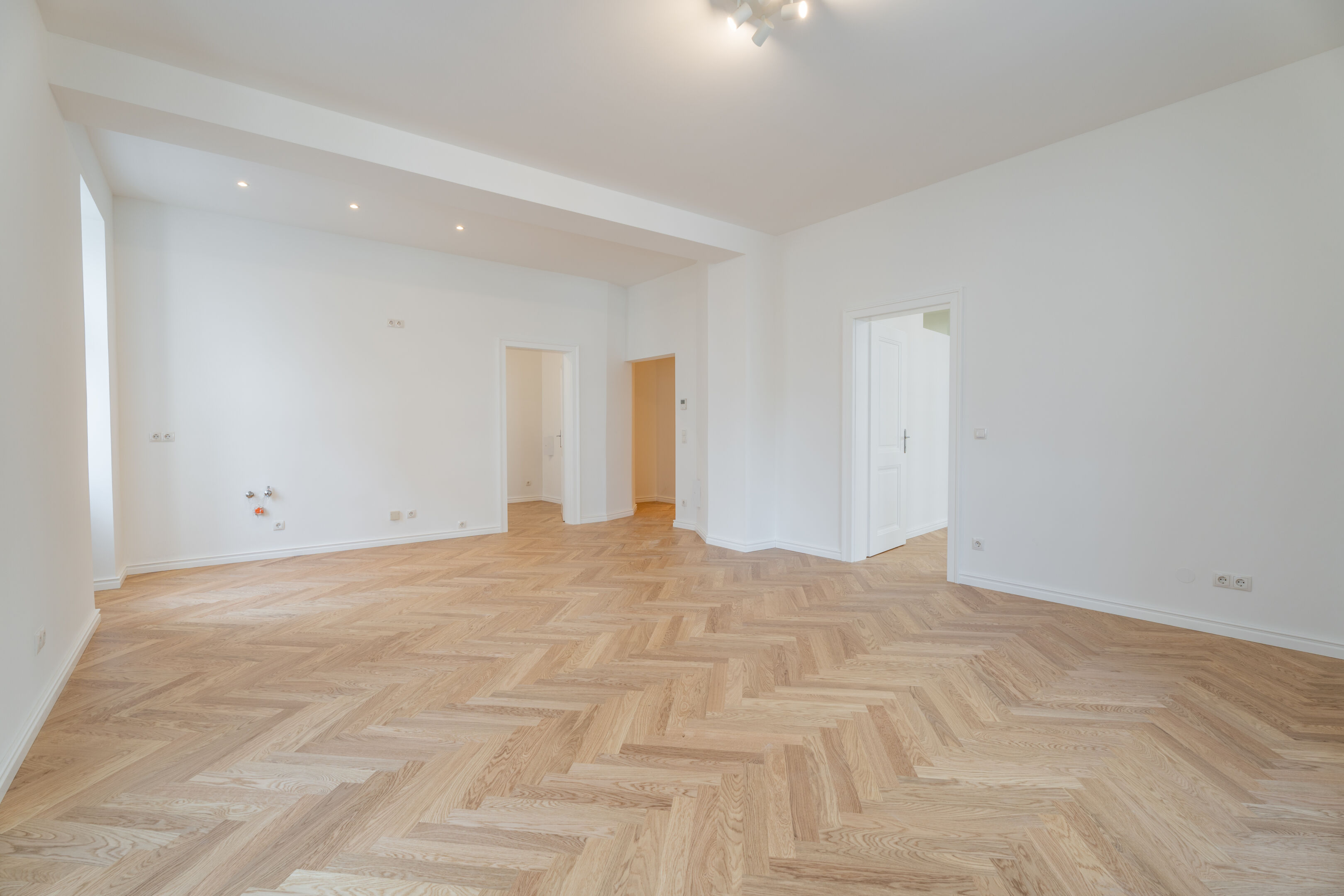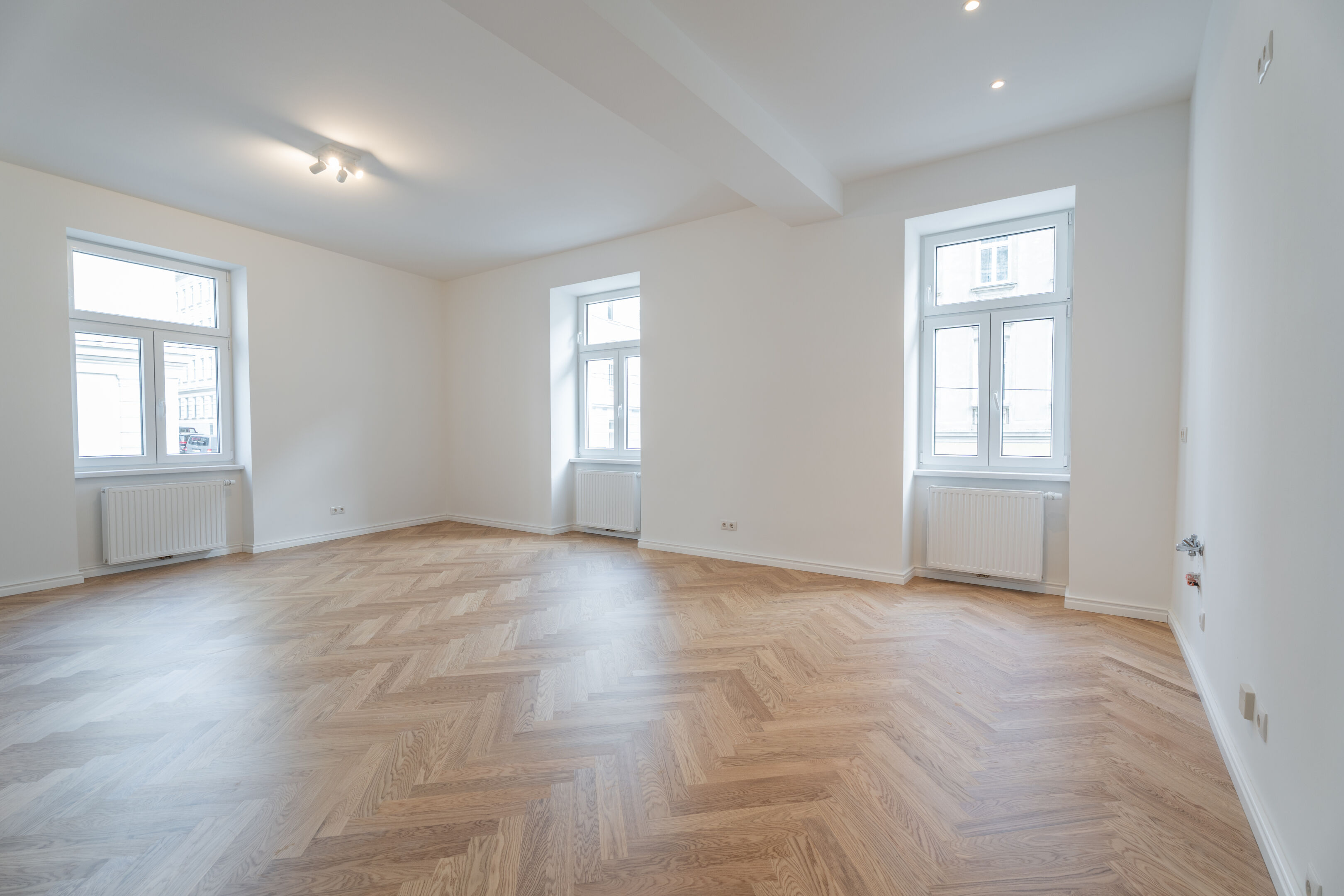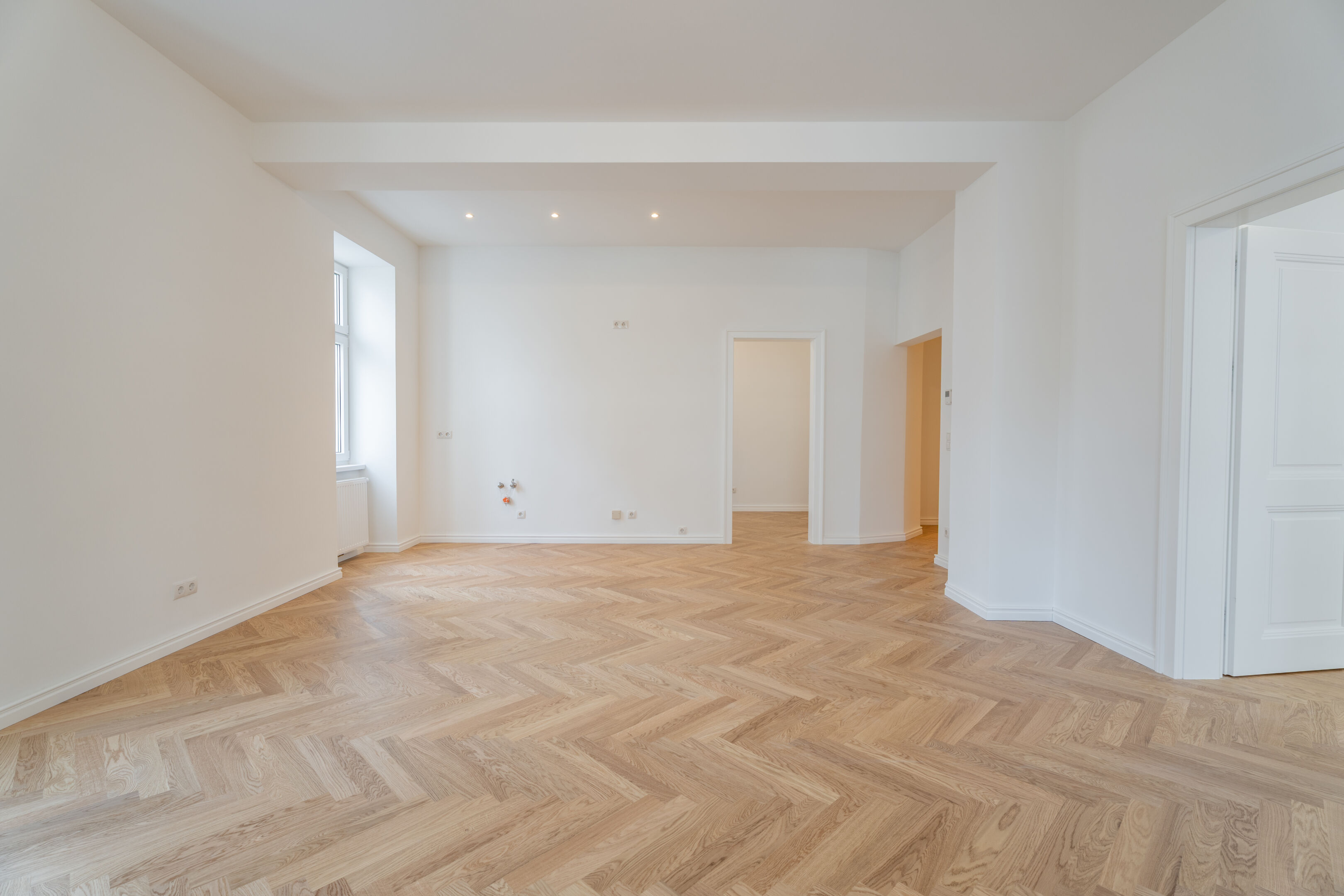 Im Zuge der Sanierung wurde besonderer Wert auf Qualität, Komfort und zeitloses Design gelegt. Die Wohnung ist mit Fußbodenheizung, edlem Eichen-Fischgrätparkett in den Wohnräumen sowie einer hochwertigen, modernen Badausstattung versehen. Die offene Wohnküche schafft gemeinsam mit den großen Fensterflächen ein helles und einladendes Wohnambiente.