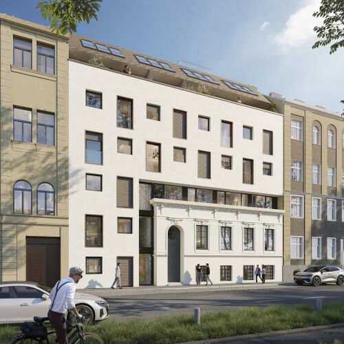 - In den Neubau harmonisch integrierte, revitalisierte Gründerzeitfassade