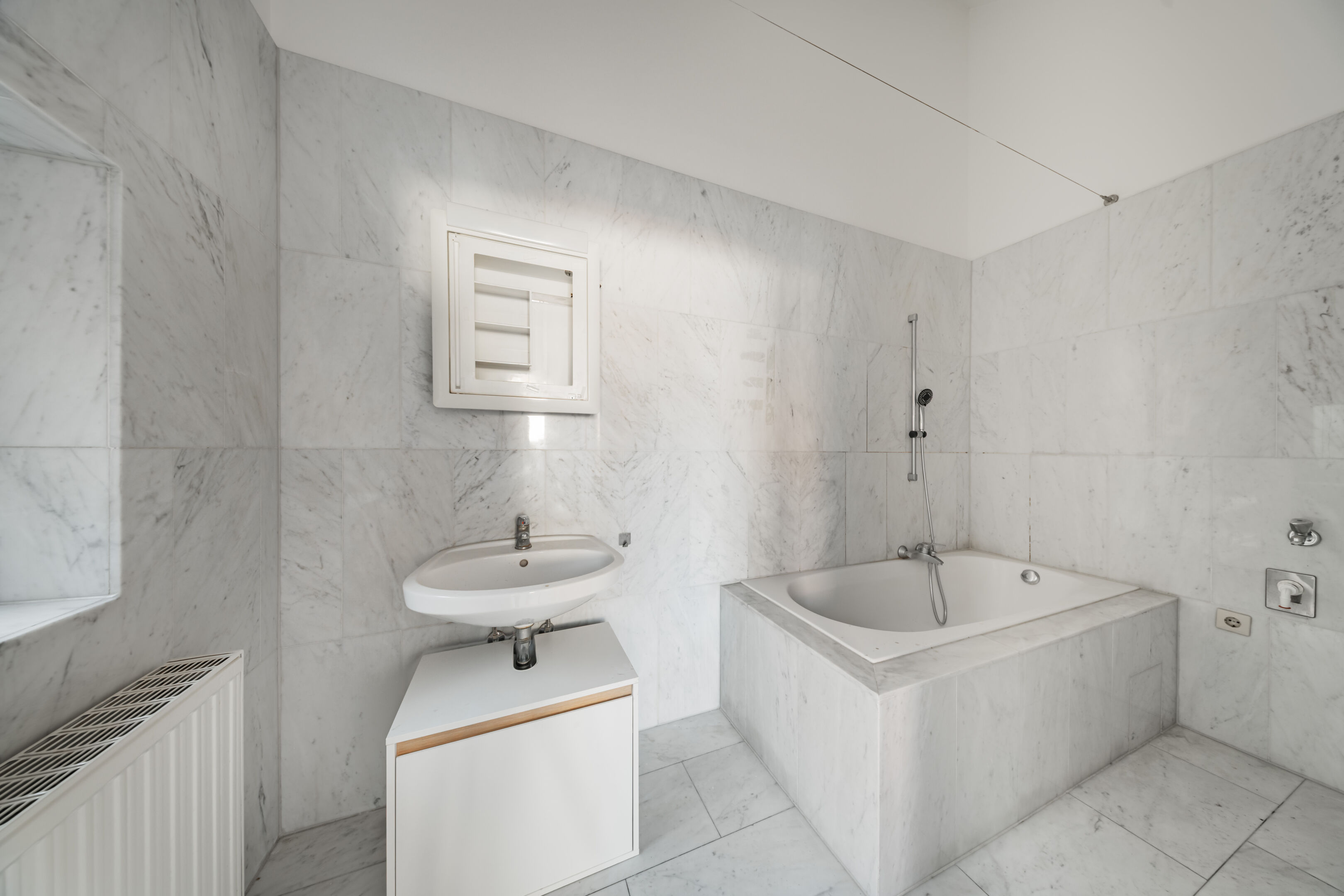 - Badezimmer mit Badewanne, Waschbecken und Waschmaschinenanschluss
