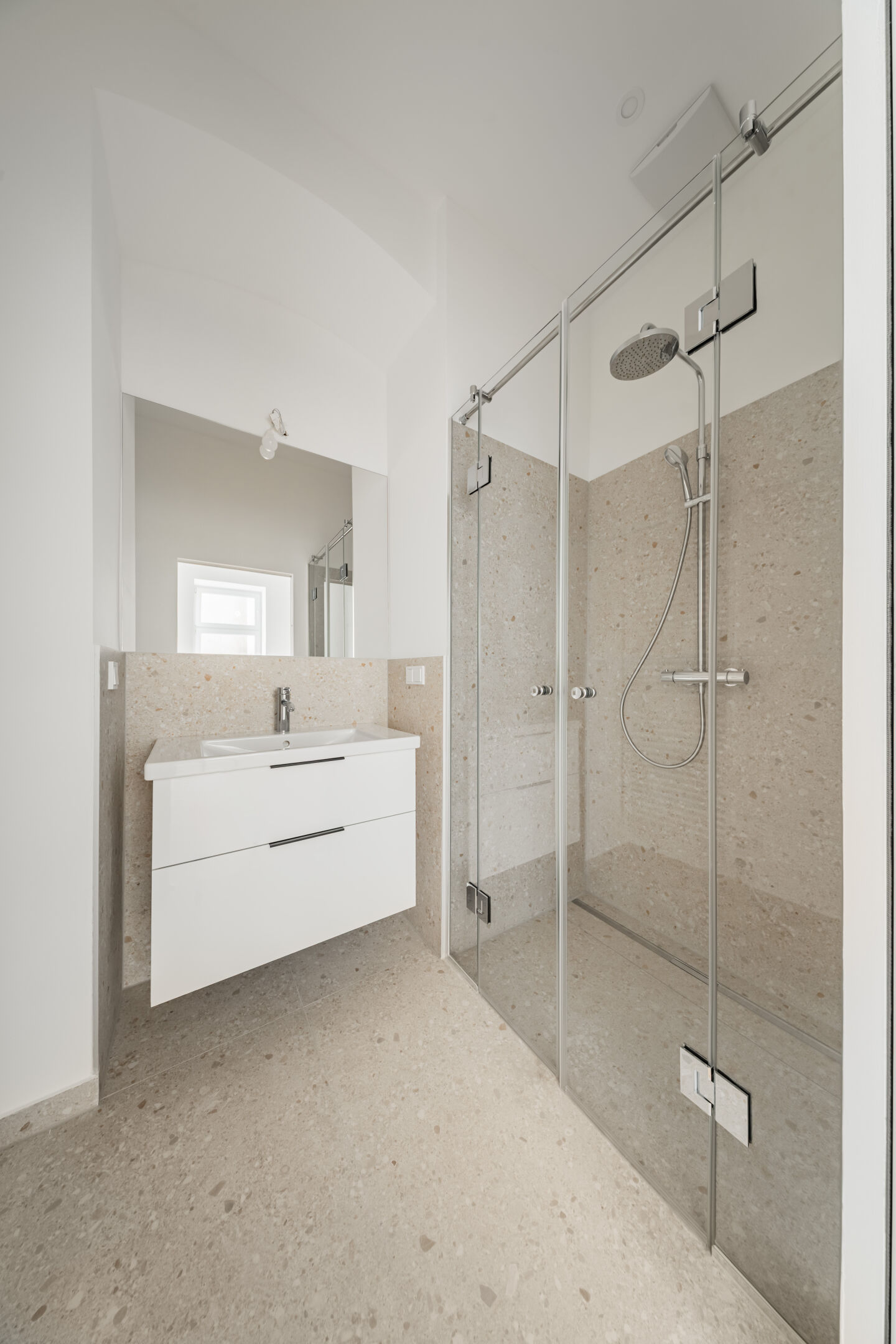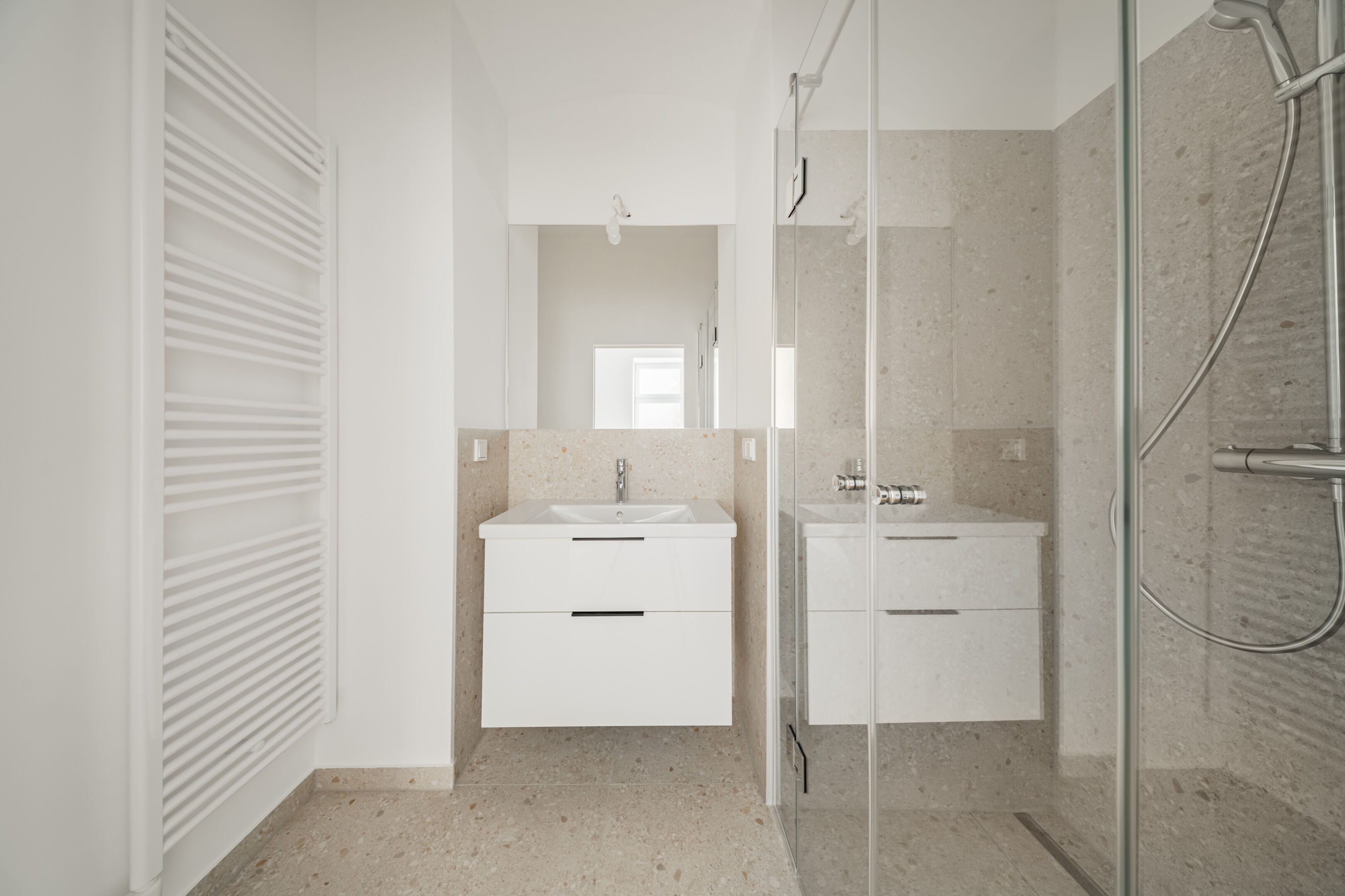 - Badezimmer mit Dusche, Waschbecken und Handtuchheizkörper