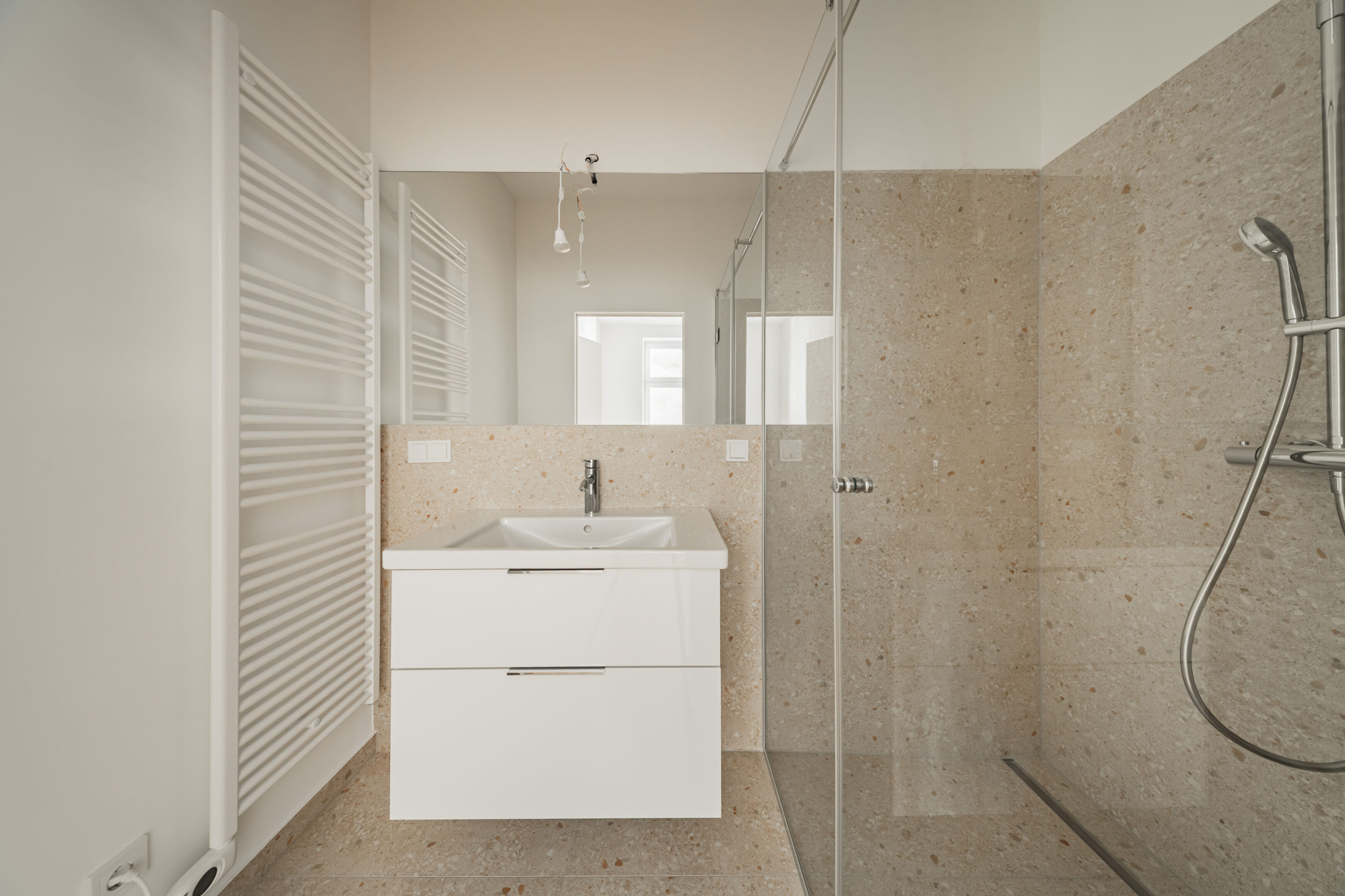 - Badezimmer mit Dusche, Waschbecken und Handtuchheizkörper