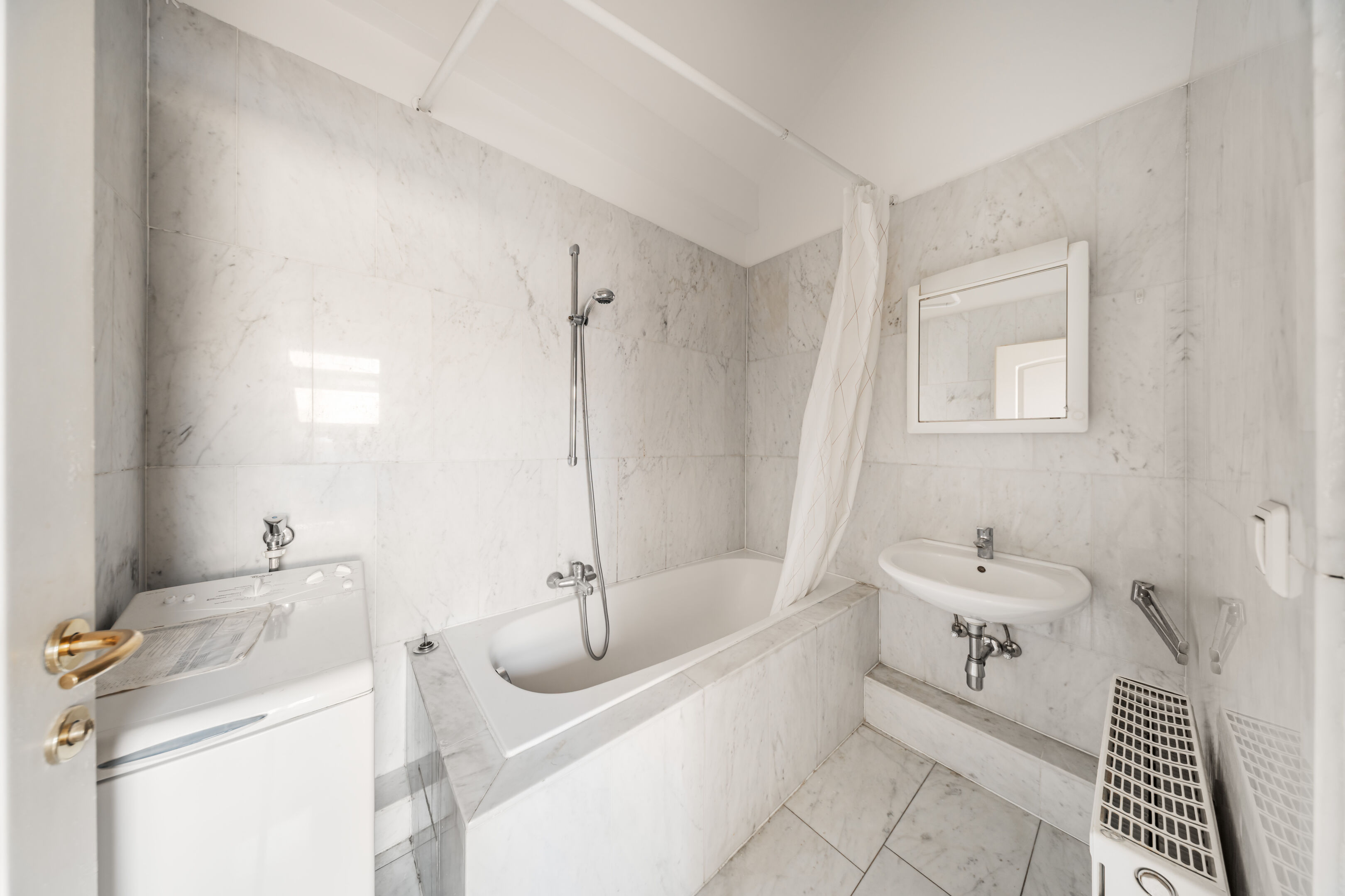 • Badezimmer mit Badewanne, Waschbecken und Waschmaschinenanschluss