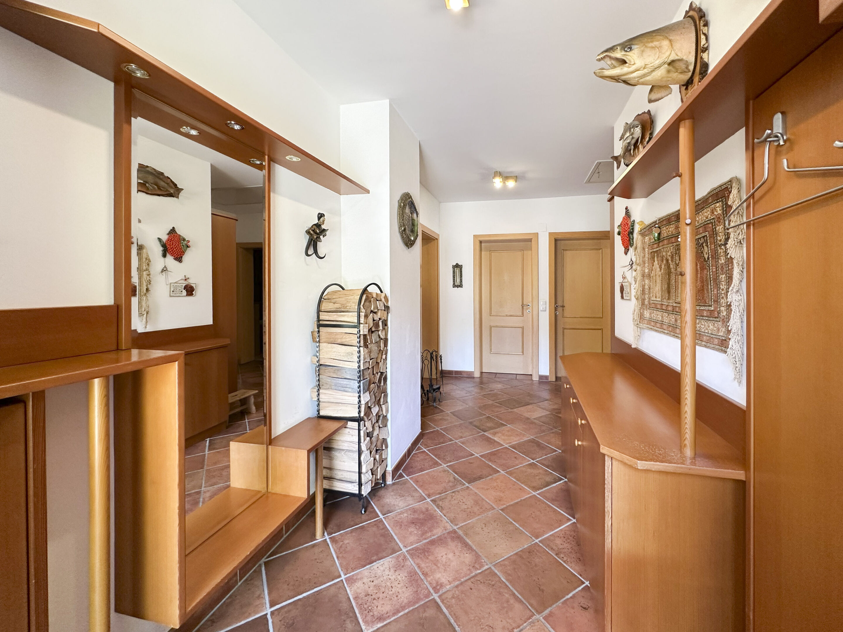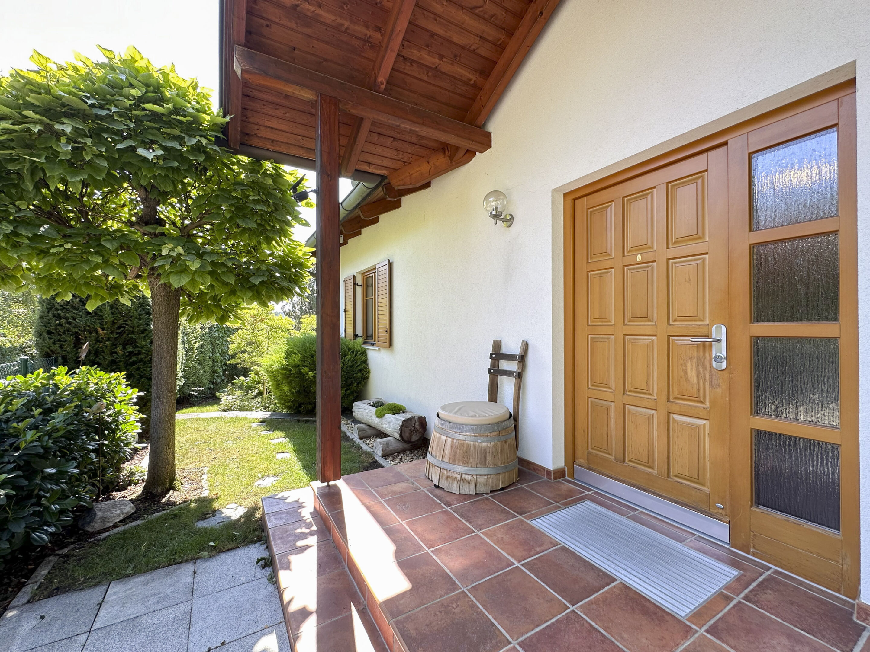 Die Wohnetage bietet rund 90 m² Wohnfläche und öffnet sich zu einer großzügigen Terrasse, auf der Sie bei einem Nachmittagskaffee die Sonne genießen. Von hier gelangen Sie direkt in den Garten – Ihre persönliche Oase zum Entspannen oder Garteln.