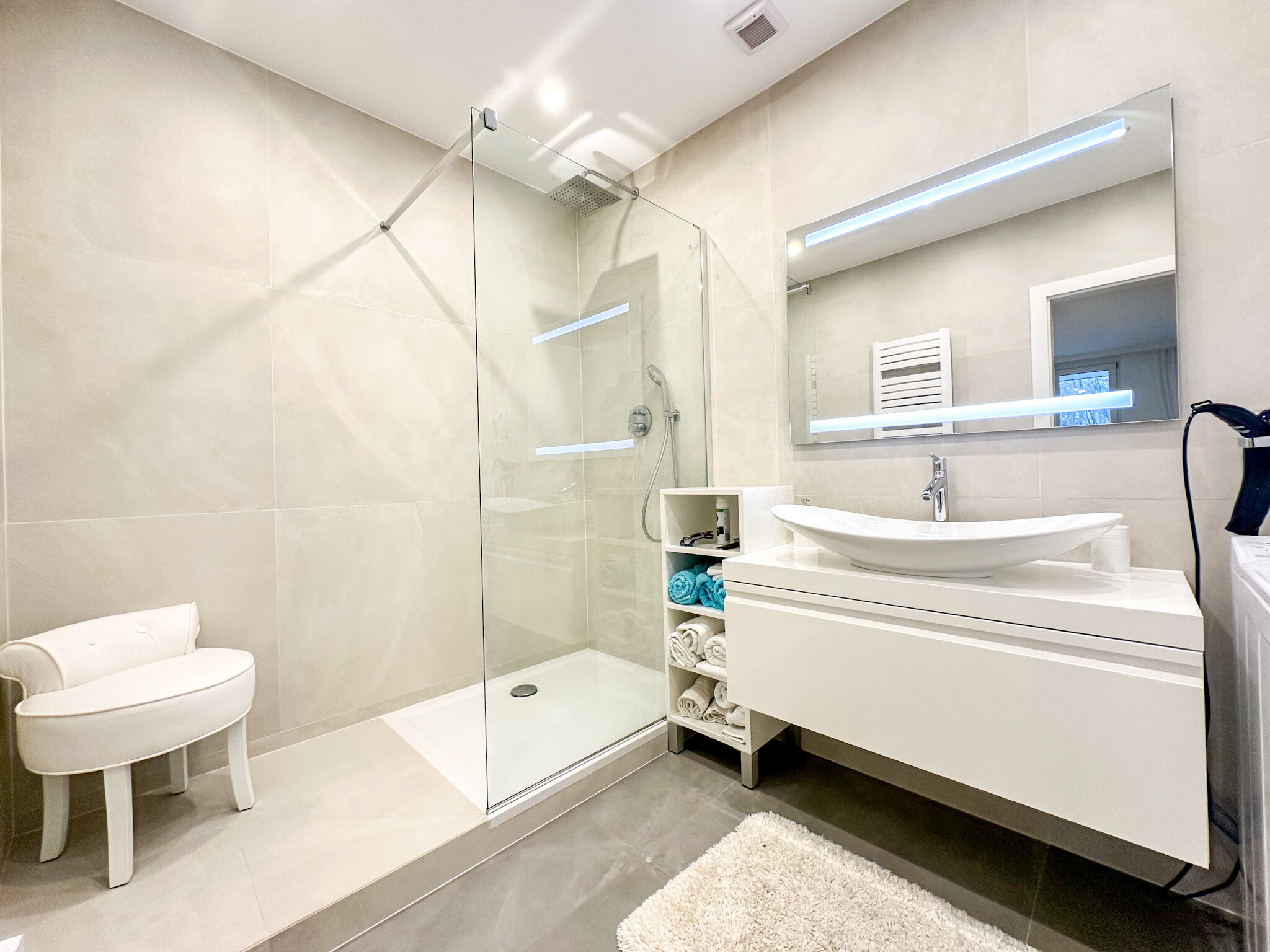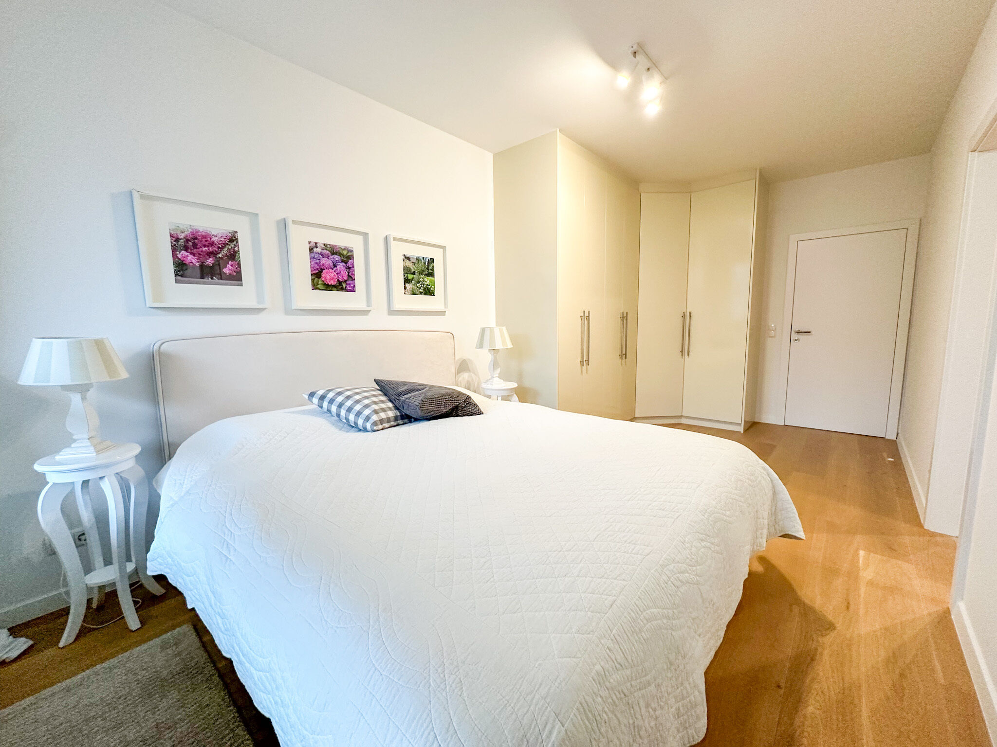 Das freundliche Schlafzimmer verfügt über ein angrenzendes Badezimmer mit Badewanne. Ein separates WC sowie ein praktischer Abstellraum runden das stimmige Raumkonzept ab und schaffen ein angenehmes, modernes Wohnambiente.