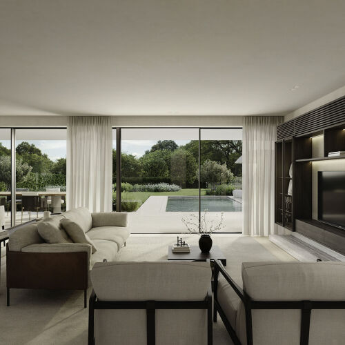 Es sind nicht die großen Gesten, die dieses Haus prägen, sondern die stillen Momente. Der erste Kaffee am Morgen, wenn die Stadt noch unter einem liegt. Ein später Abend auf der Terrasse, wenn sich das Licht langsam zurückzieht und nur noch die Konturen der Hügel sichtbar bleiben. Die Außenbereiche sind nicht nur zusätzlicher Komfort, sondern auch visuelle Erweiterungen der exklusiven Bauwerke. Wenn Wasserfläche und Himmel ineinander übergehen, entsteht ein Moment, der nur Ihnen gehört. Kein öffentlicher Bereich, kein geteilter Raum, sondern ein persönlicher Horizont. Privatsphäre entsteht hier nicht durch Abschottung, sondern durch Abstand. Durch die Lage. Durch die Anordnung. Durch das Bewusstsein, dass jeder Blick bewusst geführt ist und jeder Außenraum klar definiert bleibt – ob Garten, Terrasse oder privater Pool. Die Architektur schafft dafür die Grundlage: klare Übergänge zwischen Innen und Außen, gezielt gesetzte Beschattungselemente, die das Licht lenken, und ein Raumklima, das sich unmerklich anpasst, ohne in den Vordergrund zu treten.