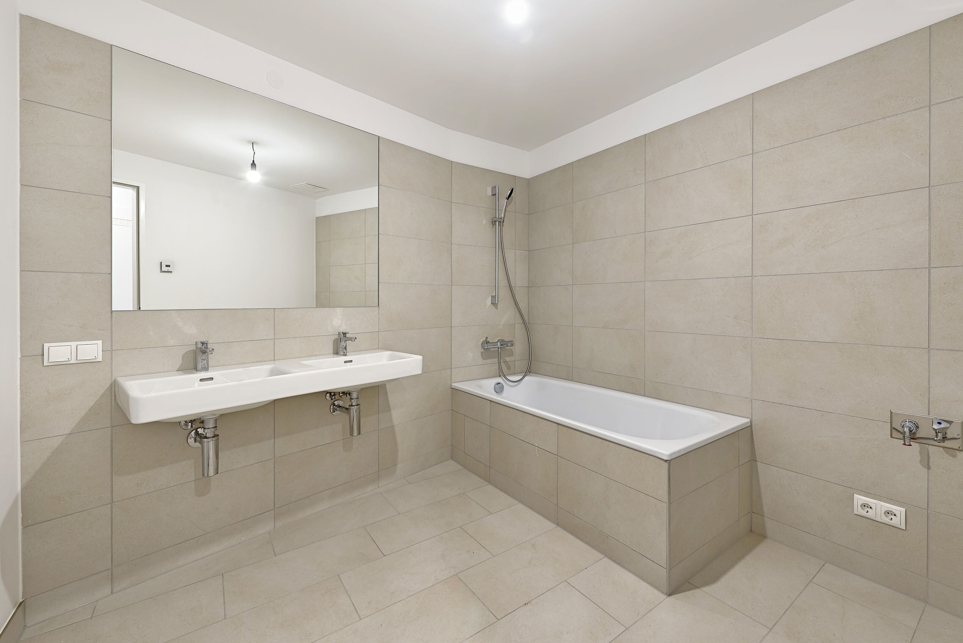 - Badezimmer mit Badewanne, zwei Handwaschbecken und Waschmaschinenanschluss