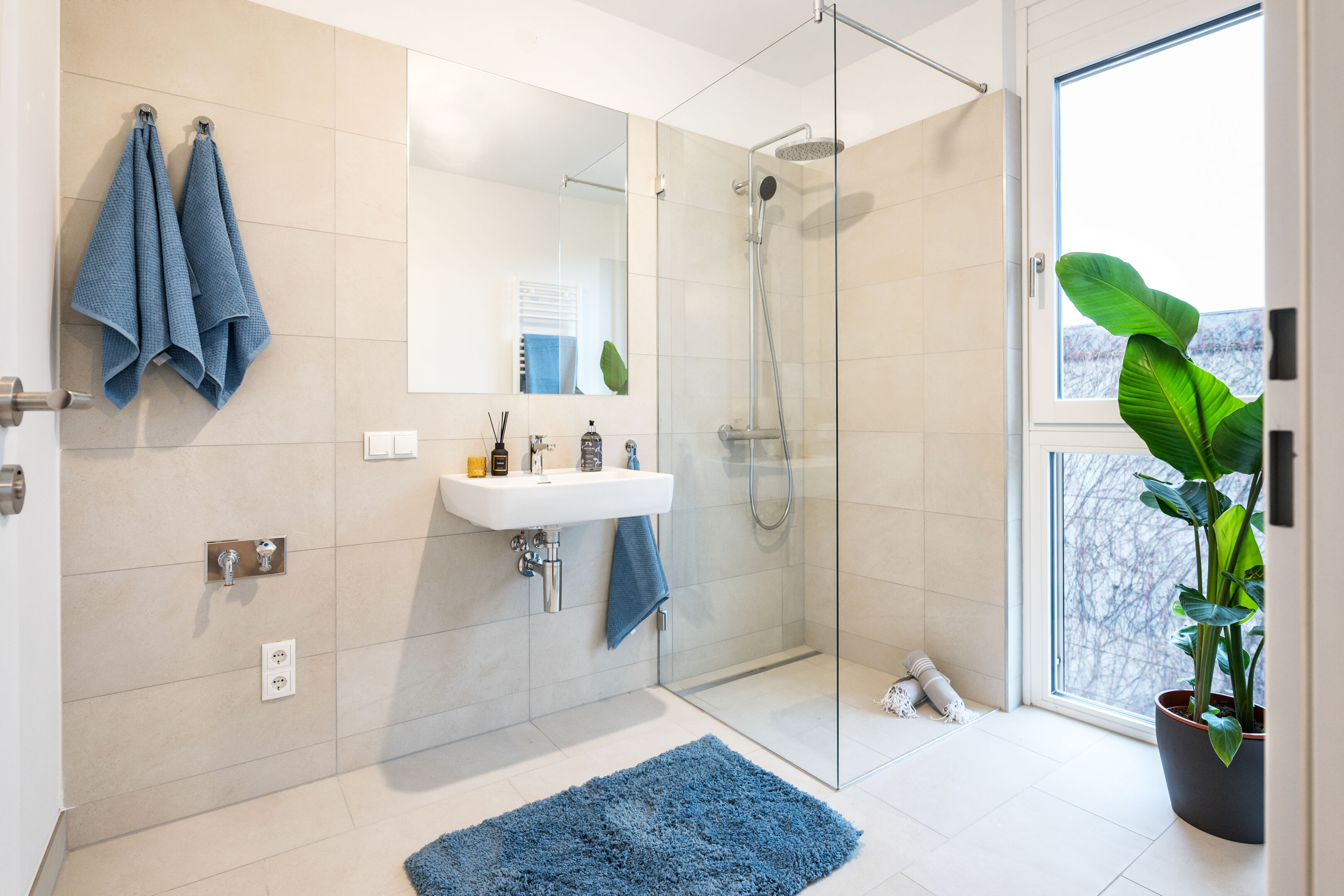- Badezimmer (ca. 5,5 m²) mit Dusche, Handwaschbecken und Waschmaschinenanschluss