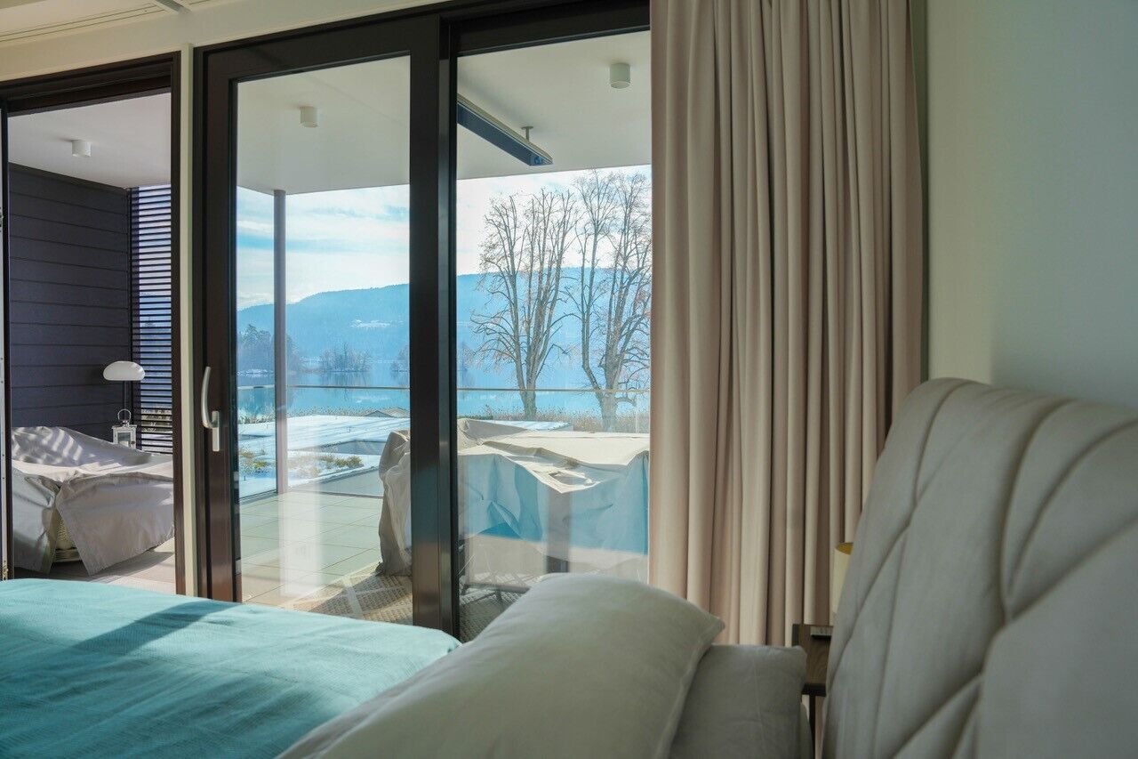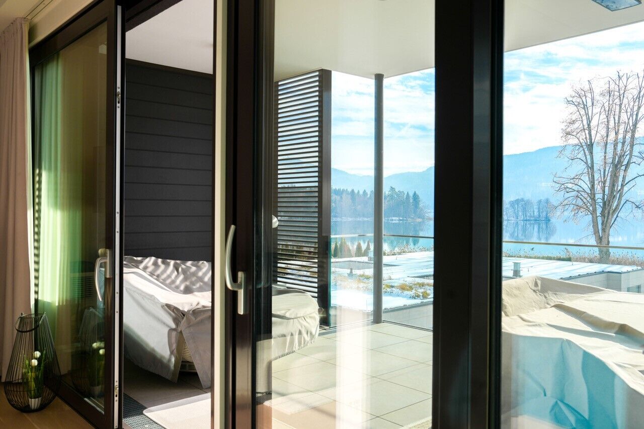 Die im Obergeschoss gelegene Designer-Seewohnung überzeugt durch eine offene Raumgestaltung, klare Architektur und erlesene Materialien. Großzügige Glasfronten holen den Wörthersee in jeden Raum und schaffen ein einzigartiges Wohngefühl in direkter Seelage.