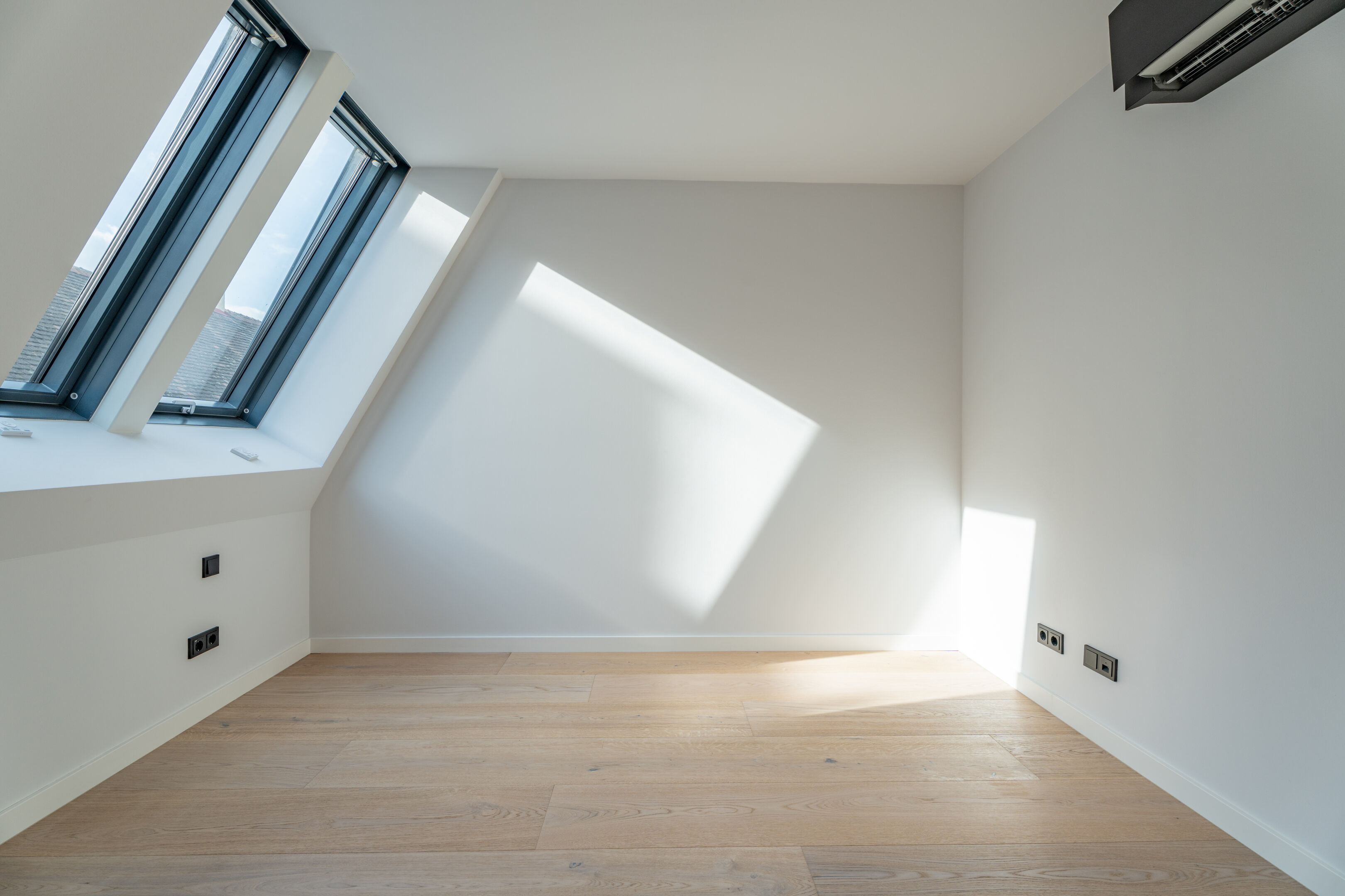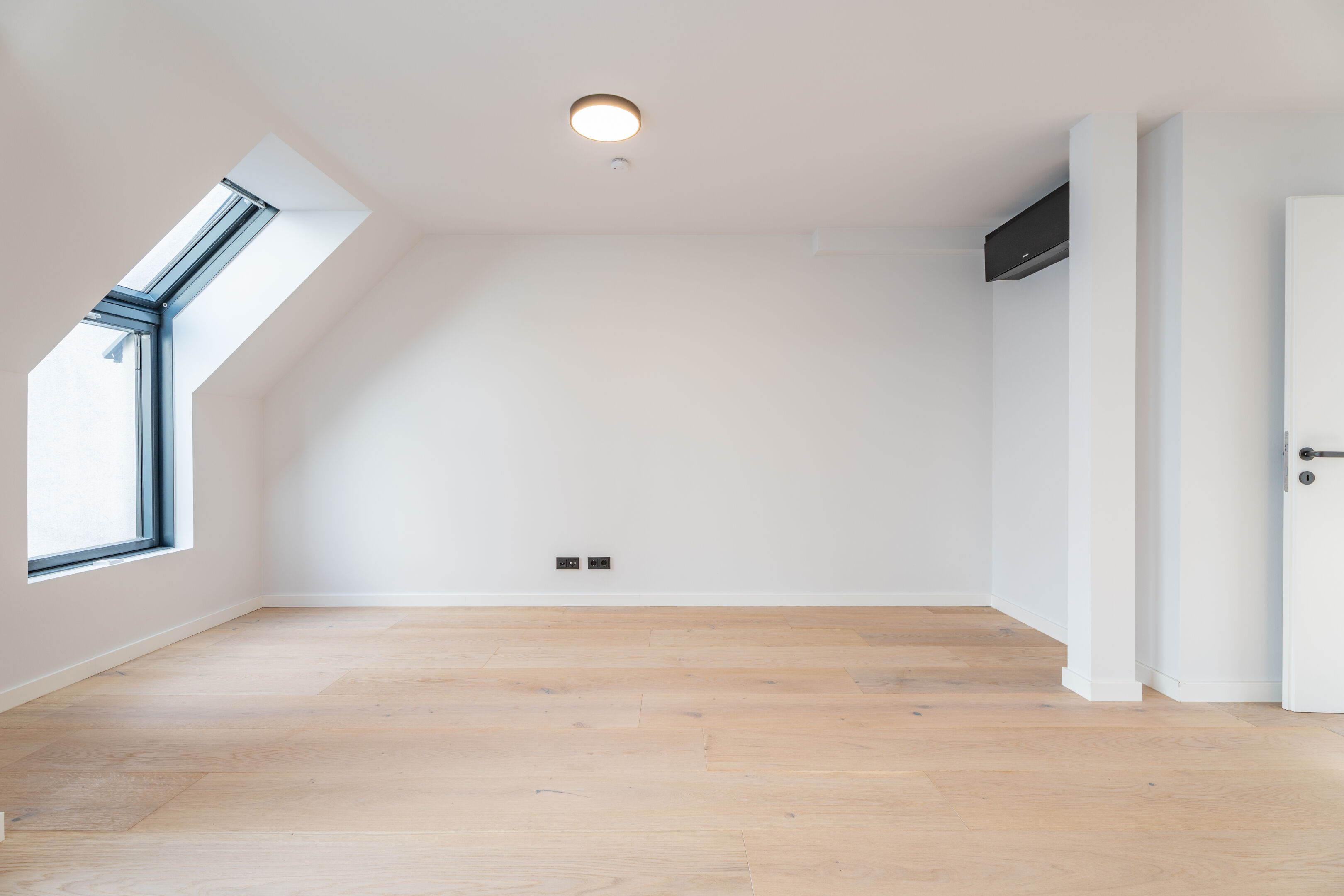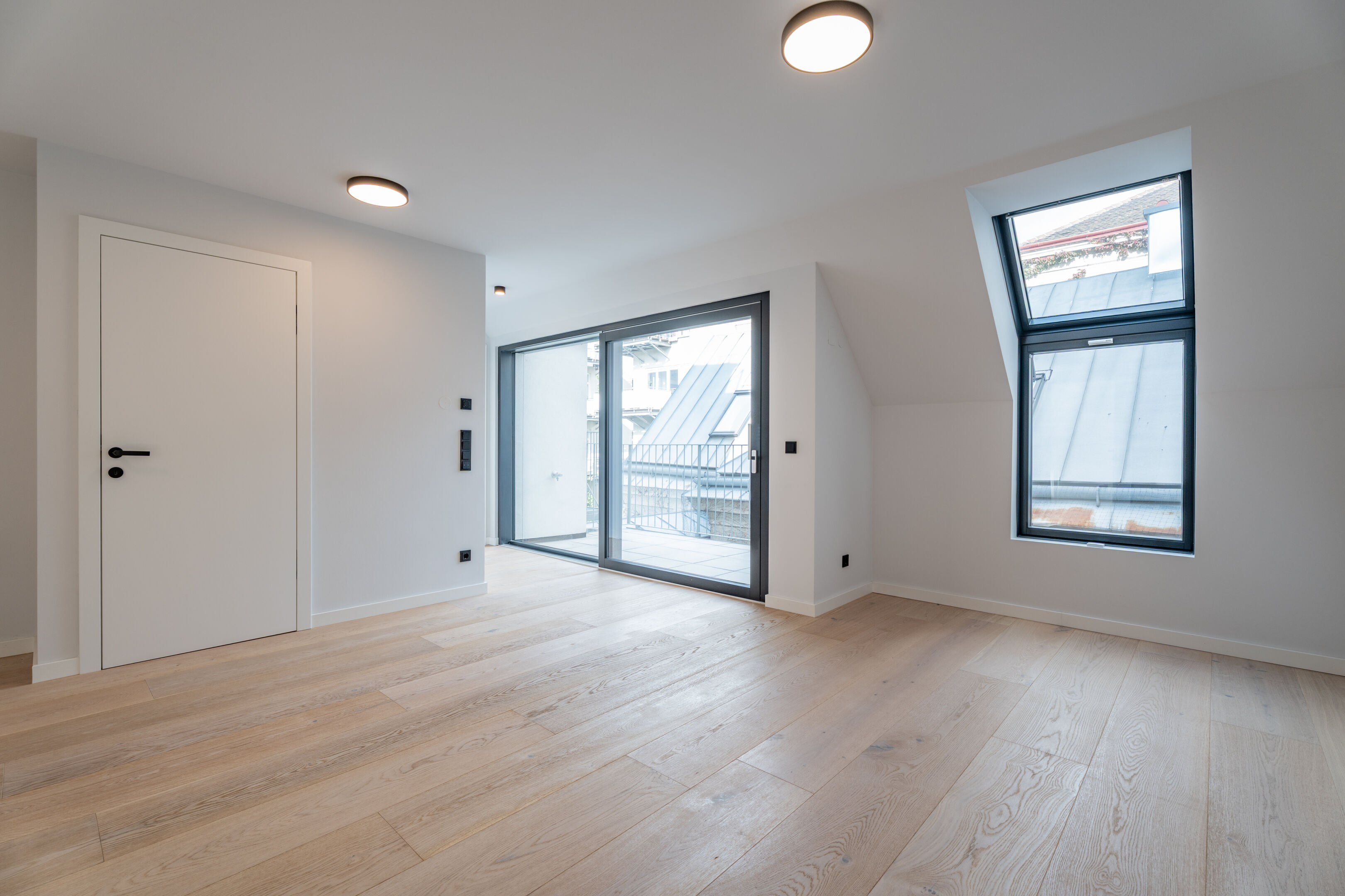 Die Dachgeschosswohnungen – drei Einheiten im 1. Dachgeschoß und das Penthouse im 2. Dachgeschoß – bilden das architektonische Highlight des Projekts. Großzügige Fensterfronten lassen die lichtdurchfluteten Räume erstrahlen und eröffnen eindrucksvolle Ausblicke über die Stadt.