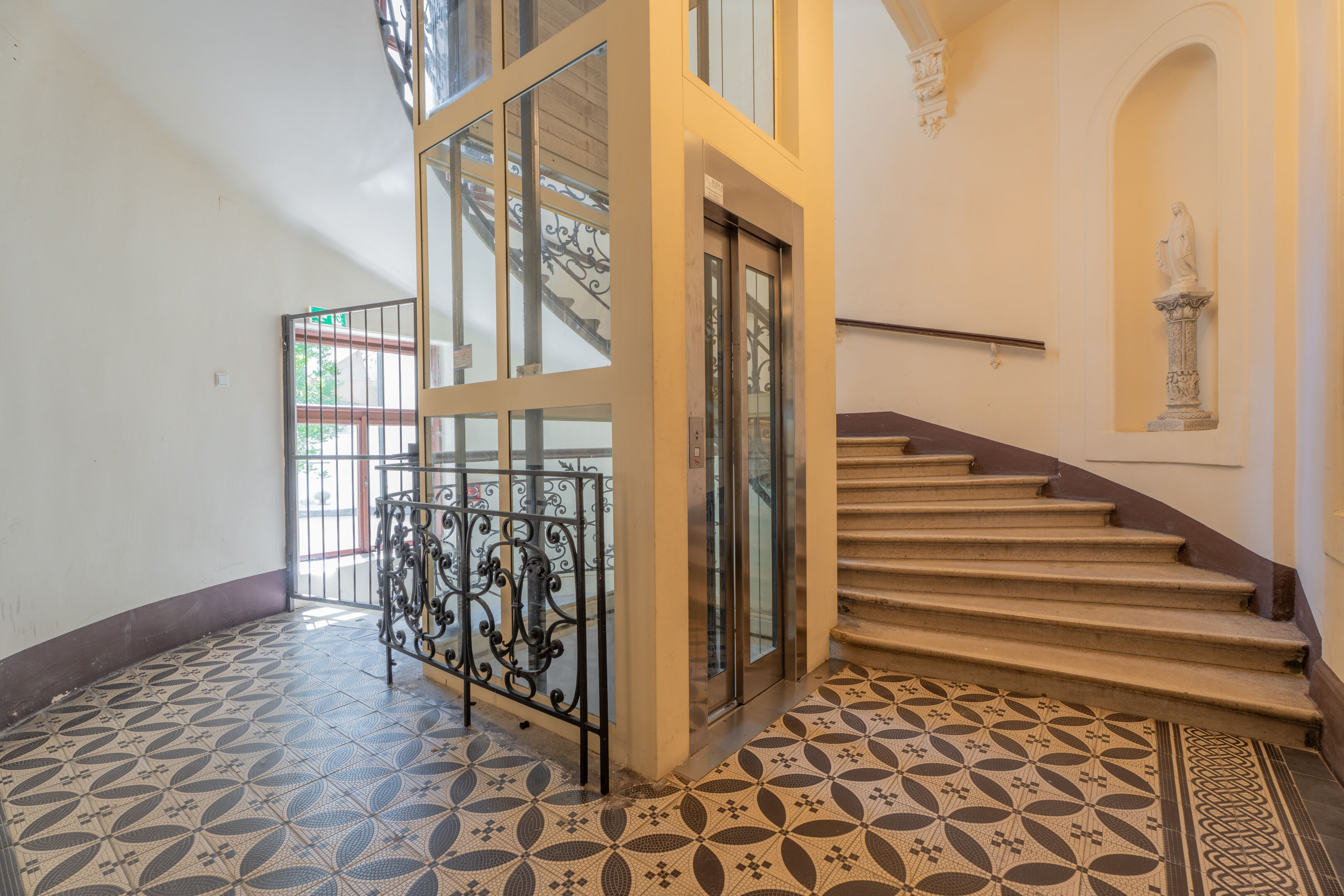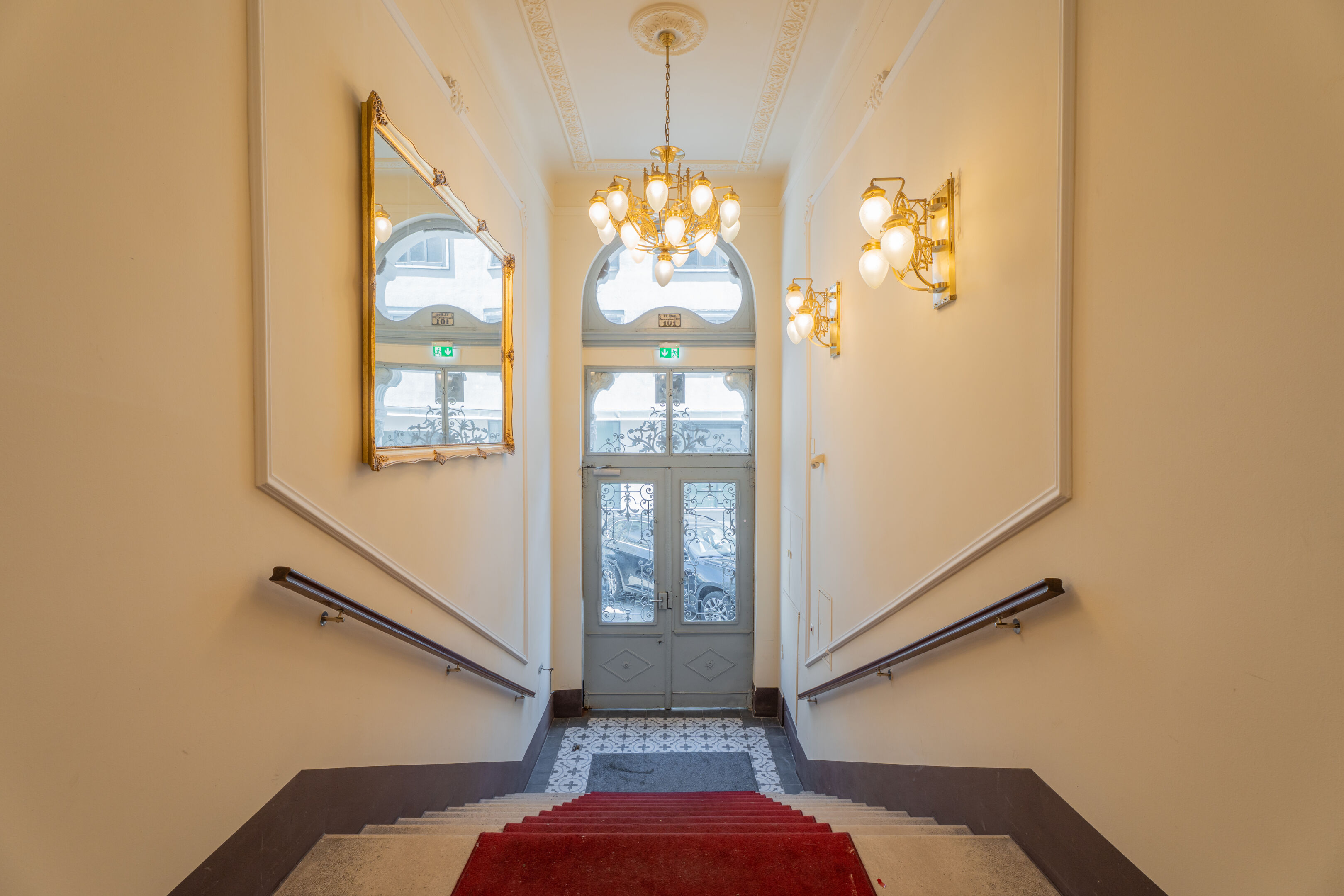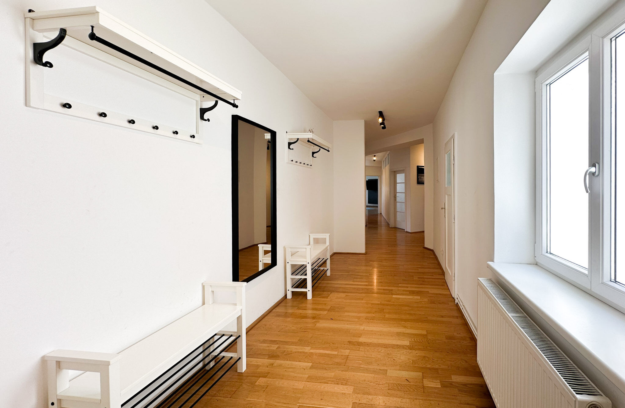 Die charakteristischen Elemente der Jahrhundertwende-Architektur – hohe Räume, Fischgrätparkett, Flügeltüren – sind teilweise erhalten und unterstreichen den einzigartigen Stil des Hauses.