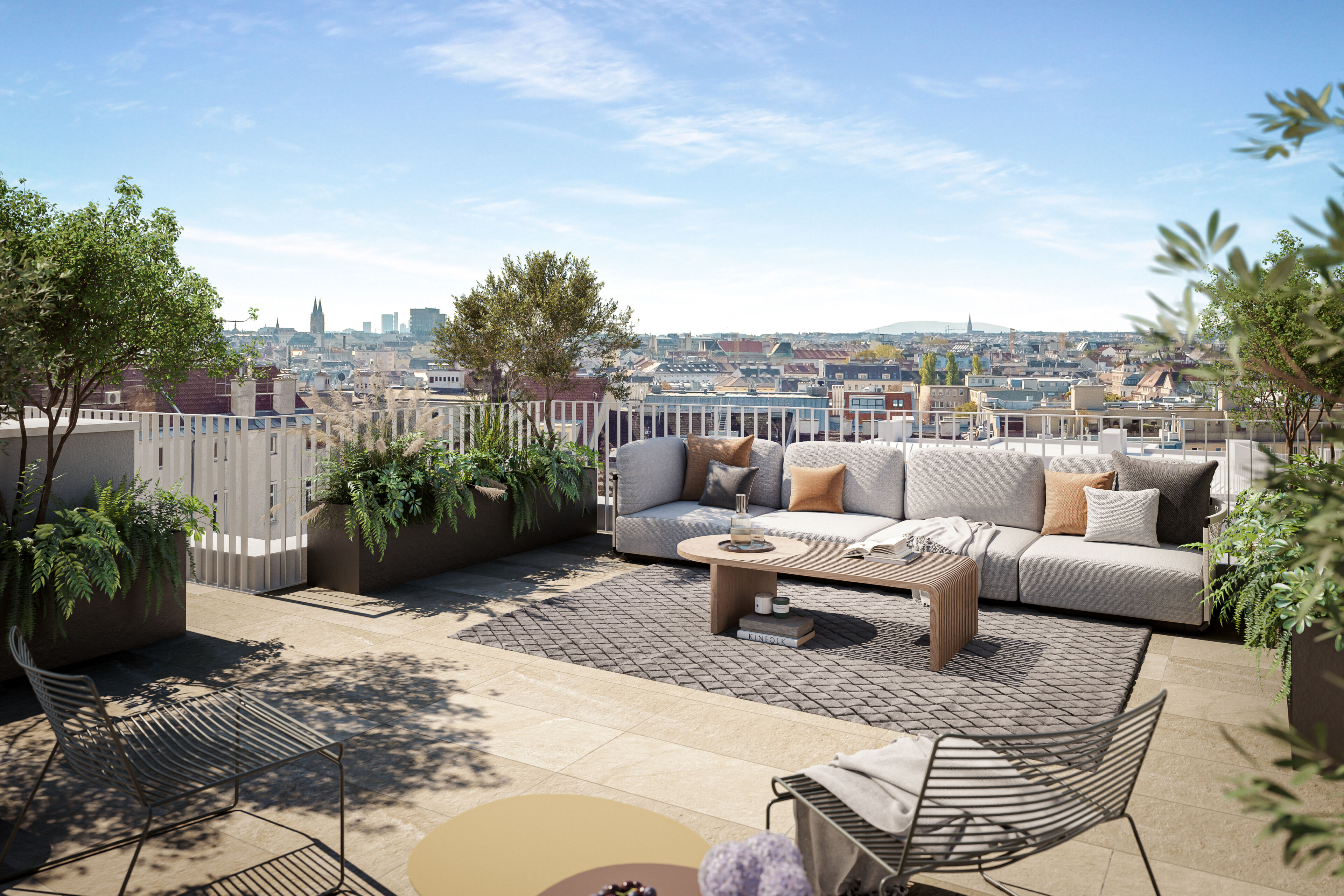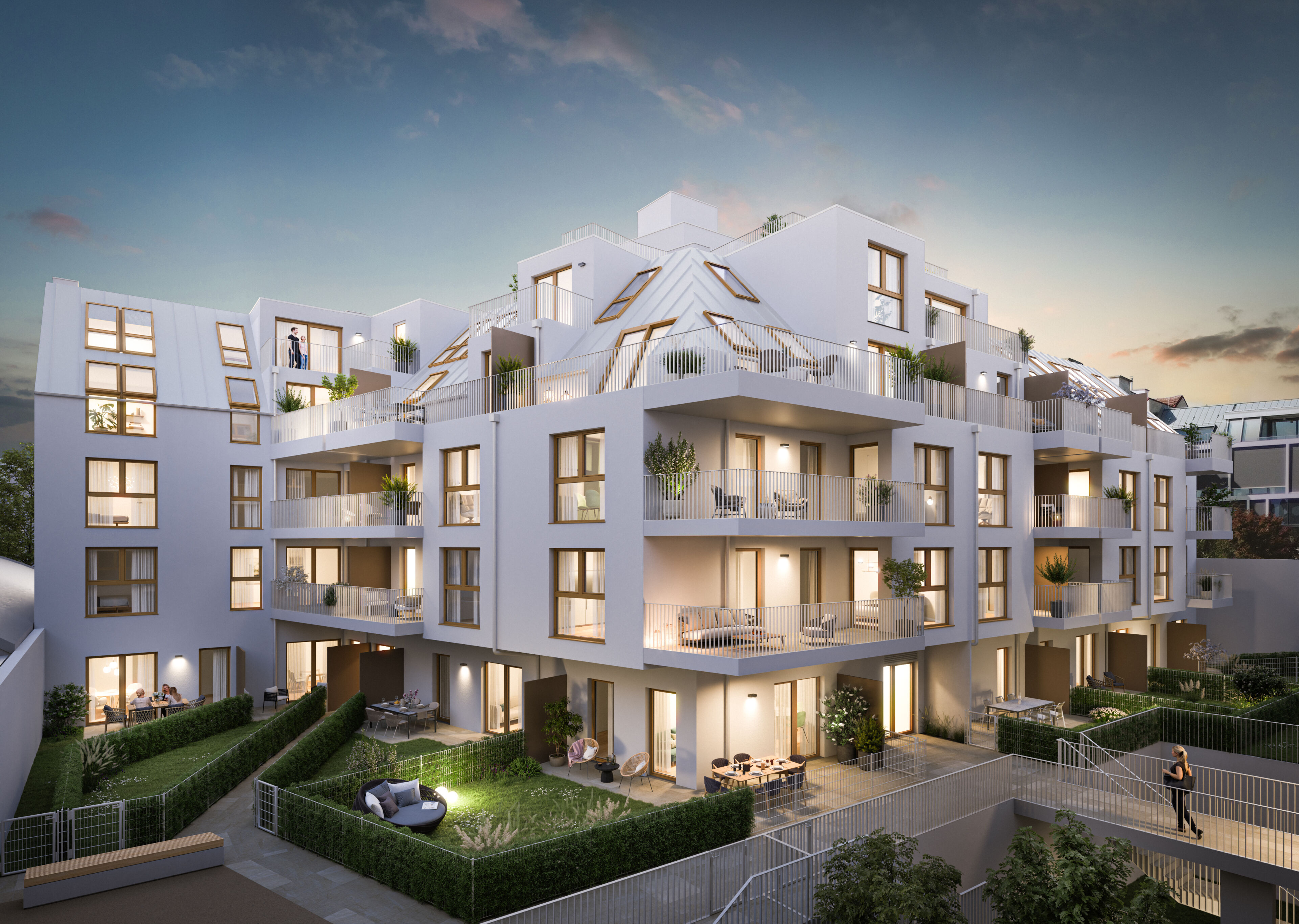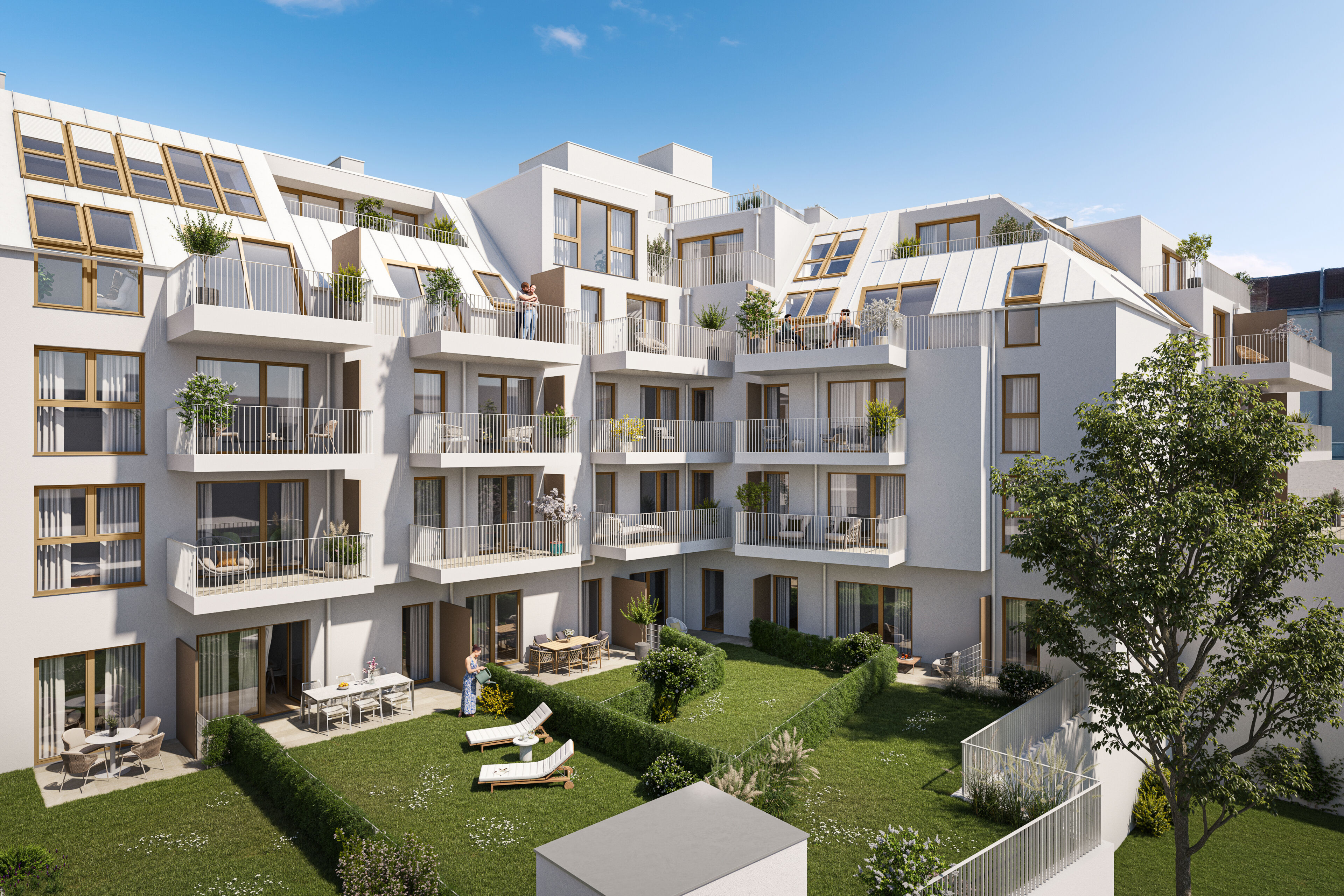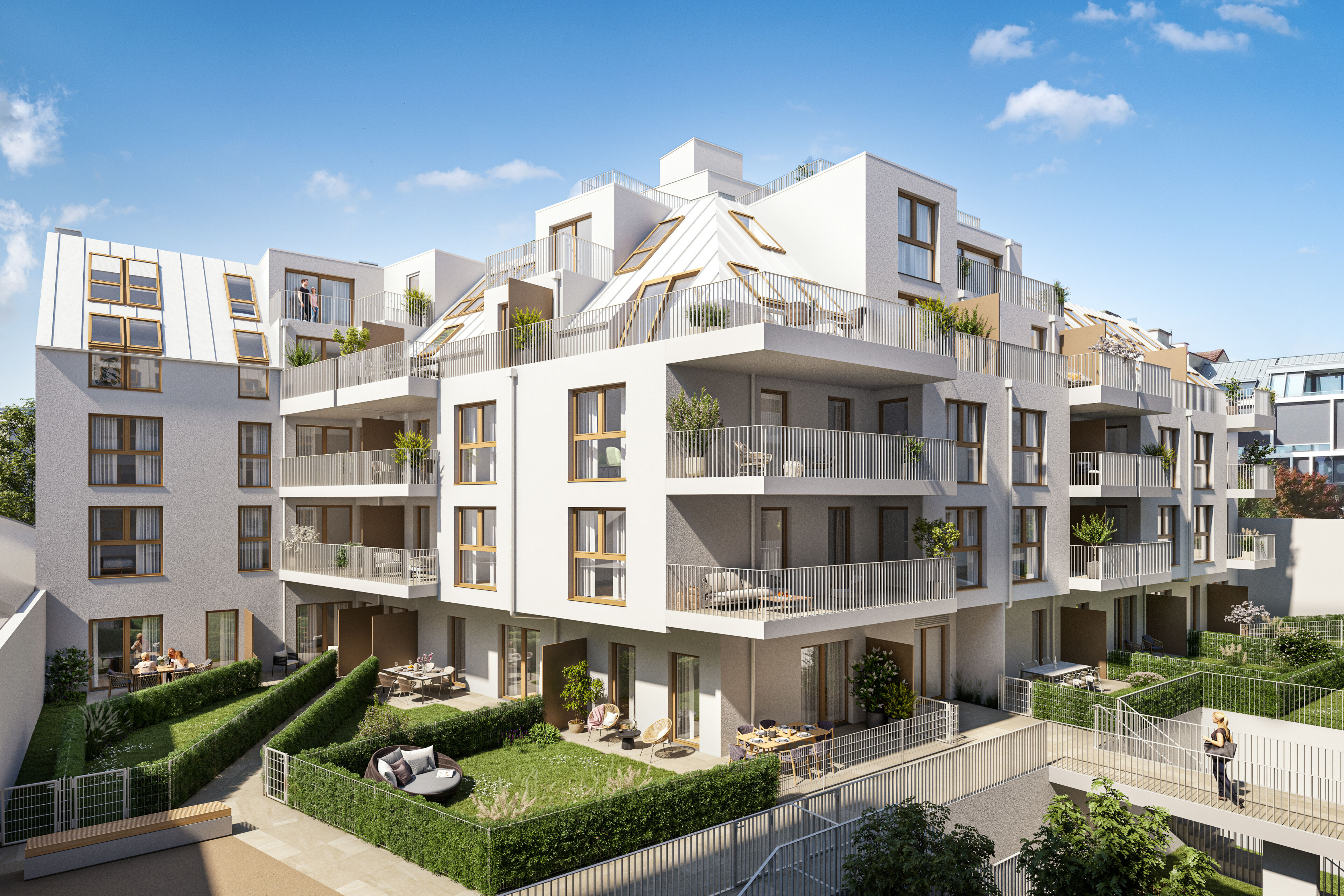 ihrer modernen Fassade und der puristisch-eleganten Formensprache stilvoll zwischen die historischen Gebäude des Wohnviertels ein. In den Regelgeschoßen der beiden Bauteile schaffen flexible Grundrisse ein offenes Raumgefühl und die Möglichkeit für individuelle Gestaltung. Allen Wohntypen gemeinsam ist das Prinzip, den zukünftigen Bewohnern ein Maximum an Wohnerlebnis zu bieten. Designanspruch und Qualität werden in allen vier Wohnungstypen hochgehalten. Die bei fast jeder Wohnung vorhandenen Freibereiche erweitern die einladenden Wohnräume und geben den Blick auf die Grünoase im Innenhof oder die ruhige Schumanngasse frei. Neben den großzügigen Gartenwohnungen stehen Wohnungen mit Balkonen oder Terrassen zur Auswahl. Im begrünten Innenhof befinden sich neben dem Kinderspielplatz mit Sandkiste mehrere Sitzmöglichkeiten, im Gartengeschoß im hinteren Gebäude ein Kinder- und Jugendspielraum sowie ein Kinderwagen- und Fahrradabstellraum.