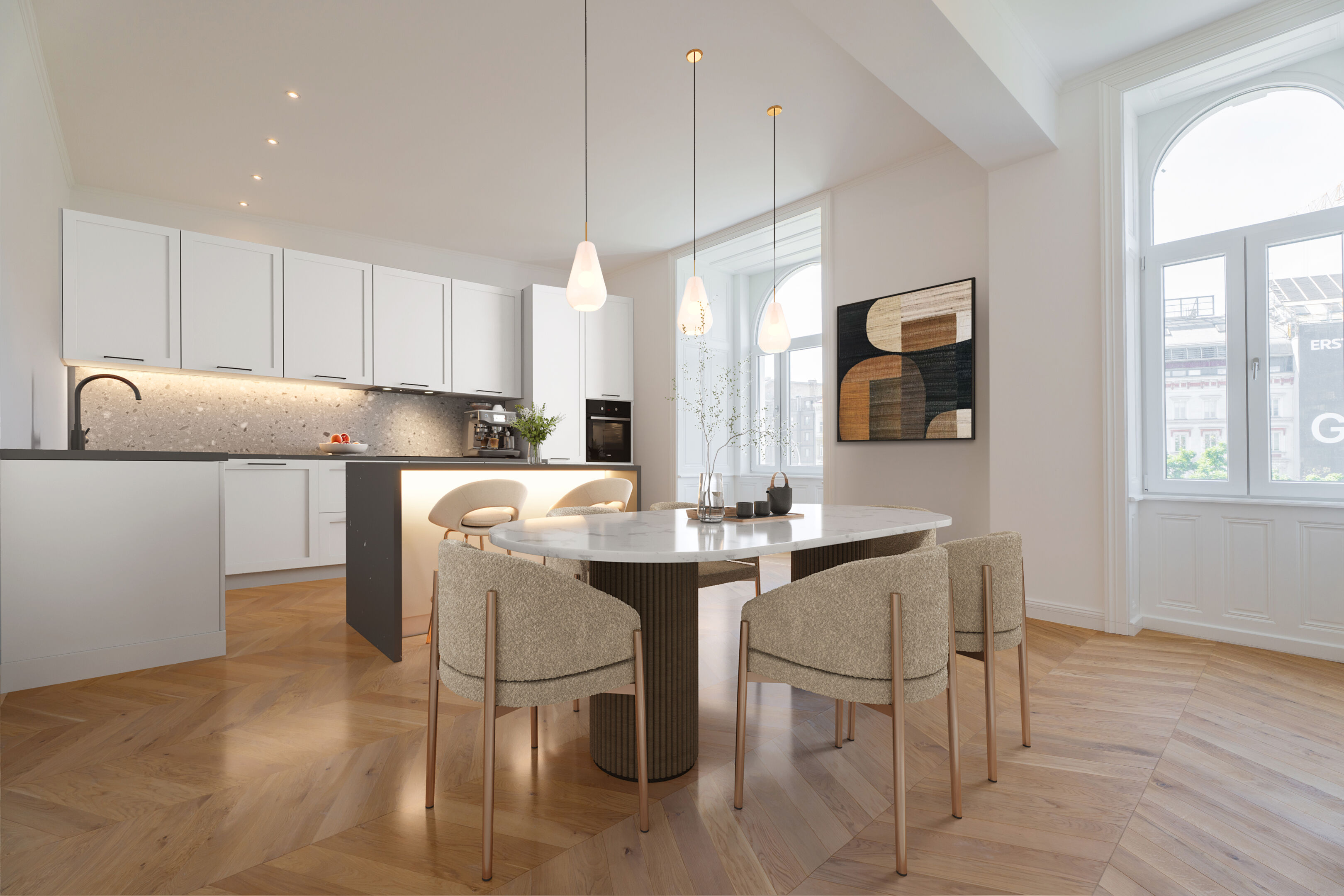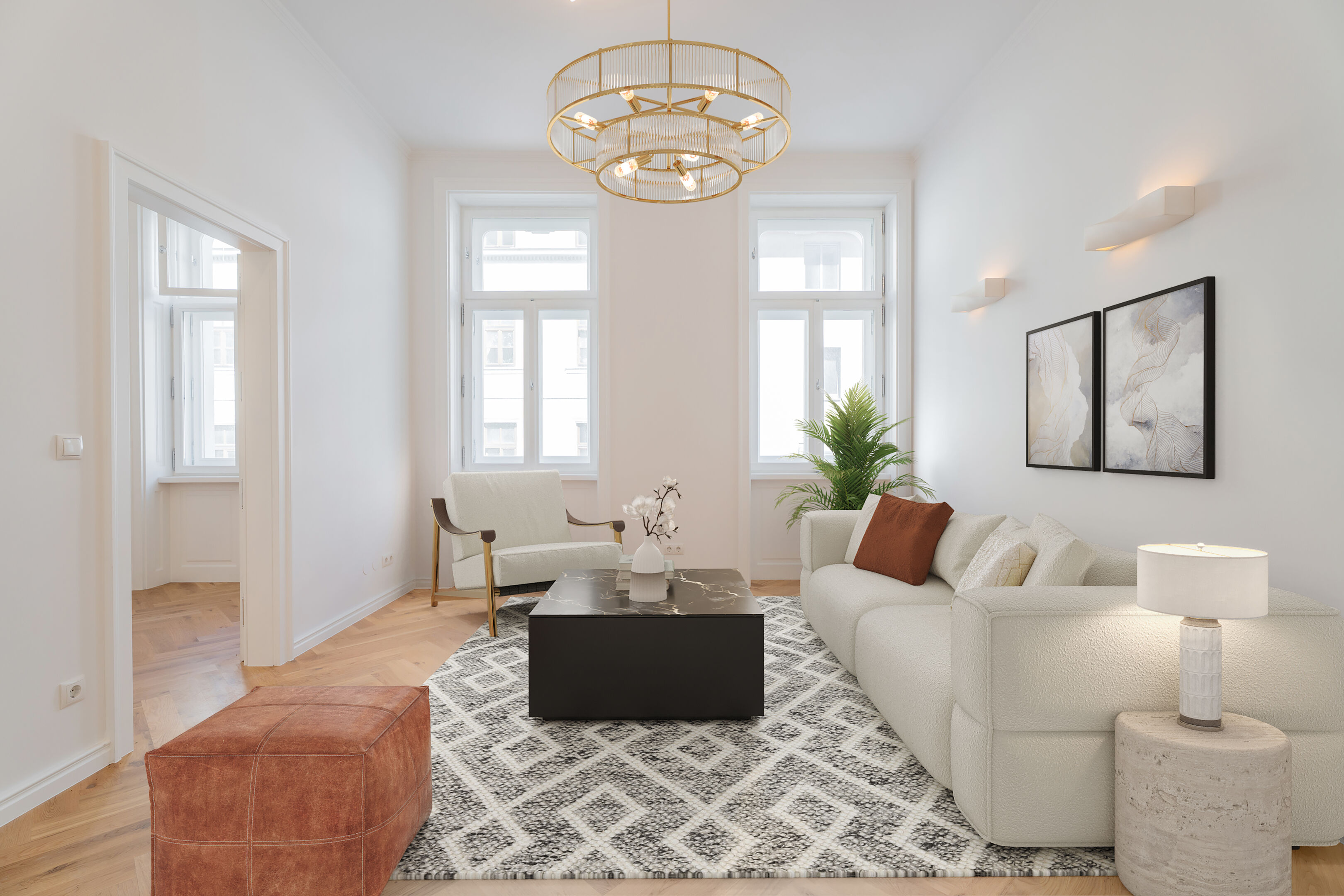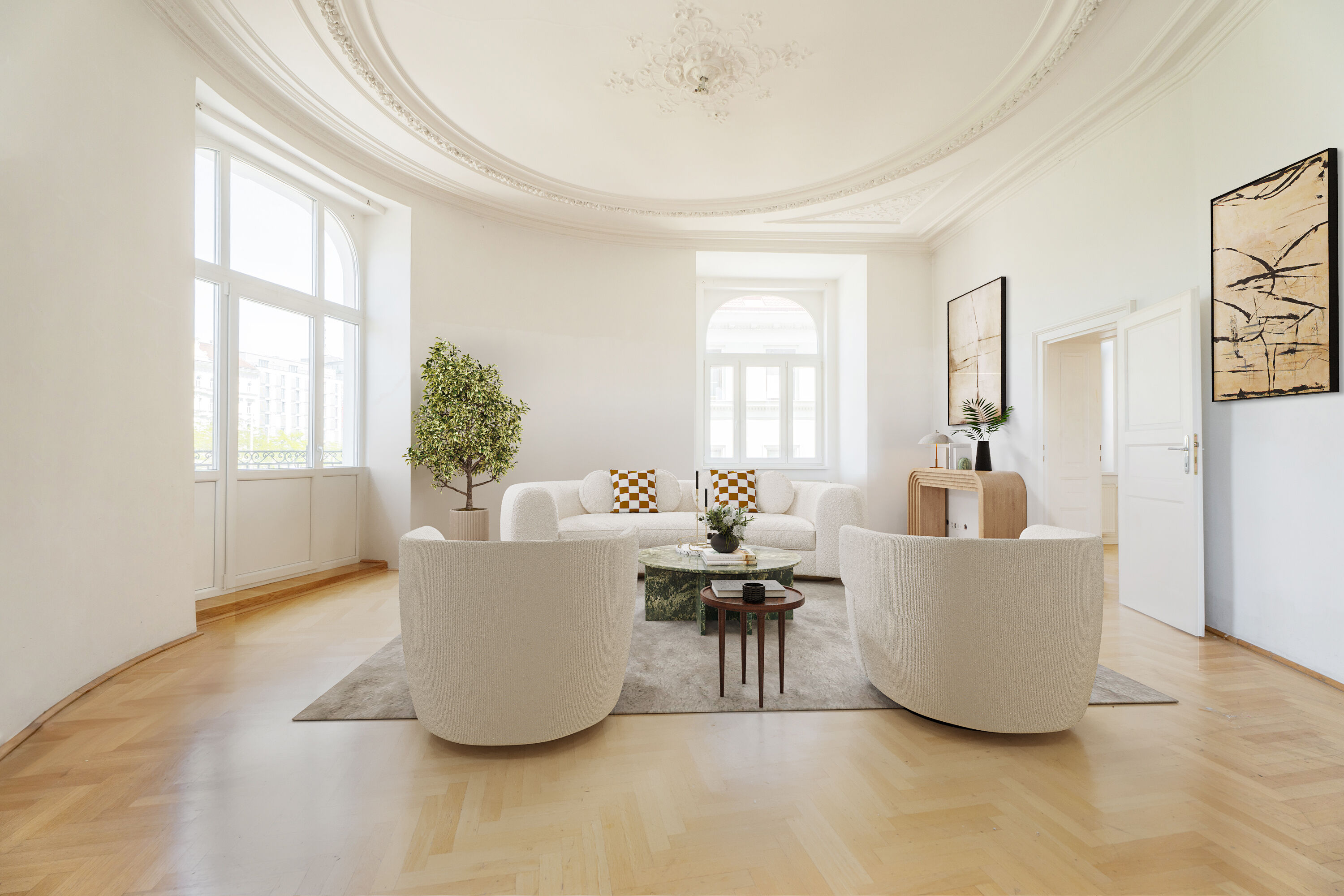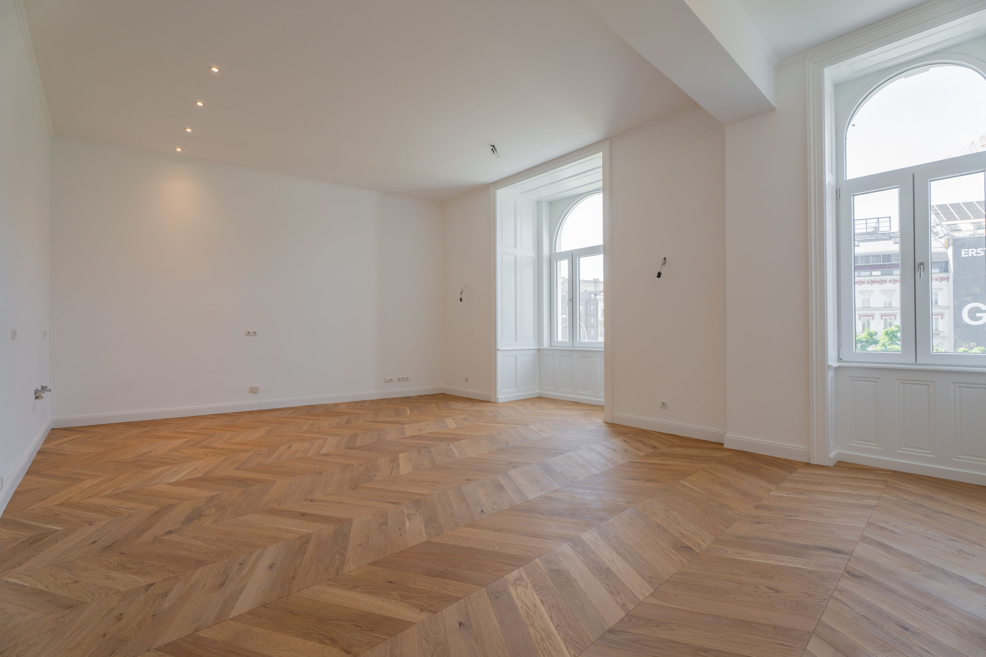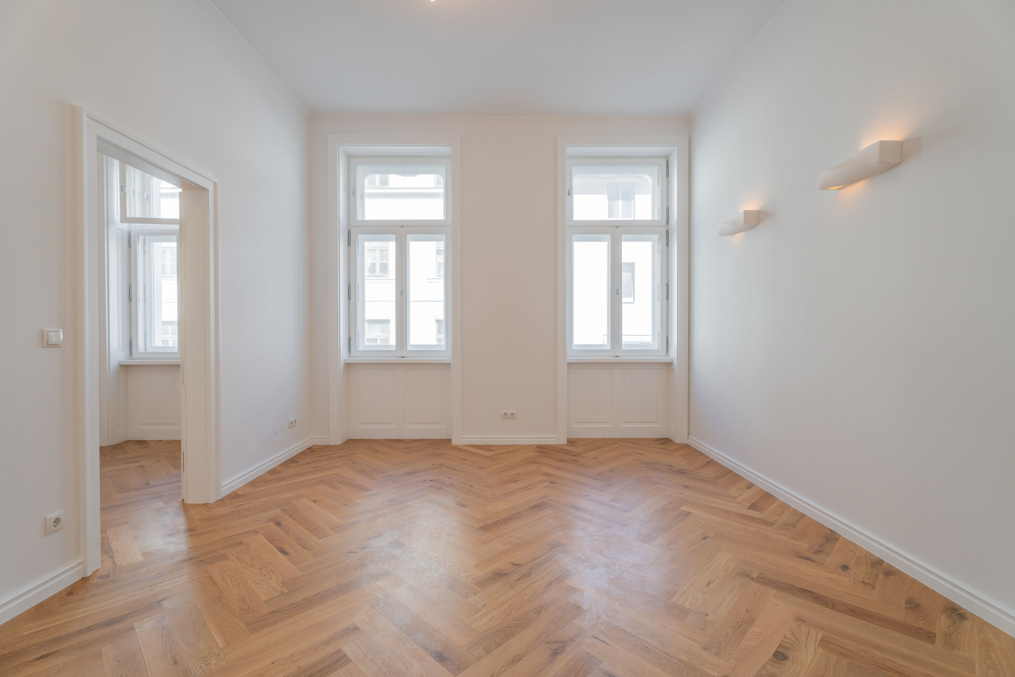 Die charakteristischen Elemente der Jahrhundertwende-Architektur – hohe Räume, Fischgrätparkett, Flügeltüren – sind teilweise erhalten und unterstreichen den einzigartigen Stil des Hauses.