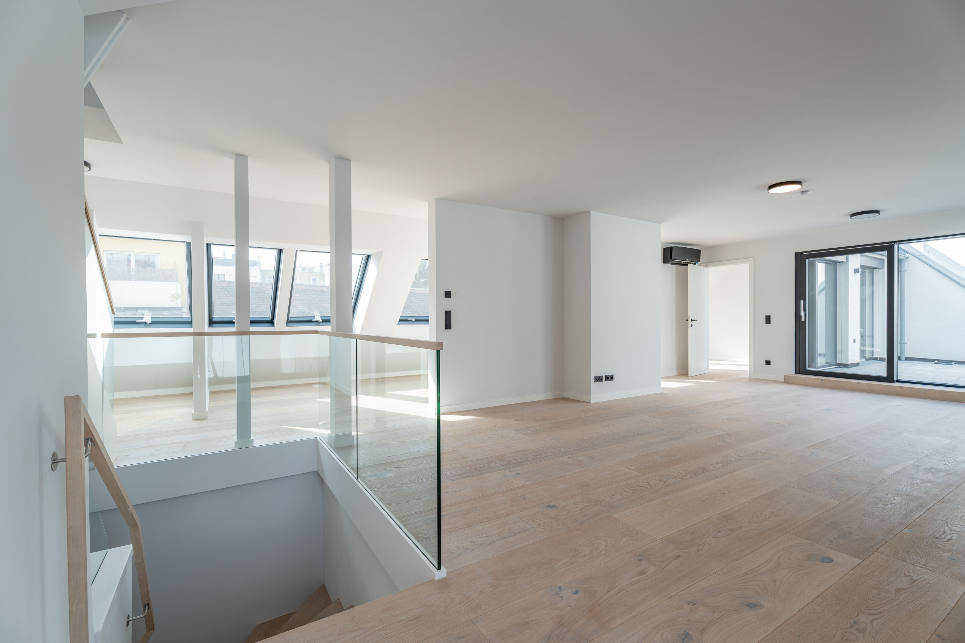 Die Dachgeschosswohnungen – drei Einheiten im 1. Dachgeschoss und das Penthouse im 2. Dachgeschoss – bilden das architektonische Highlight des Projekts. Großzügige Fensterfronten lassen die lichtdurchfluteten Räume erstrahlen und eröffnen eindrucksvolle Ausblicke über die Stadt.