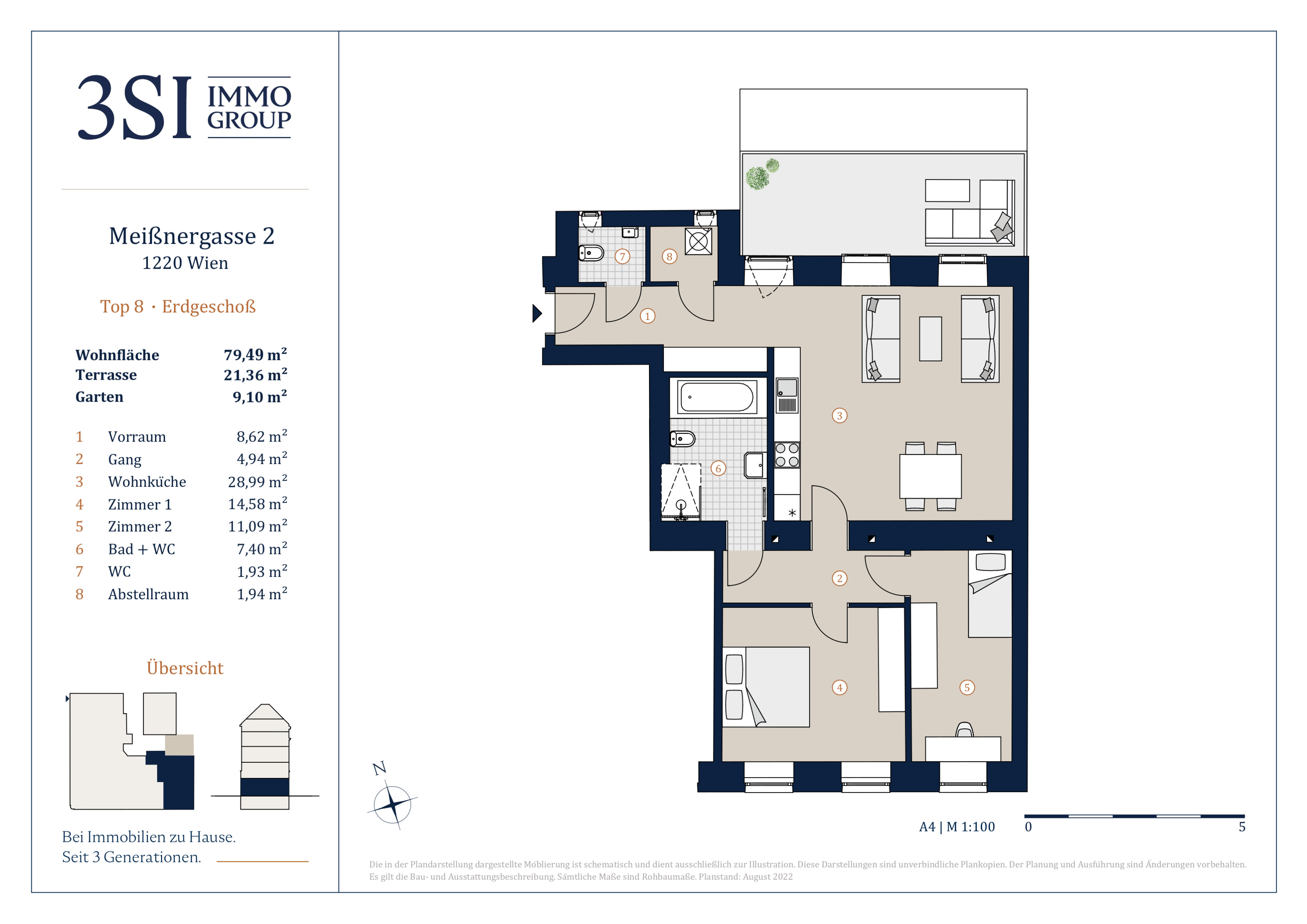 | 8 | Erdgeschoß | 3 | 79,49 m² | 30,46 m² | 9,10 m² | 21,36 m² | € 475.000 | Verfügbar | |||