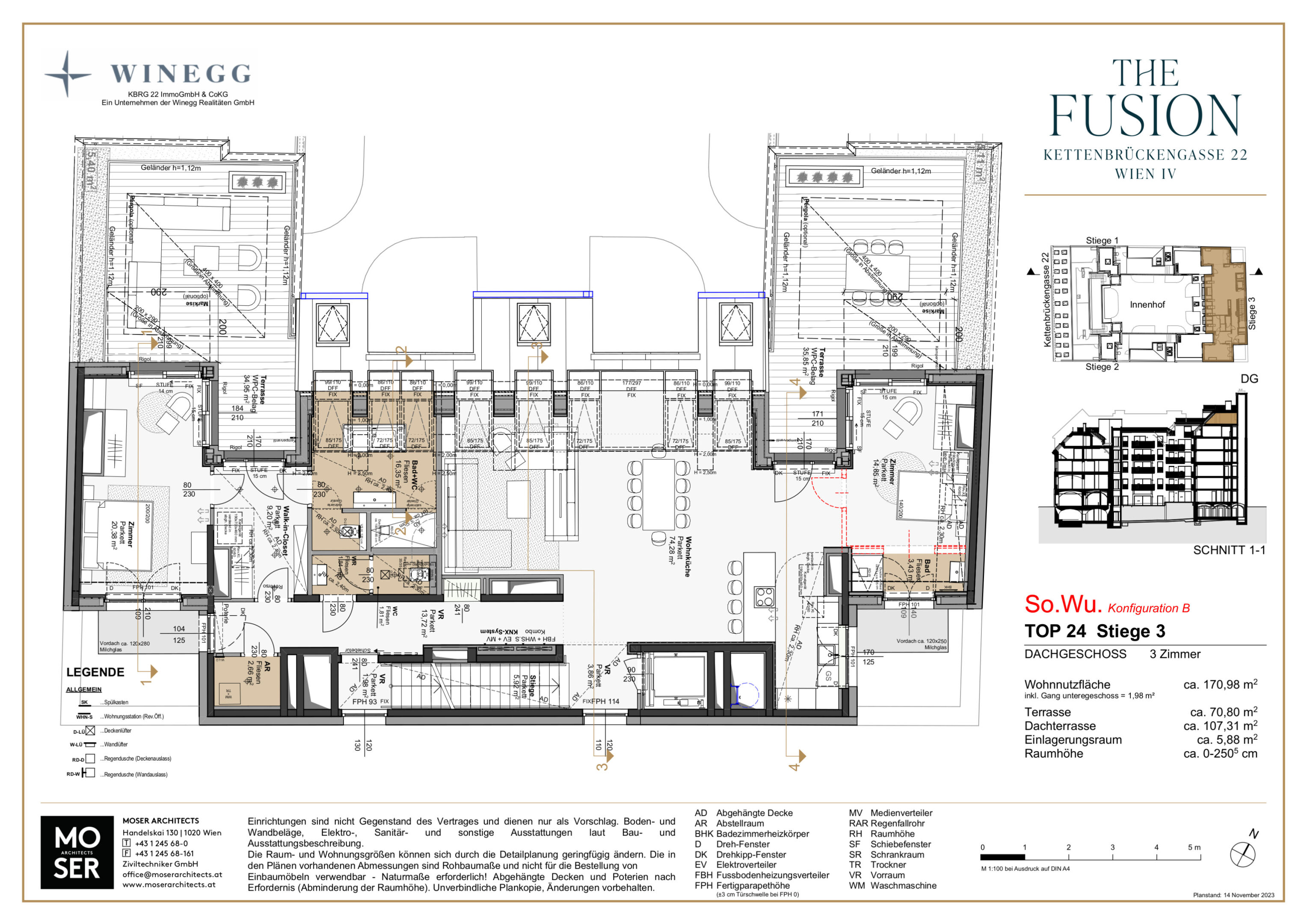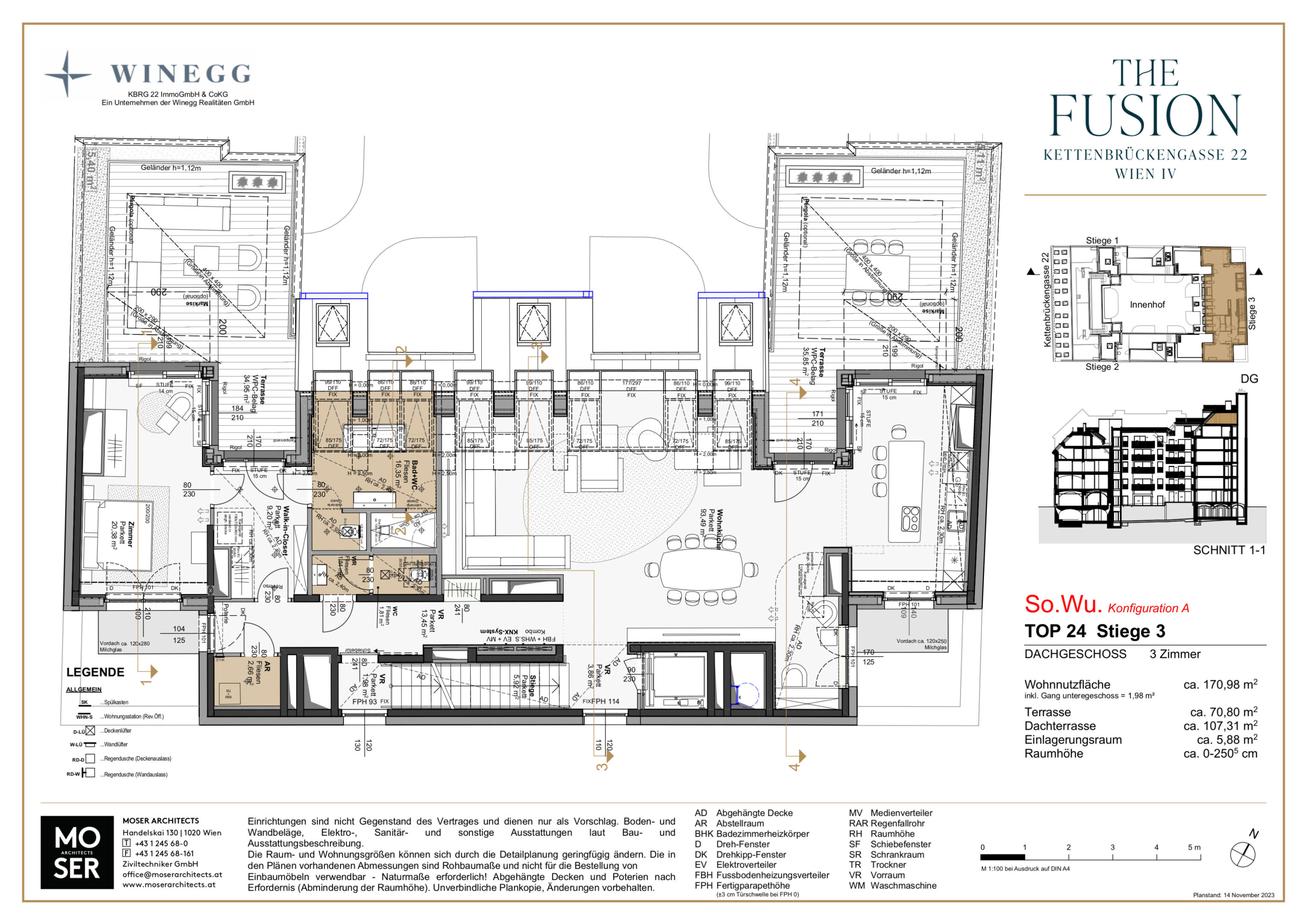 Mit dem Lift gelangt man direkt in den Vorraum des Penthouses, an den die geräumige Wohnküche mit über 60 qm angrenzt. Zu beiden Seiten dieses außergewöhnlichen Dachgeschoßes befindet sich eine Terrasse mit je ca. 38 qm, welche vom Wohnraum sowie zwei der drei Schlafzimmer zu begehen sind. Des Weiteren bietet dieses Objekt zwei Bäder, zwei Toiletten und einen Abstellraum. Die Raumhöhe beträgt ca. 2,52 m.