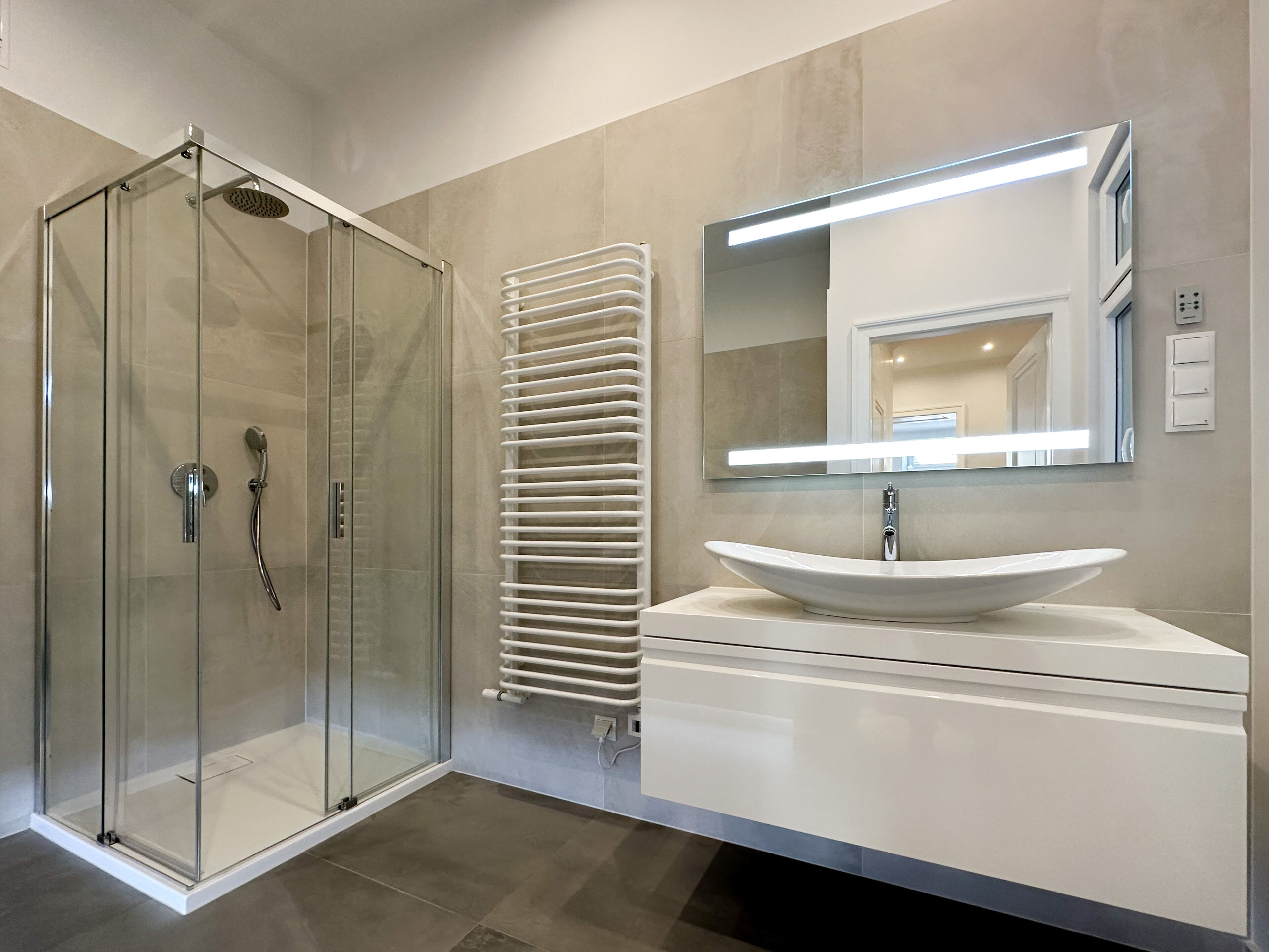 - Badezimmer mit Waschtisch, Badewanne und Dusche