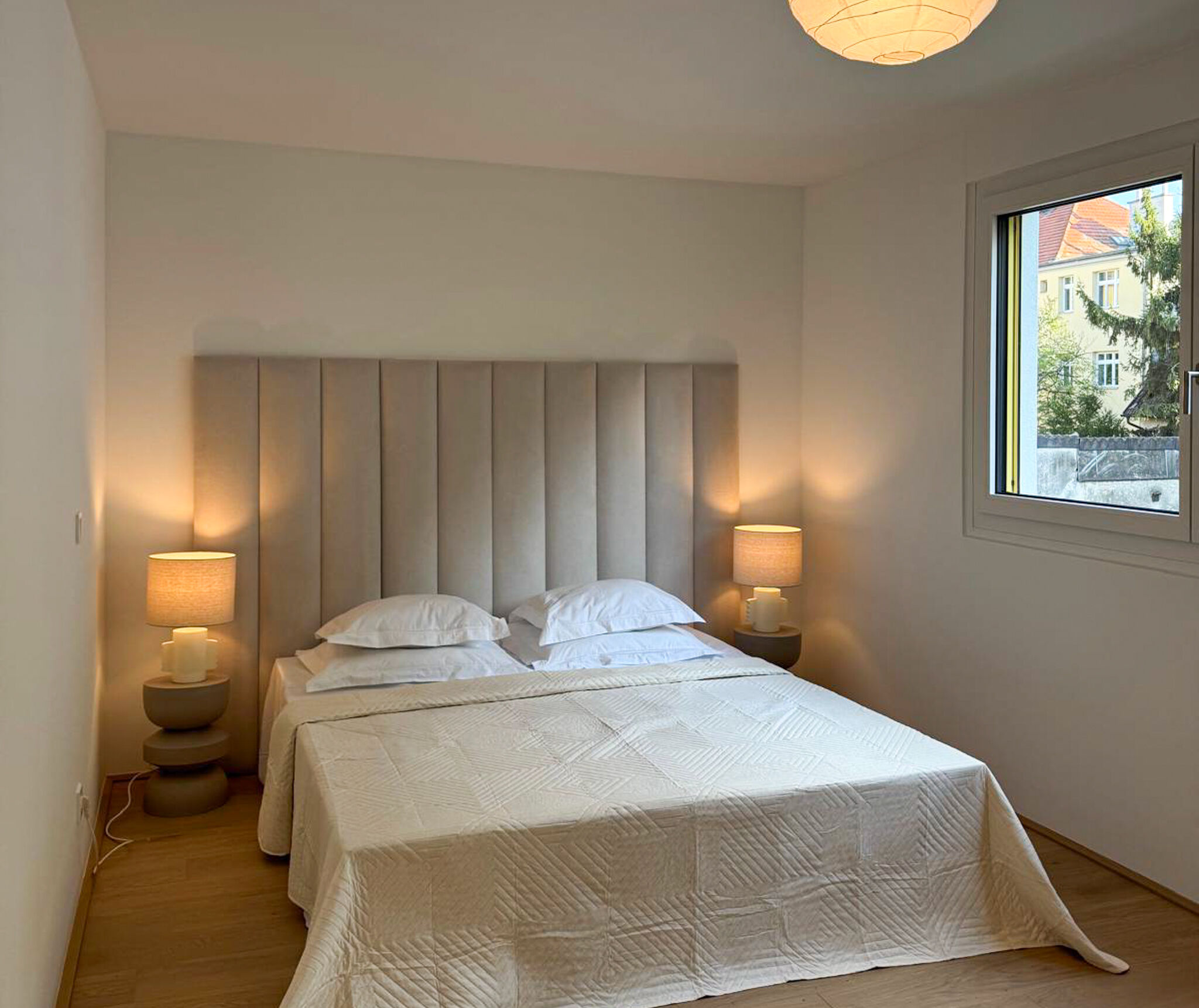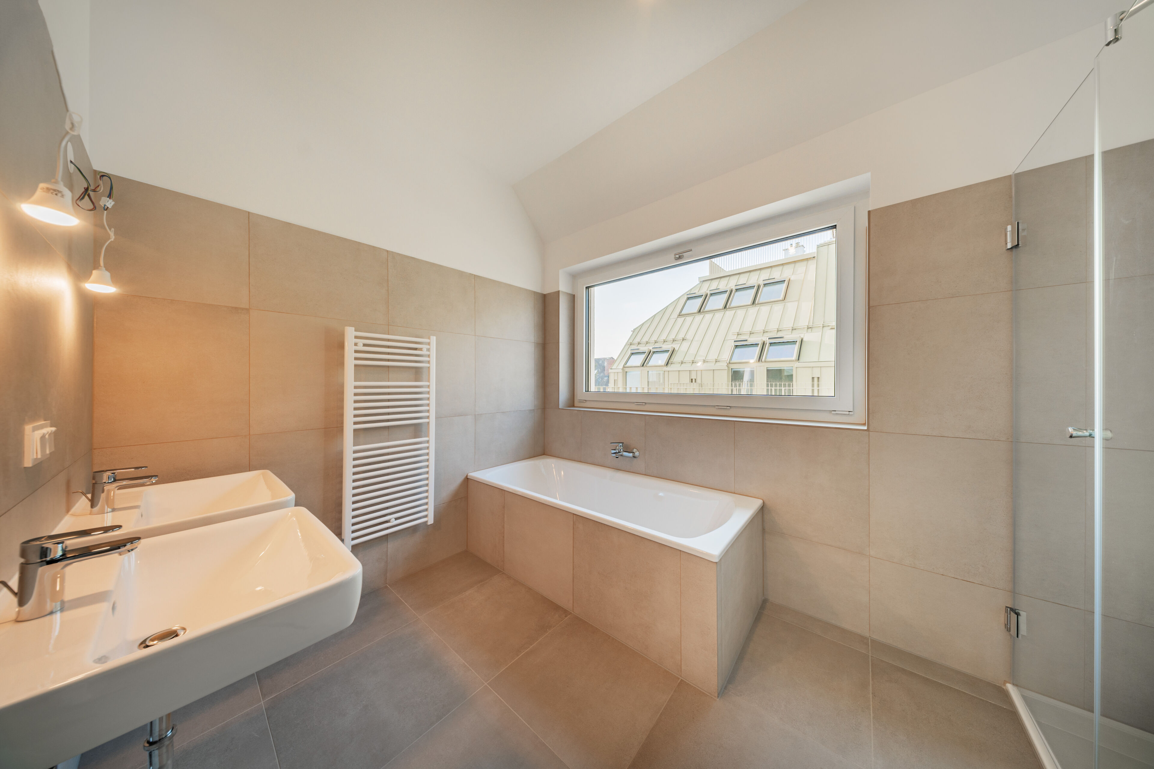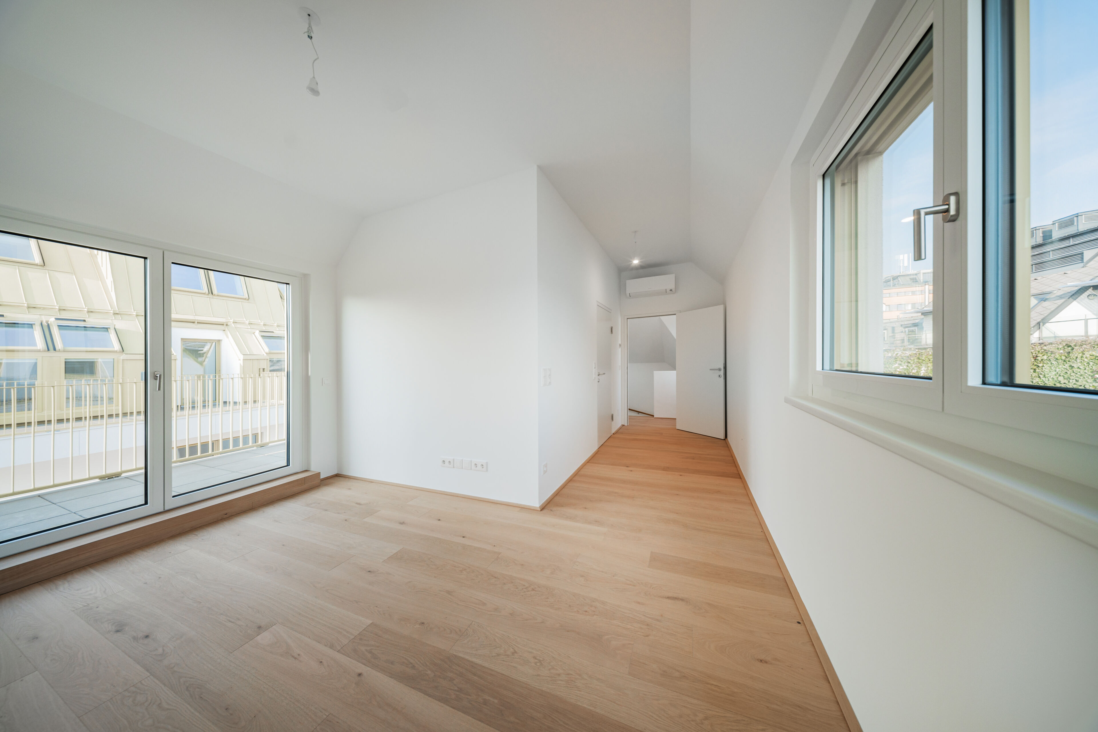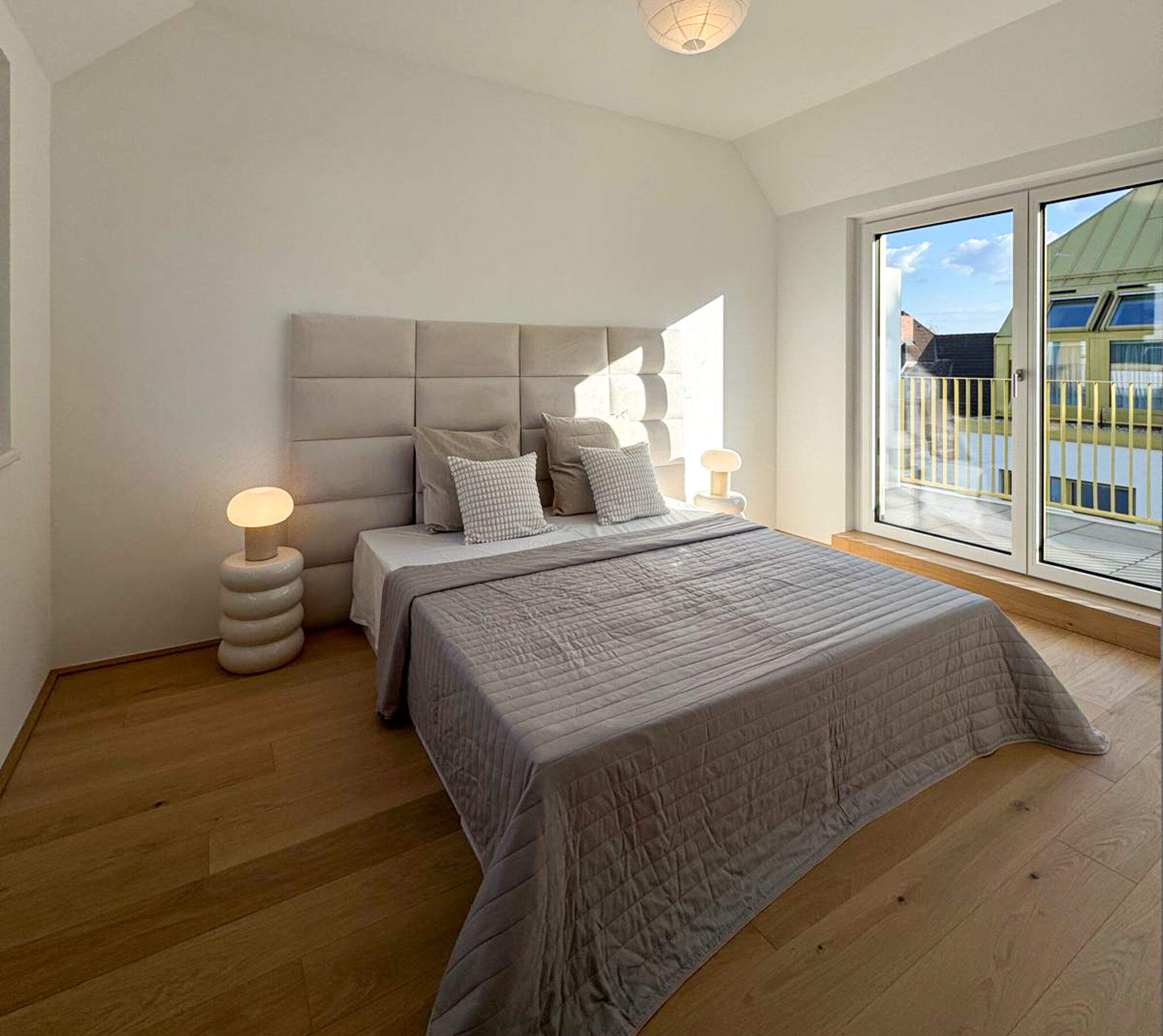 fluten, zugleich geben Ihnen steuerbare Raffstores und Rollläden die Flexibilität, die Lichtverhältnisse nach Belieben anzupassen. Dank der Fußbodenkühlung und -heizung haben Sie die Möglichkeit, die Temperatur in jedem Raum individuell zu regulieren. Für zusätzlichen Komfort sind die Dachgeschoßwohnungen mit Fan-Coils für die Raumklimatisierung ausgestattet. Die warmen Eichenparkettböden verleihen den Wohnräumen eine gemütliche Atmosphäre, während die hochwertigen Markensanitärprodukte und die exquisite Ausstattung der Badezimmer zu einem erhöhten Wohlbefinden beitragen. Erleben Sie mit „The Liberty“ die Freude des Wohnens auf einem neuen Level!
