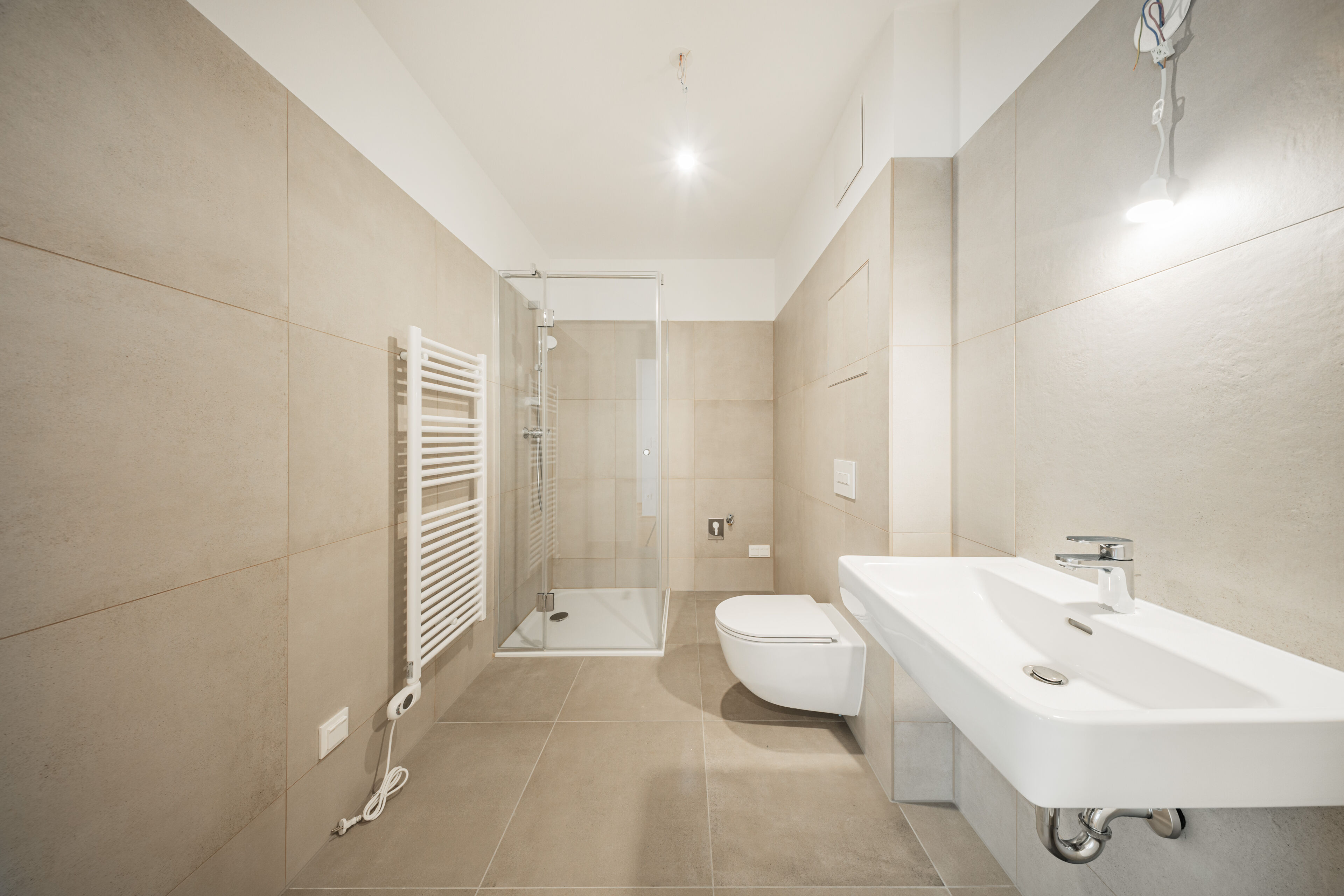 - Badezimmer mit Dusche, WC und Waschmaschinenanschluss