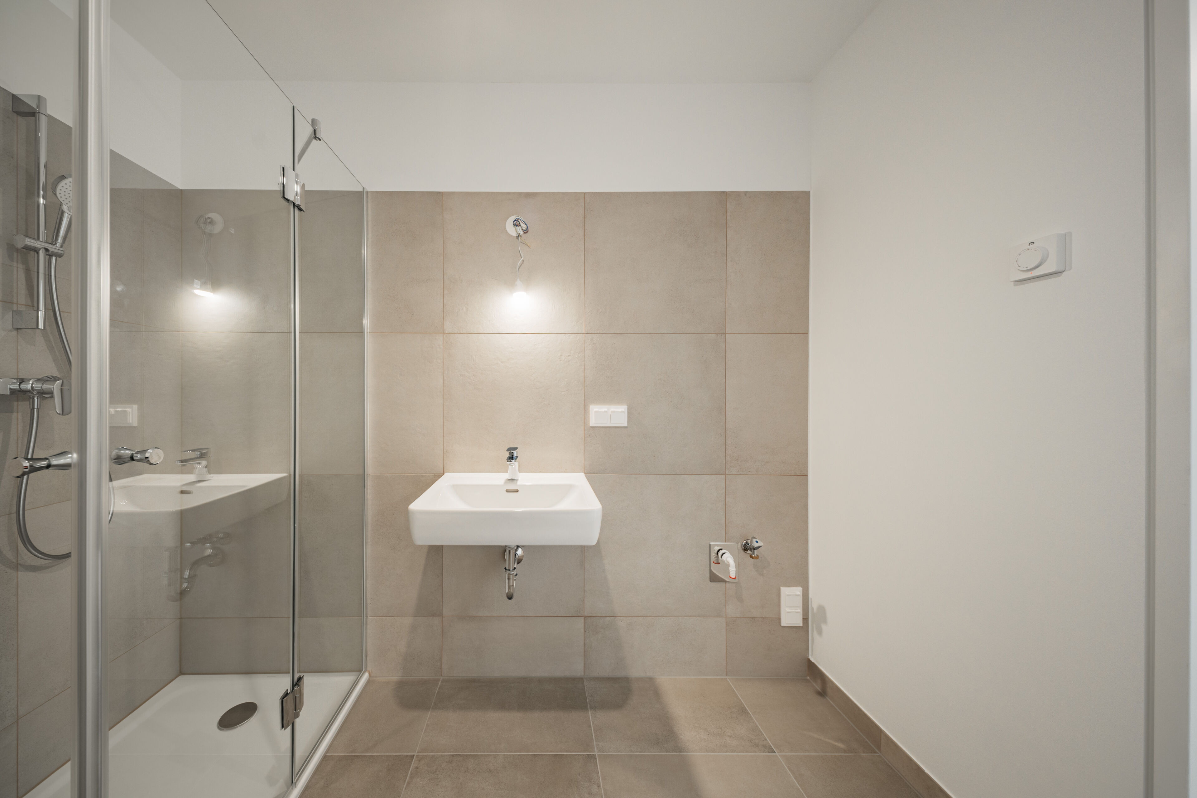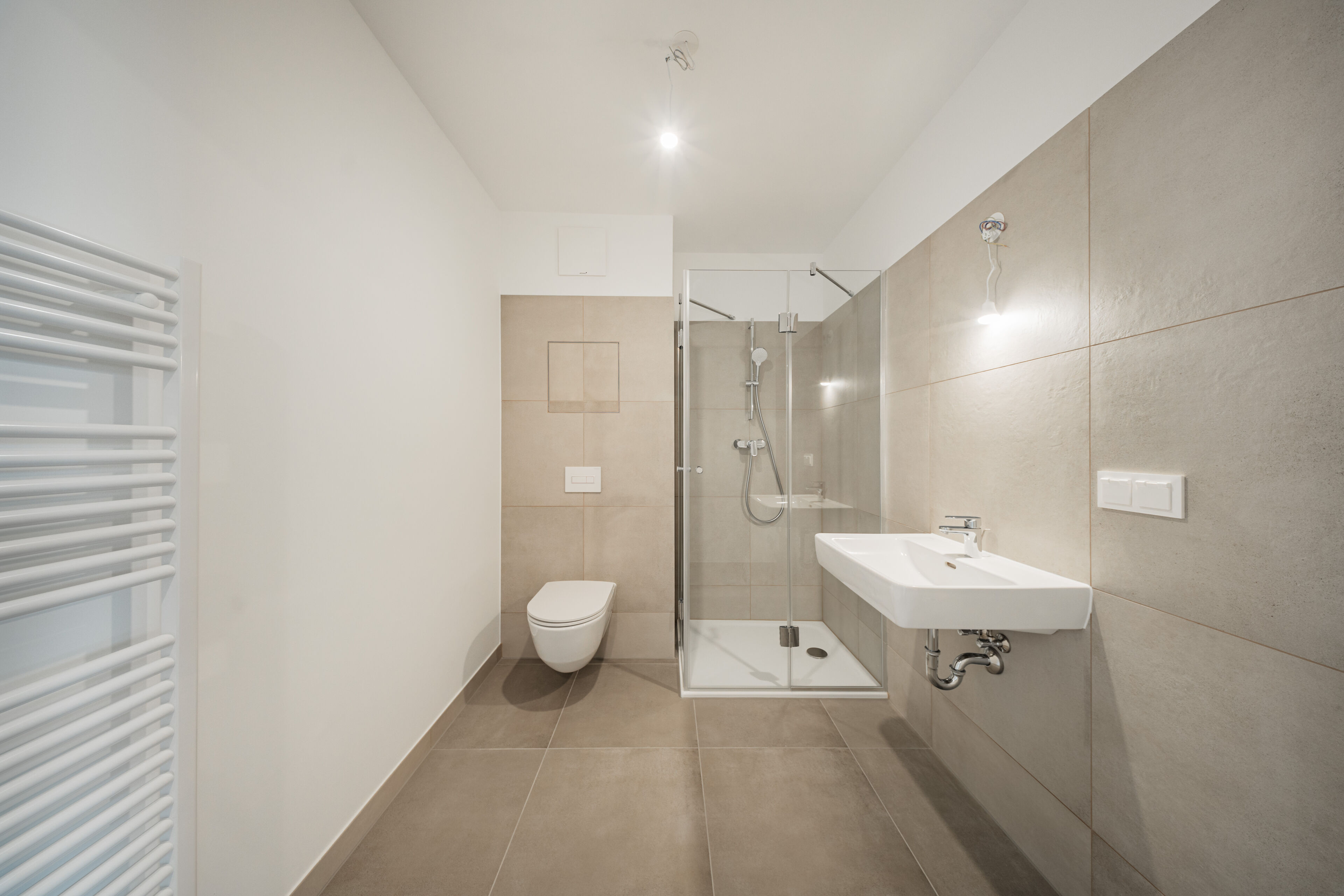 - Badezimmer mit Dusche, WC und Waschmaschinenanschluss