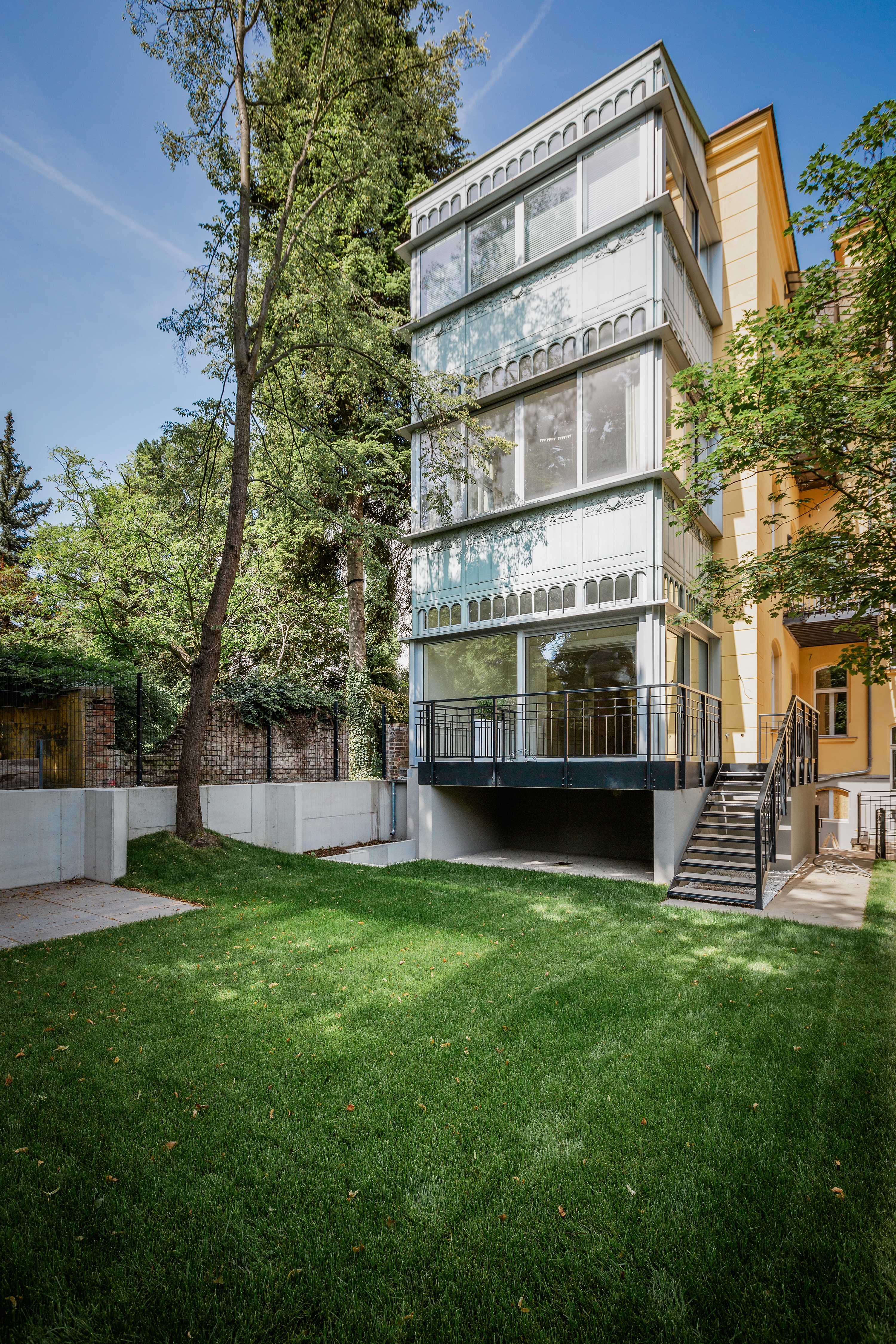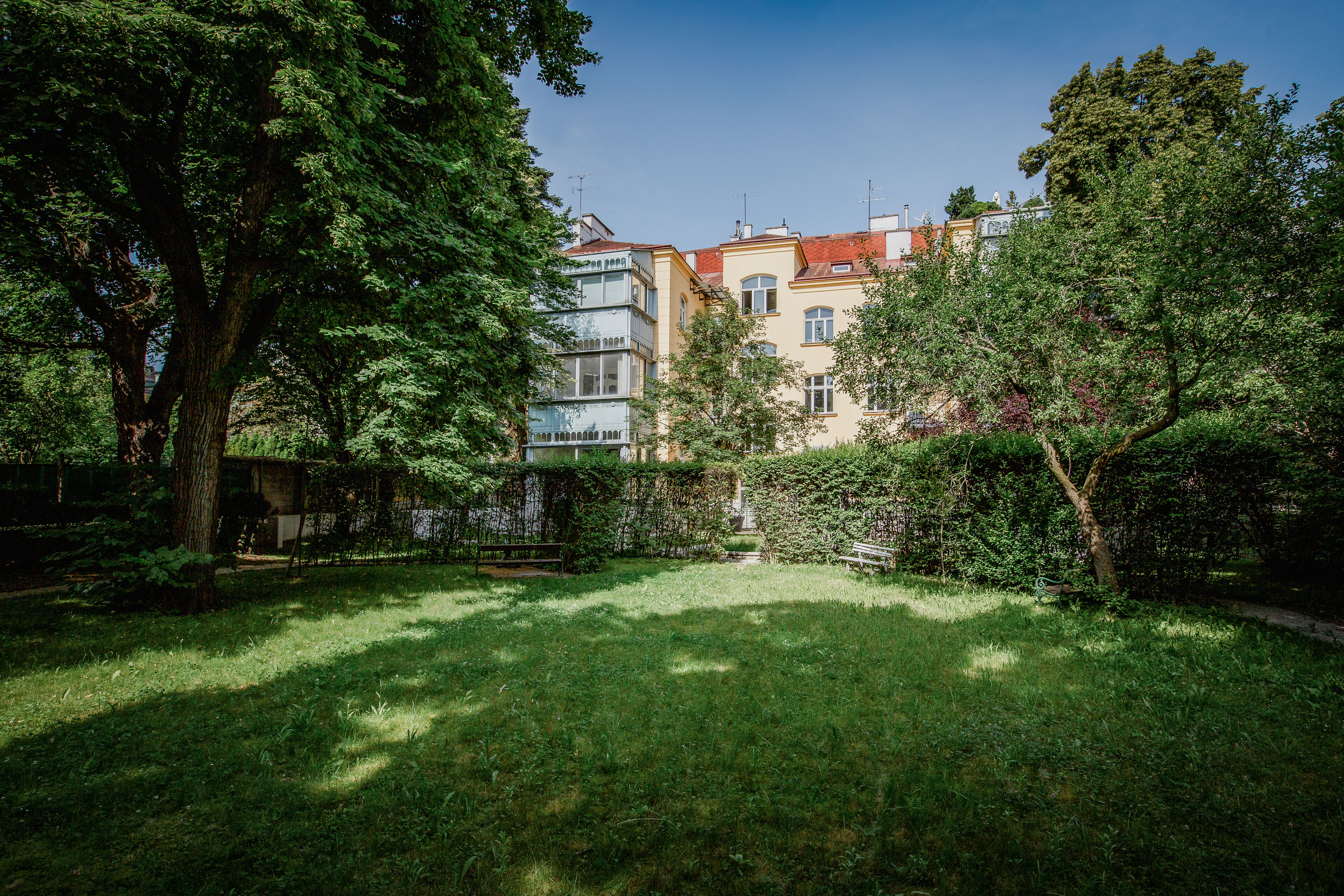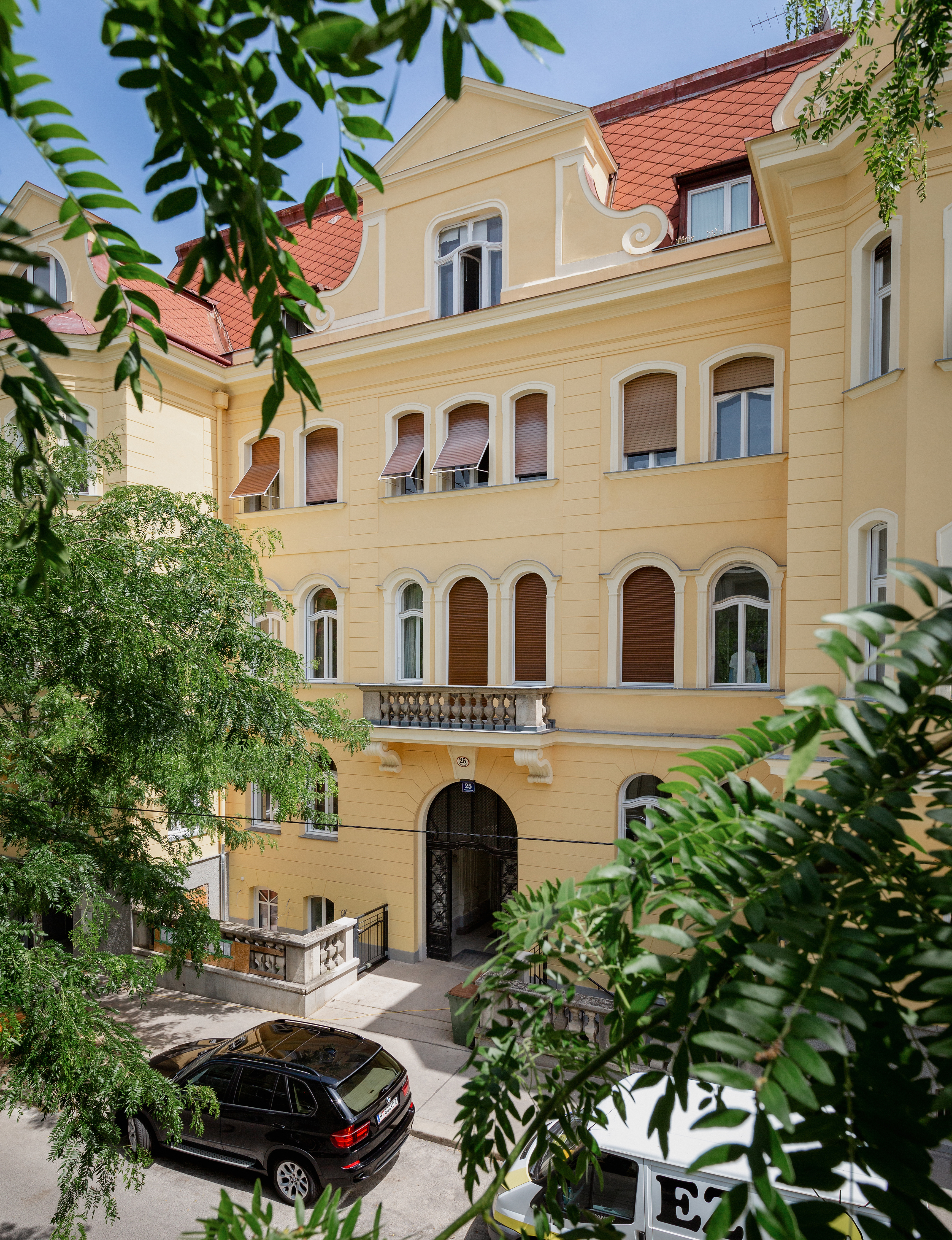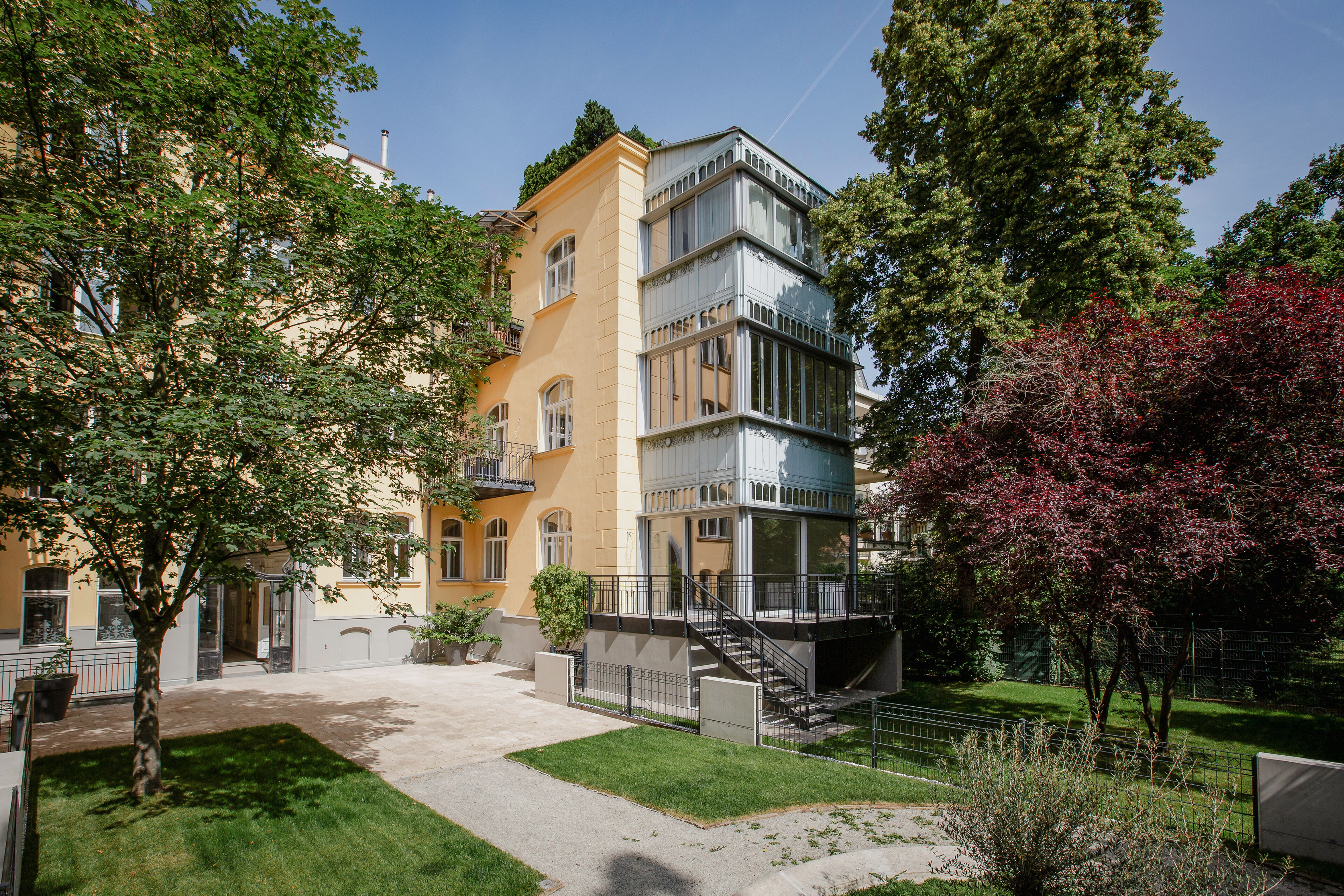 In der malerischen Kulisse der Wattmanngasse verbirgt sich ein Ort, an dem die Zeit stillzustehen scheint. Erbaut um die Jahrhundertwende, prägen gotische und klassizistische Elemente den historischen Stilaltbau in der Wattmanngasse 25. Das helle Schönbrunner Gelb und die weiß gestrichenen Faschen fügen sich zu einer prächtigen Fassade der Wiener Gründerzeit. Das 4-geschoßige Haus wurde mit Bedacht auf die Bausubstanz saniert und verzaubert mit geschwungenen Holzfenstern und Dachgiebeln im Alt-Wien-Stil. Den Auftakt der traditionellen Villa bildet das repräsentative Entrée. Der Eingangsbereich glänzt mit prachtvollem Stuck und goldenen Art-nouveau-Elementen. Die mit Ornamenten verzierten Fensterflächen im Stiegenhaus bieten einen herrlichen Blick in den wunderschönen, geschichtsträchtigen Garten des Ensembles. Darüber hinaus sorgt ein Aufzug für Barriere freien Komfort.