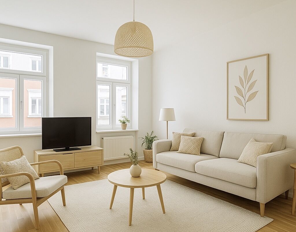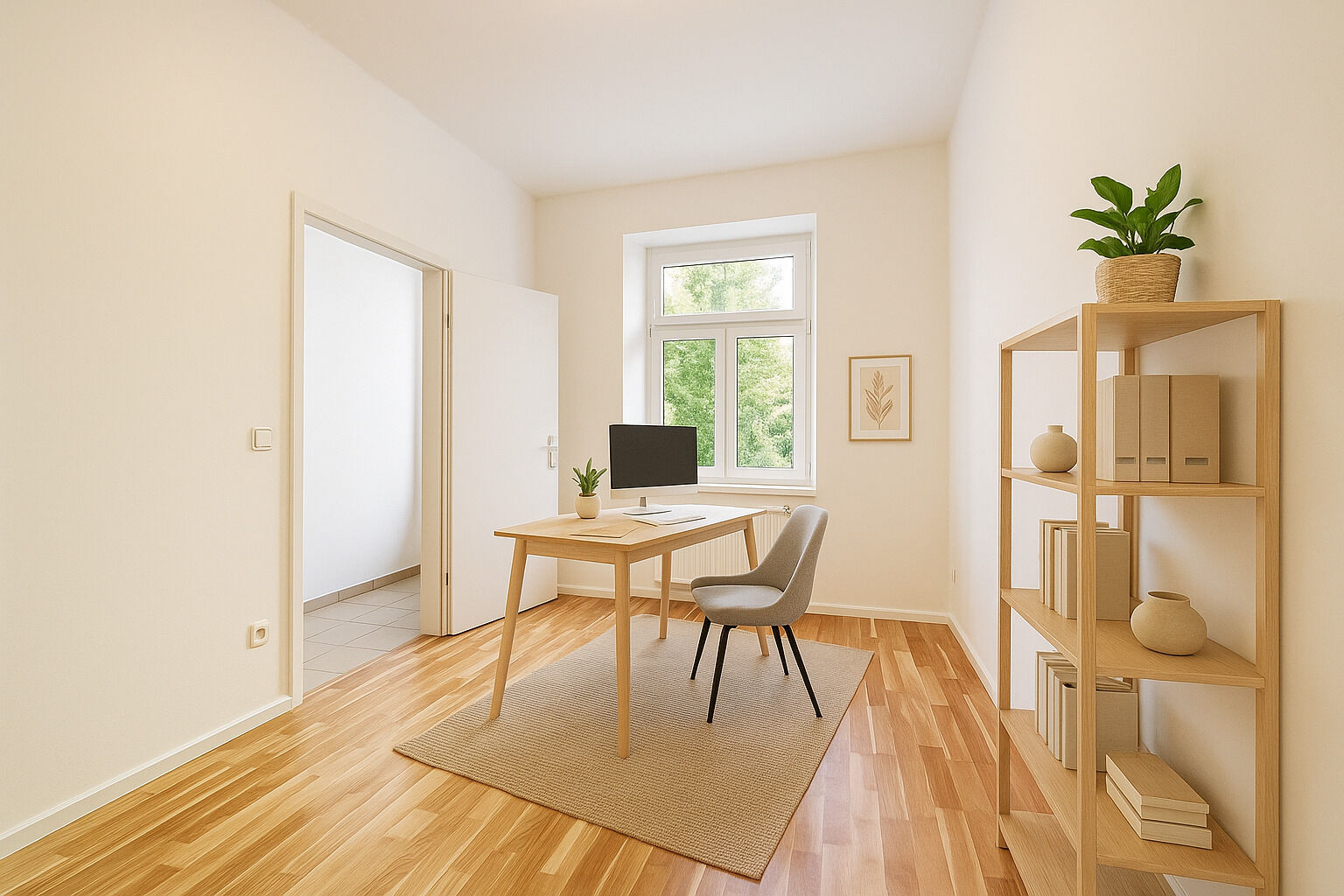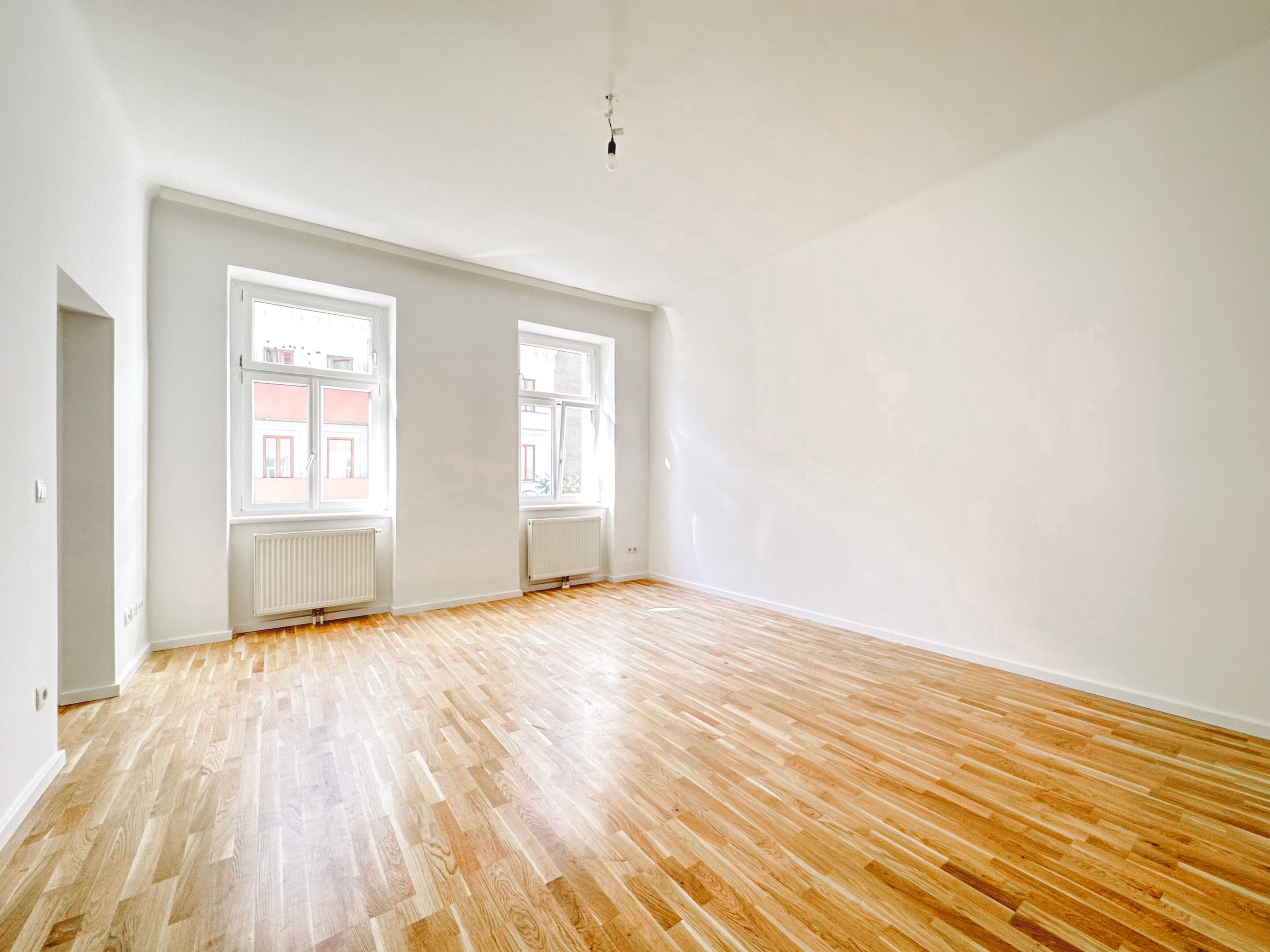 Der großzügige helle Wohnraum, welcher straßenseitig ausgerichtet ist, bietet genügend Platz für einen gemütlichen Wohn- und Essbereich.
