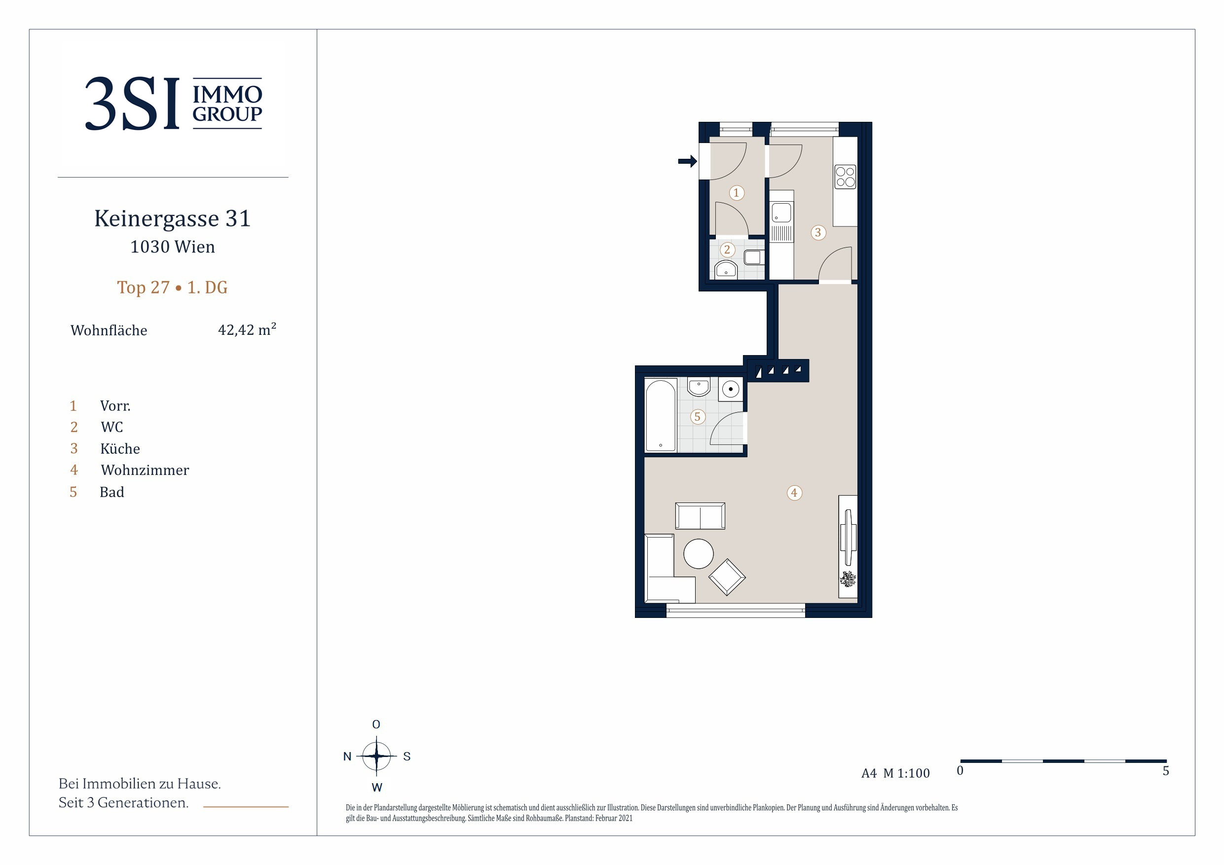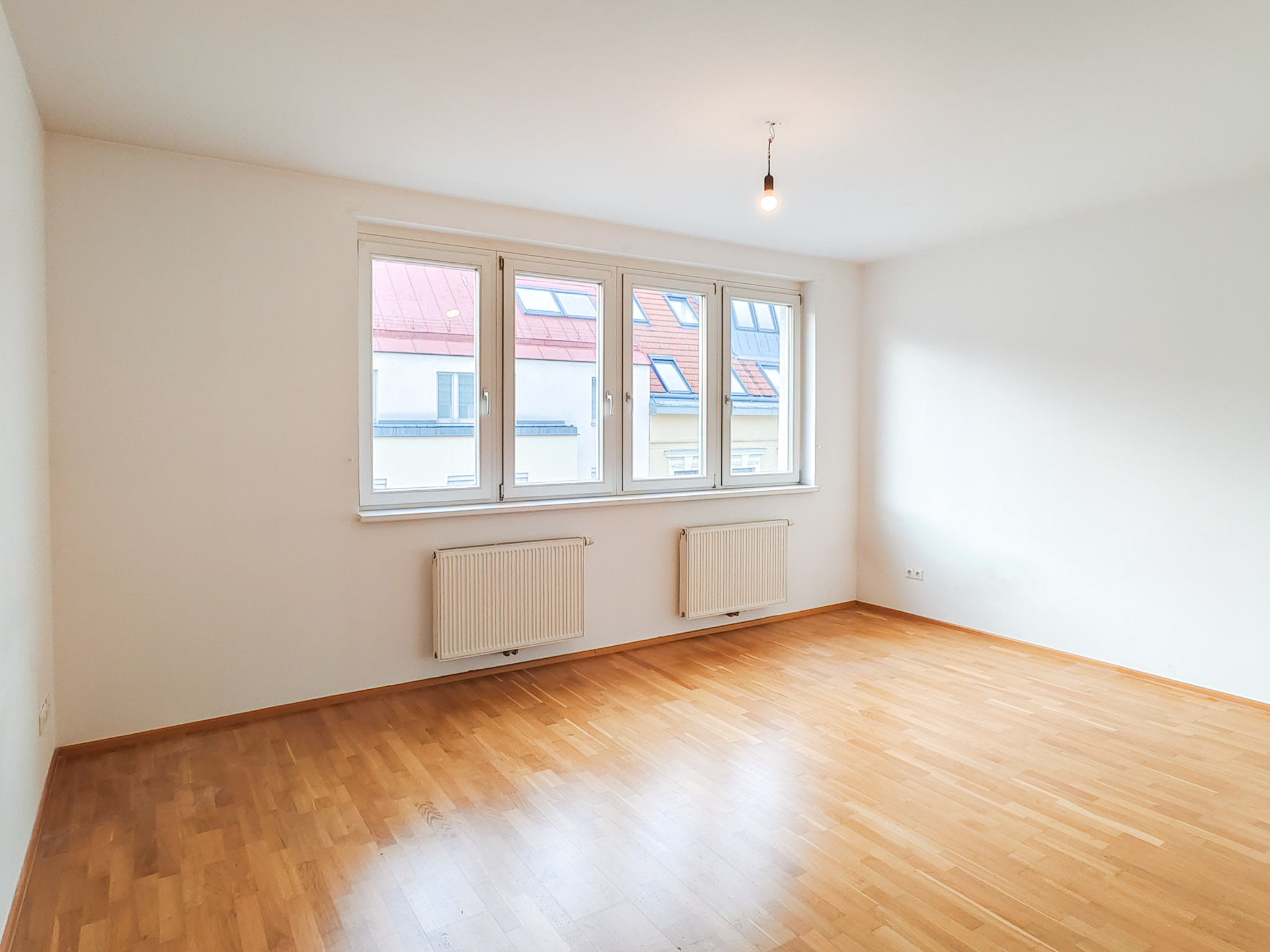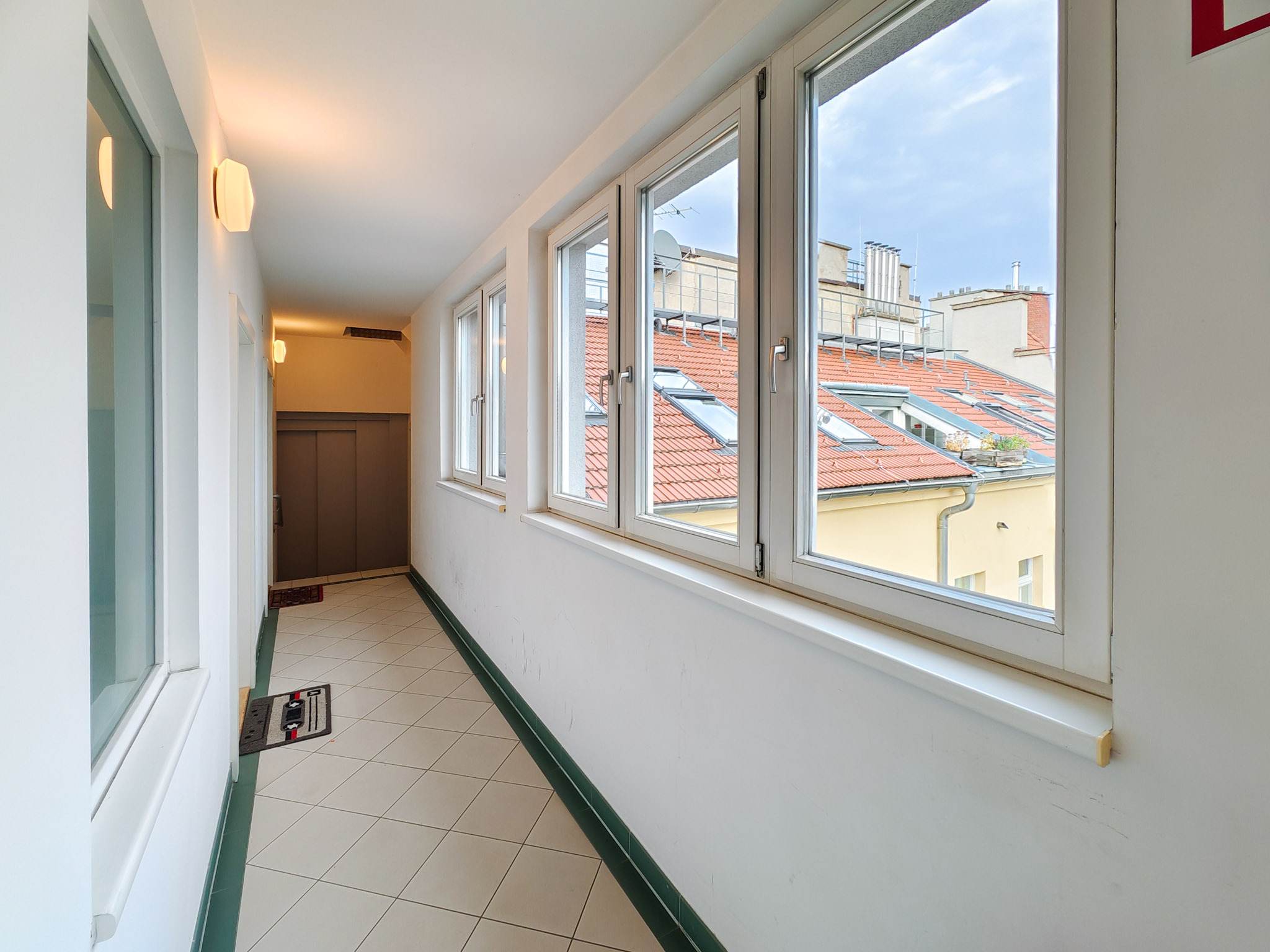 Bezugsfertige knapp 43 m² große Dachgeschoßwohnung in ruhiger Seitengasse nahe der Landstraßer Hauptstraße. Sie ist straßenseitig nach Westen und hofseitig nach Osten ausgerichtet und teilt sich wie folgt auf: