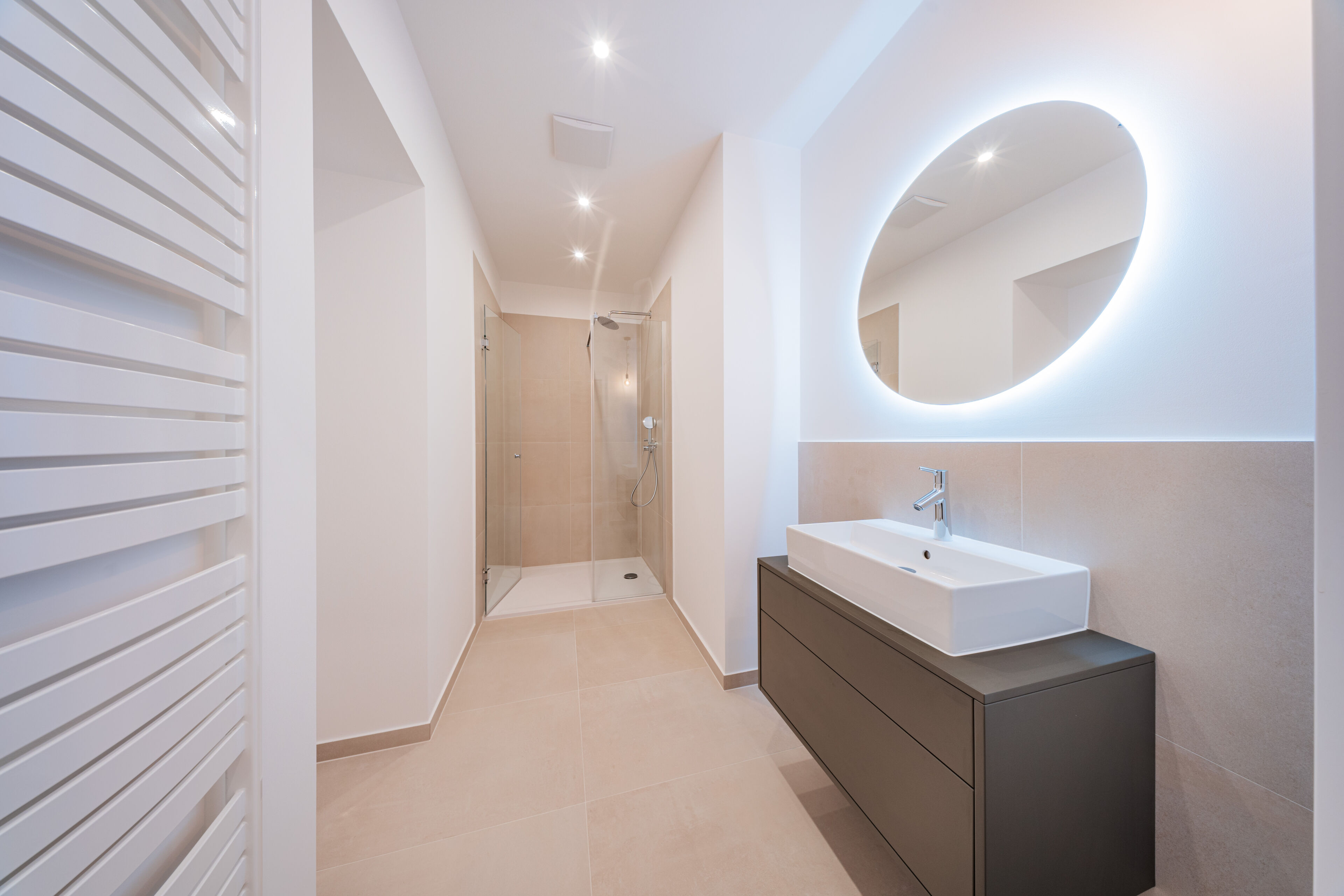 Diese moderne 3-Zimmer-Wohnung überzeugt mit ihrem durchdachten Grundriss zur Gänze. Die Wohnräume sind westlich ausgerichtet. Vom Vorraum aus, gelangt man in die Nassräume, sowie die großzügige Wohnküche. Die beiden Zimmer grenzen an den Wohnraum an und lassen sich zentral begehen. Die Nassräume sind mit hochwertigem Feinsteinzeug und Markenarmaturen ausgestattet. Das Badezimmer beinhaltet eine moderne Walk-In Dusche, sowie ein Handwaschbecken und einen Waschmaschinenanschluss.