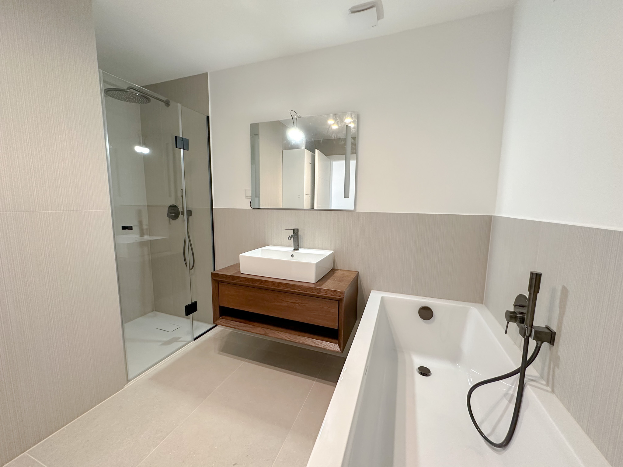 - Badezimmer mit Badewanne, Dusche und Waschmaschinenanschluss
