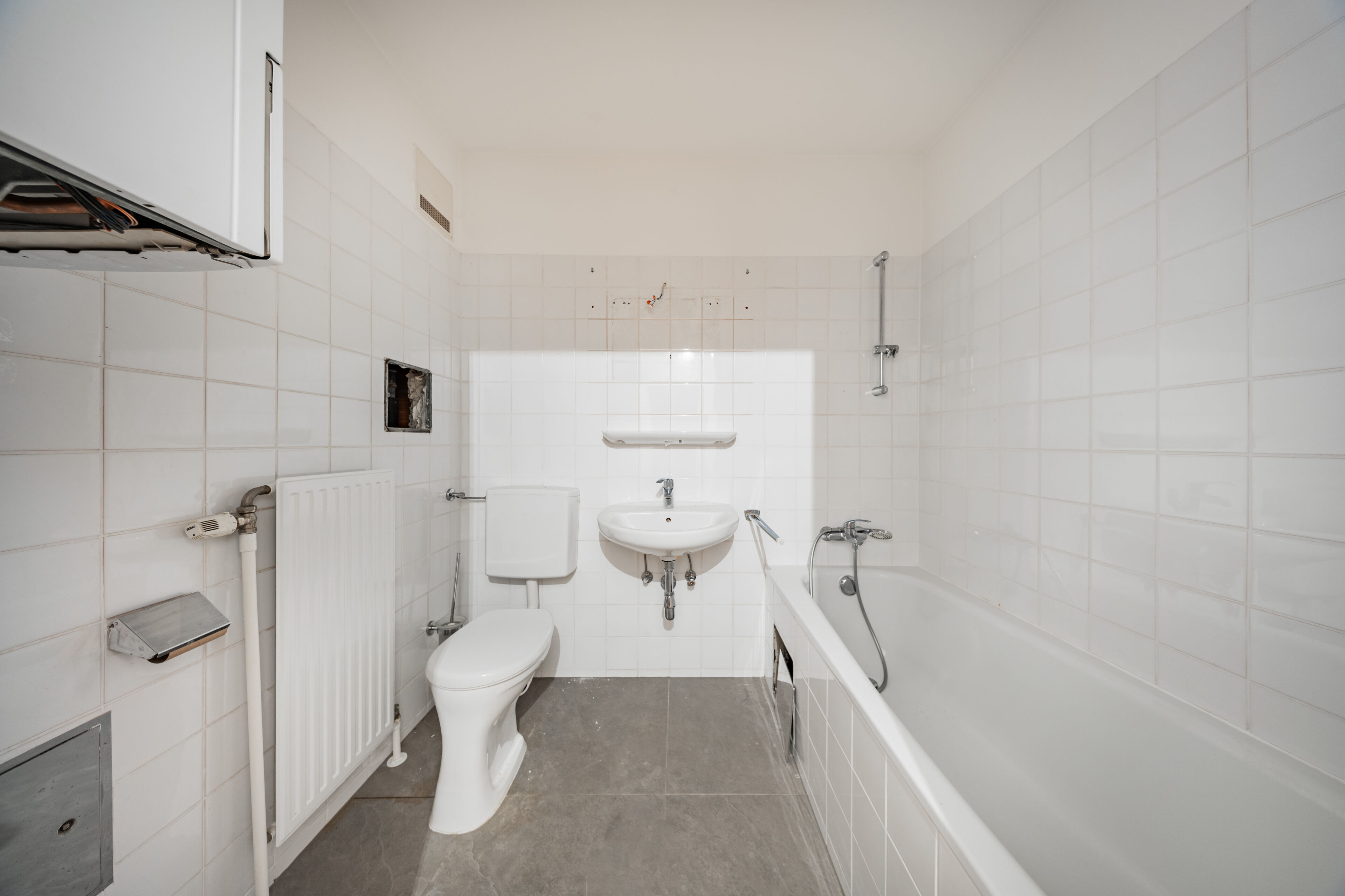 - Badezimmer mit Badewanne, WC und Waschmaschinenanschluss