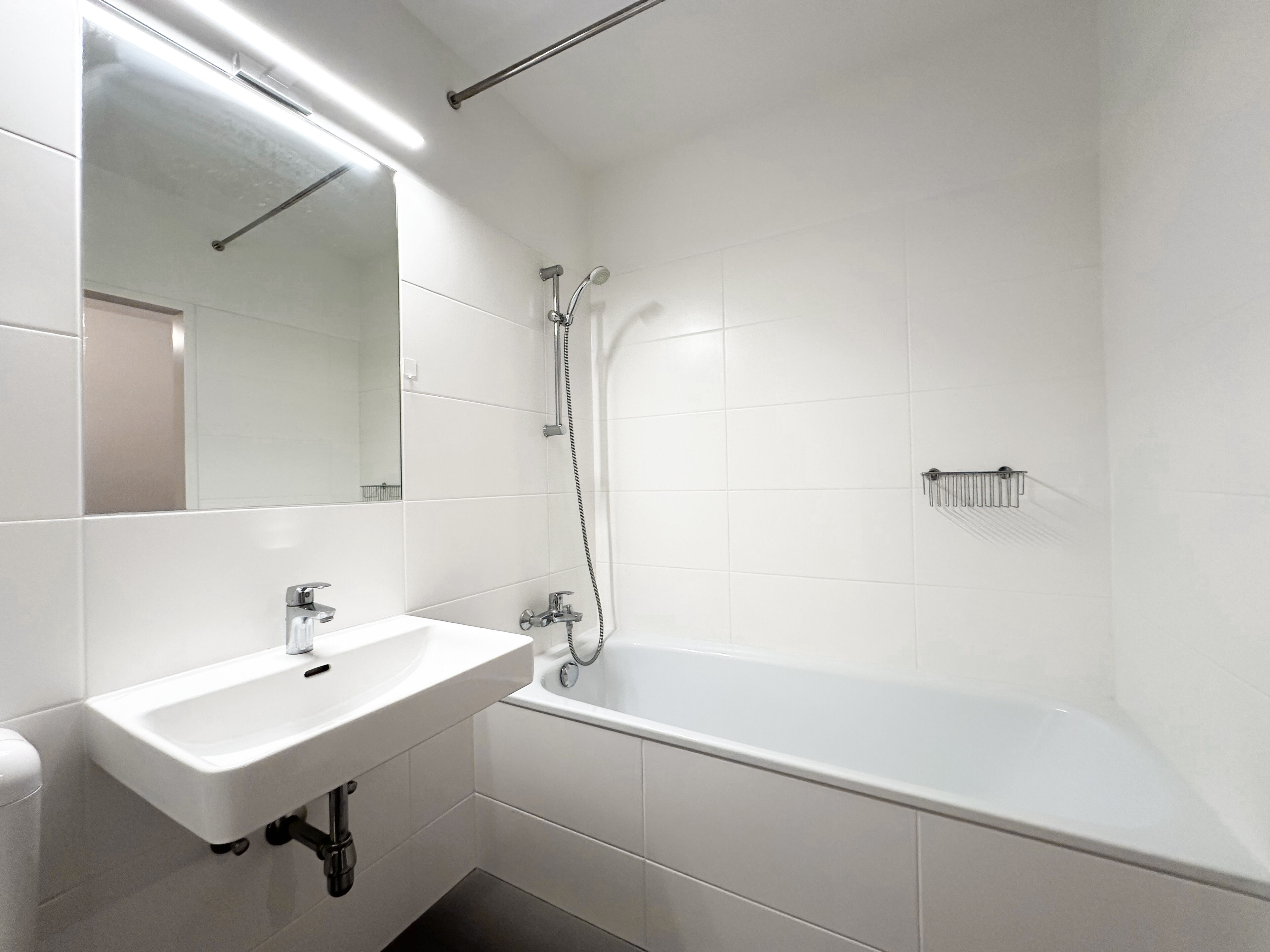 - Badezimmer mit Badewanne, WC und Waschmaschinenanschluss