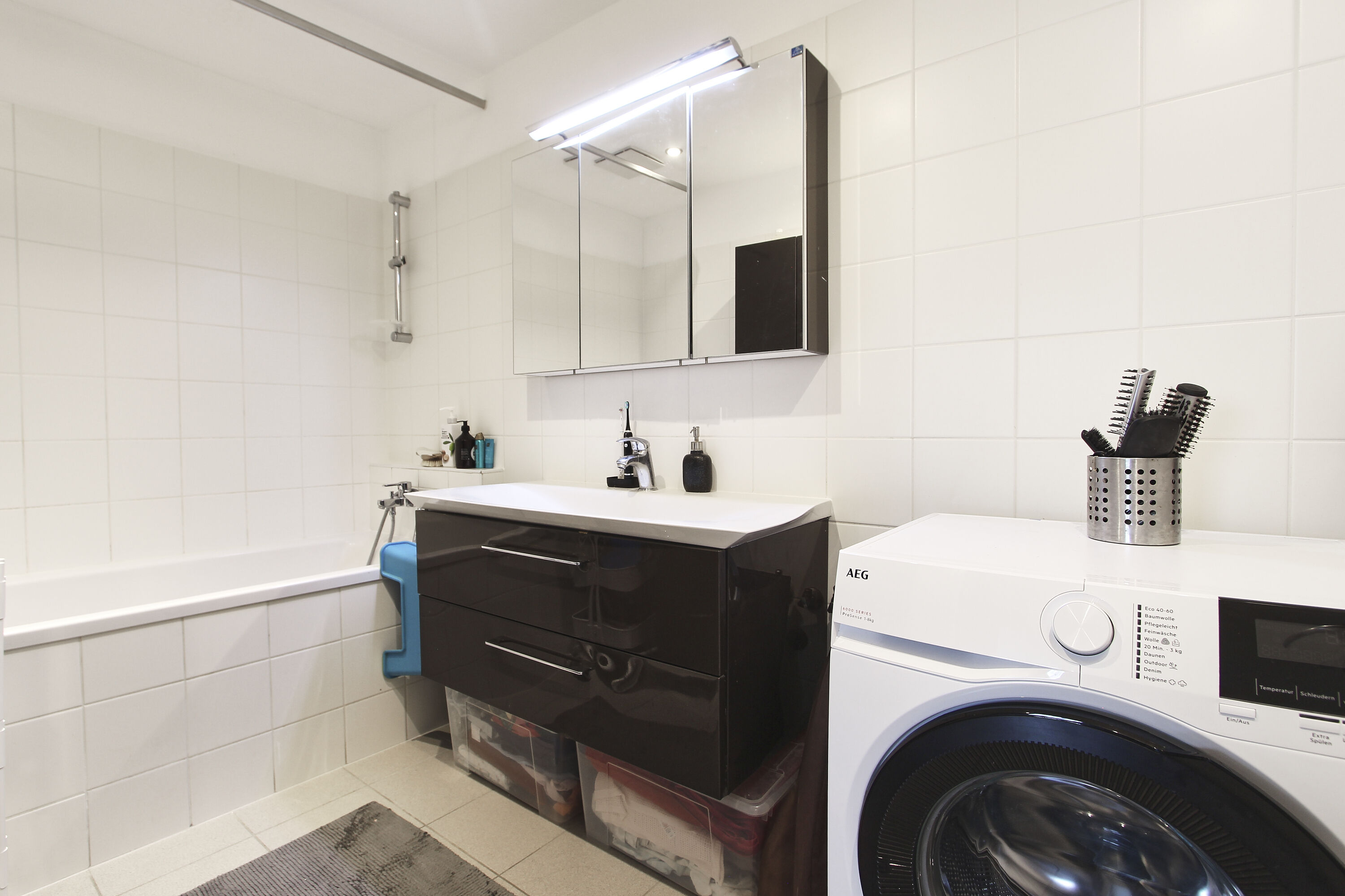 - Badezimmer mit Badewanne und Waschmaschinenanschluss
