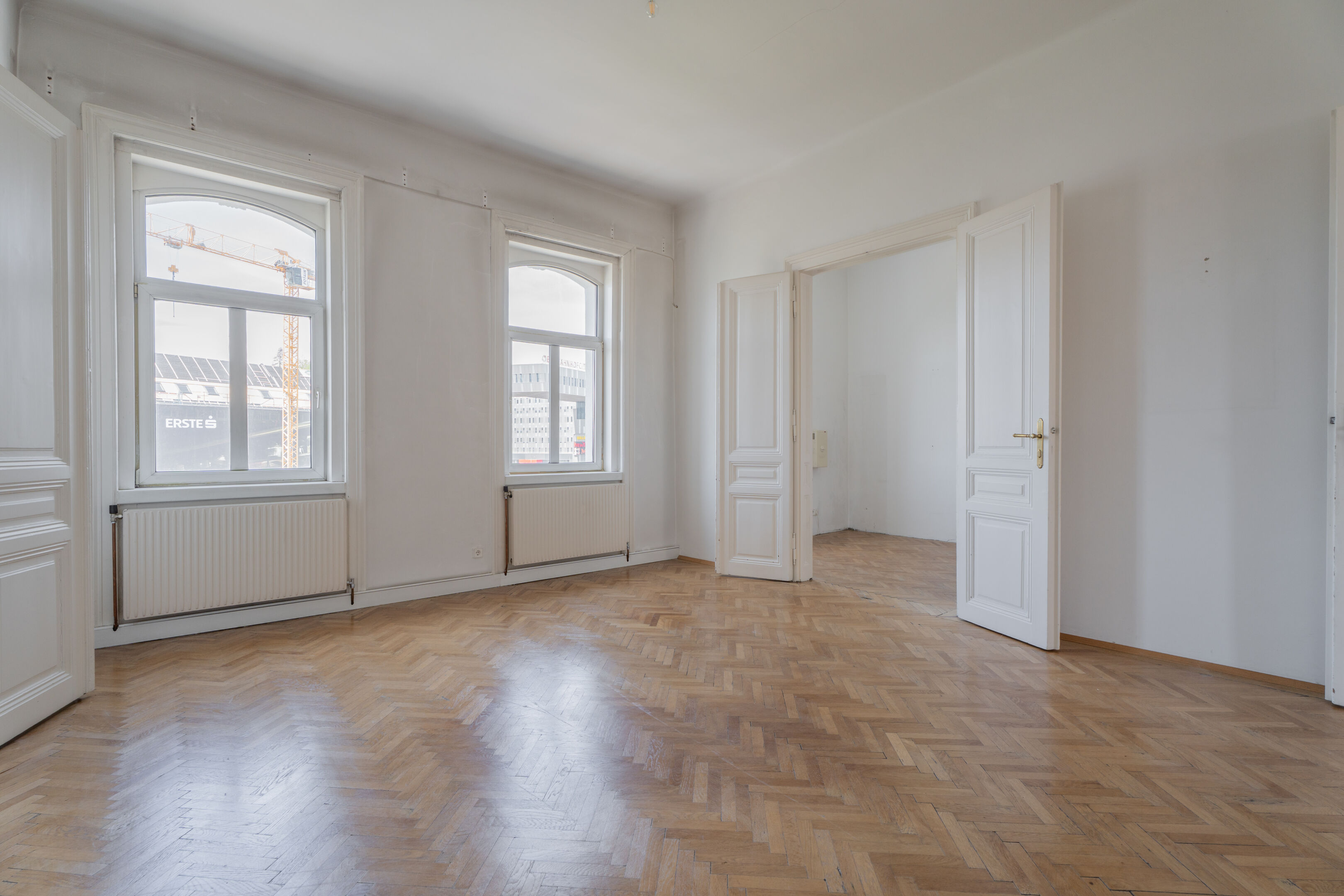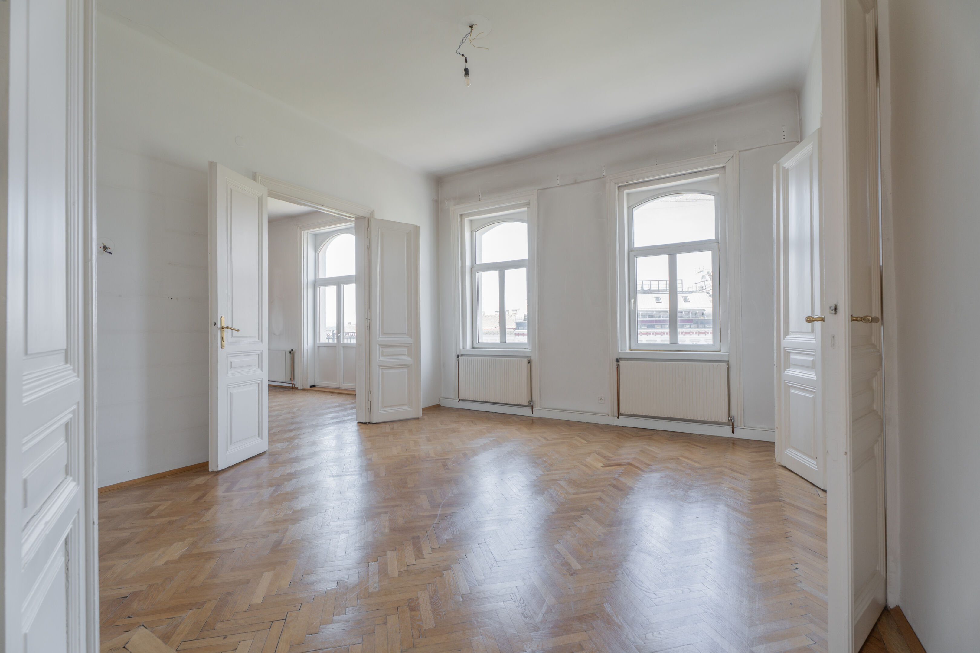 Die charakteristischen Elemente der Jahrhundertwende-Architektur – hohe Räume, Fischgrätparkett, Flügeltüren – sind teilweise erhalten und unterstreichen den einzigartigen Stil des Hauses.
