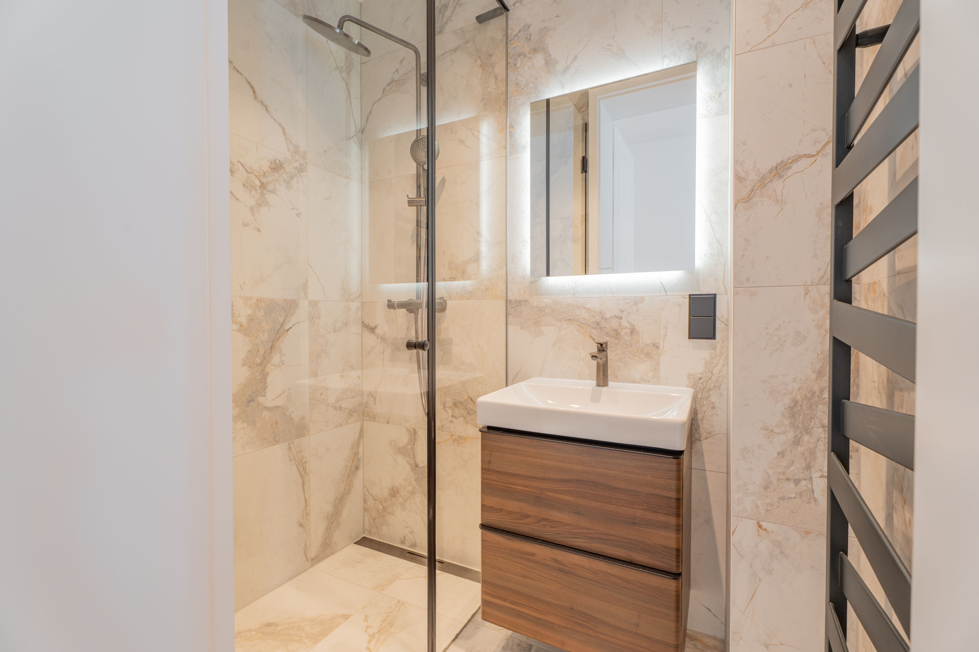 - Zweites Badezimmer mit bodengleicher Dusche und Waschtisch