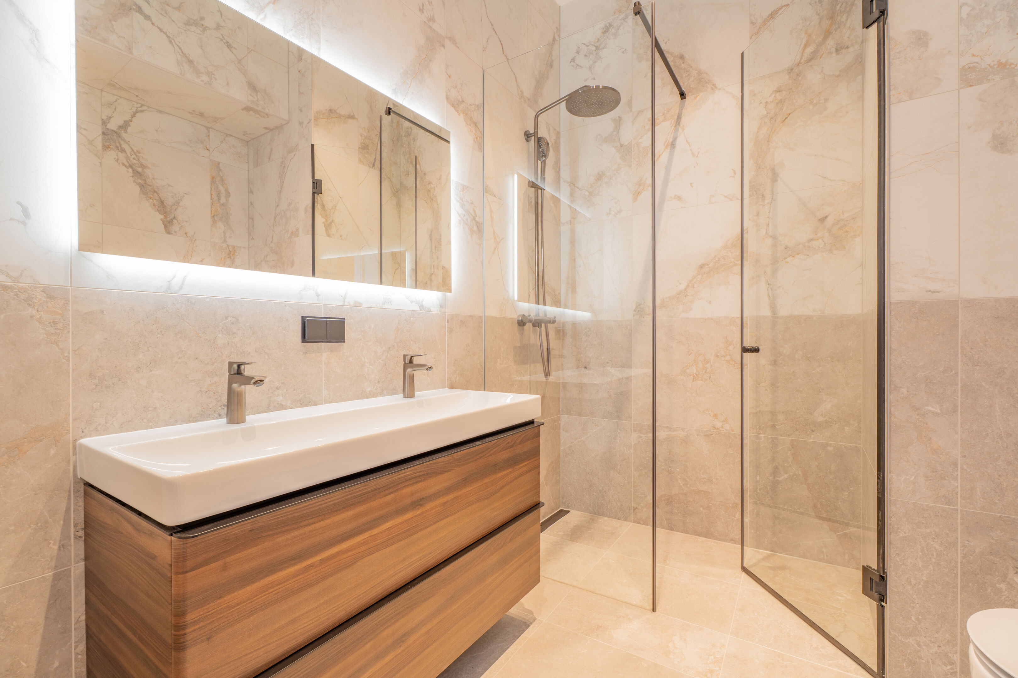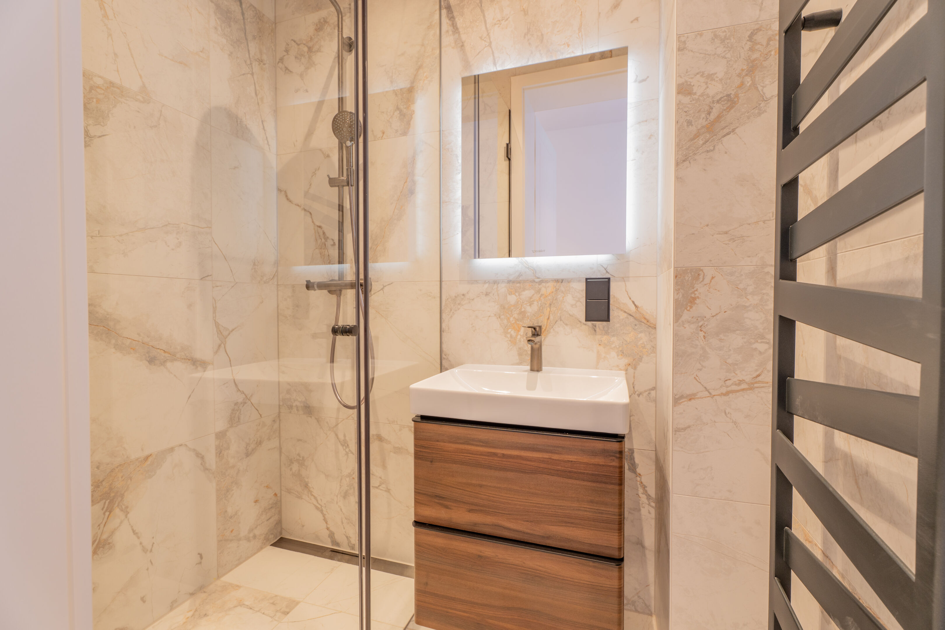 - Zweites Badezimmer mit bodengleicher Dusche und Waschtisch